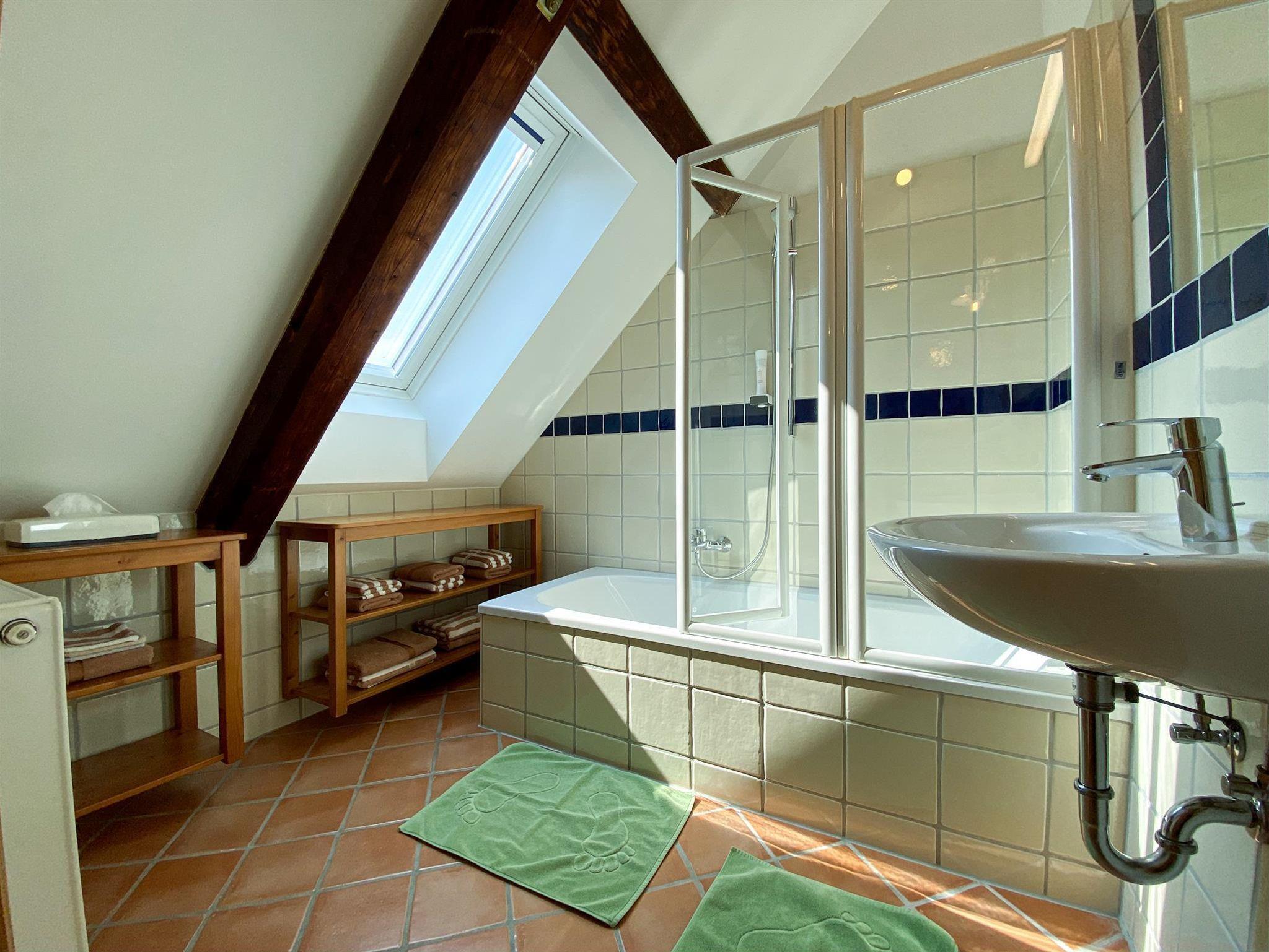 Unsere größte Wohnung mit 2 Schlafzimmern, mit sichtbarem bis in den Spitzboden offenen alten Dachstuhl, tischlergefertigten Vollholzmöbel und geölten Lärchenböden.