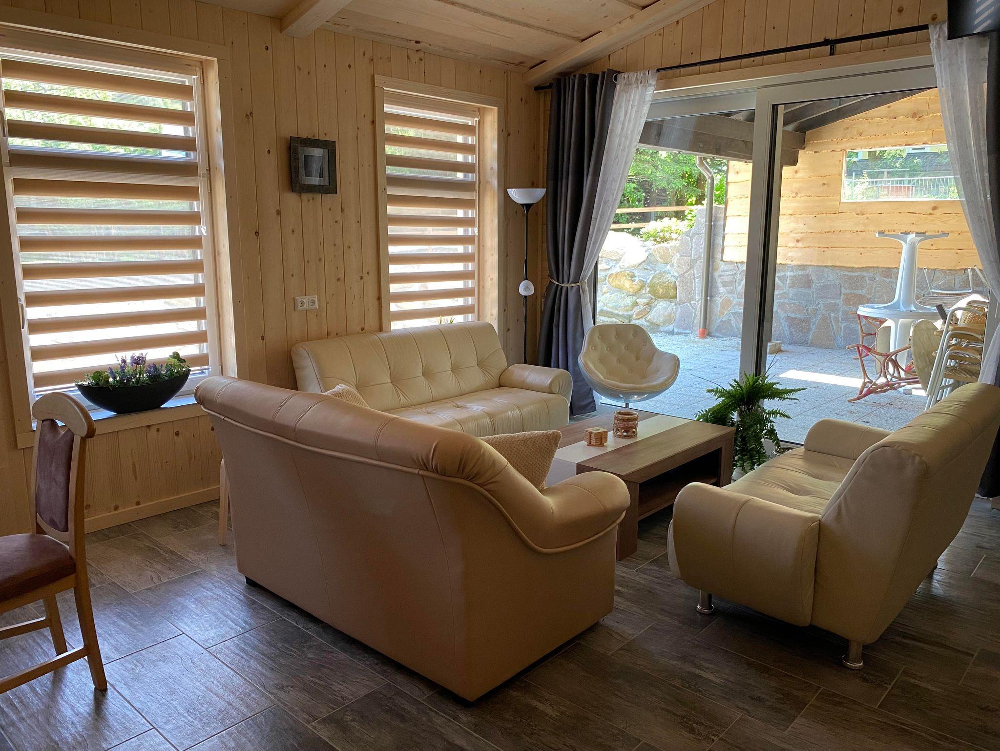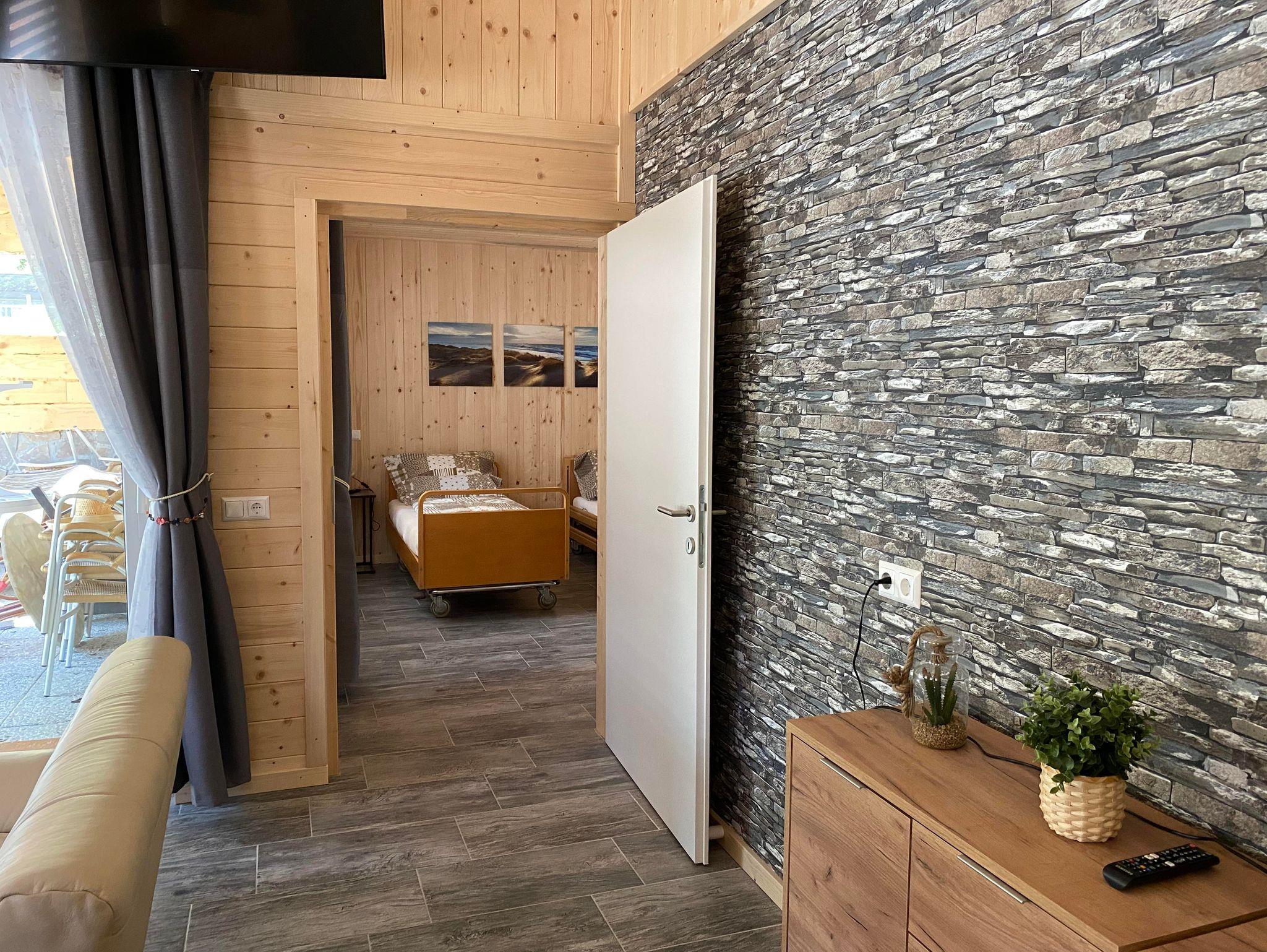 Behindertengerechte Barrierefreie Bungalow unter 1 Dach mit Bungalow 3. Diese können auf Wunsch mit einander verbunden werden mittels Türen und bieten somit dann statt an 6 Personen, an 12 Personen unterkunft. In diese beide Bungalows sind die Räumlichkeiten gespiegeld von einander. Beide sind gleich groß. Beide haben ein Behindertengerechtes Schlafzimmer mit Badezimmer. Weiters gibt es jeweils ein Stockbettzimmer und ein Doppelzimmer (eventuell mit extra Schlafcouch). Auch sind jeweils noch ein extra Badezimmer und extra WC im gebäude. Bungalow 2 hat eine offene überdachte Terrasse und Bungalow 3 hat ein geschlossene Terrasse. Geeignet für Sommer und Winter.