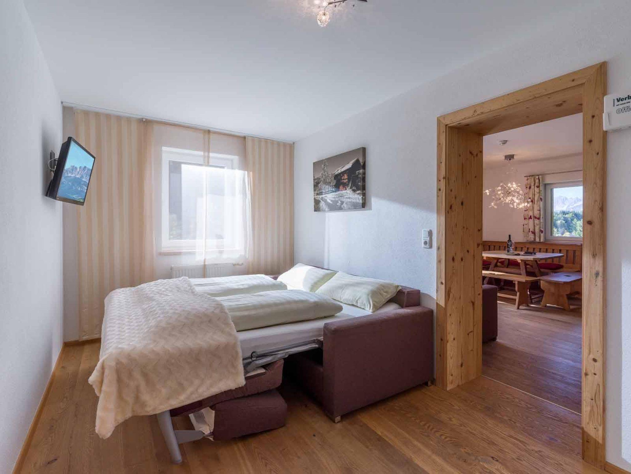 Kleines Schlafzimmer mit einem Couchbett und TV für 2 Personen.