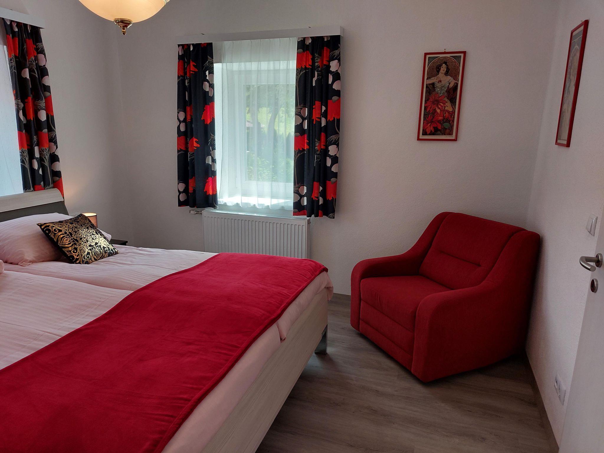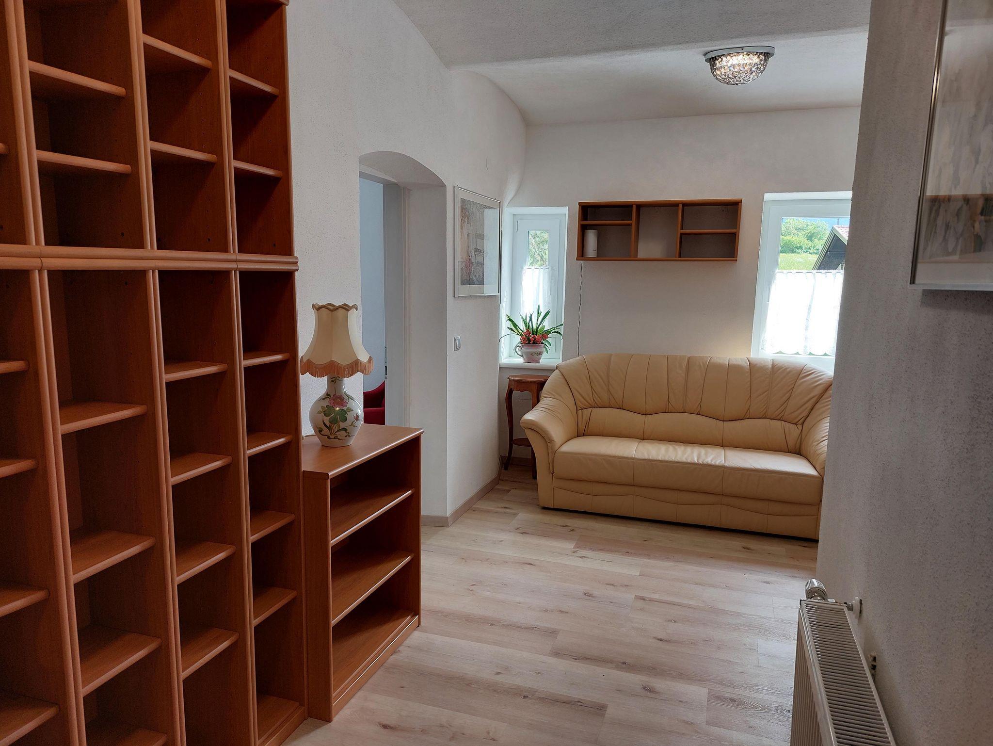 Die Ferienwohnung 1 mit 95 m² befindet sich im zweiten Stock mit separaten Zugang (Außenstiege) und hat einen kleinen Balkon mit Tisch und Sessel.