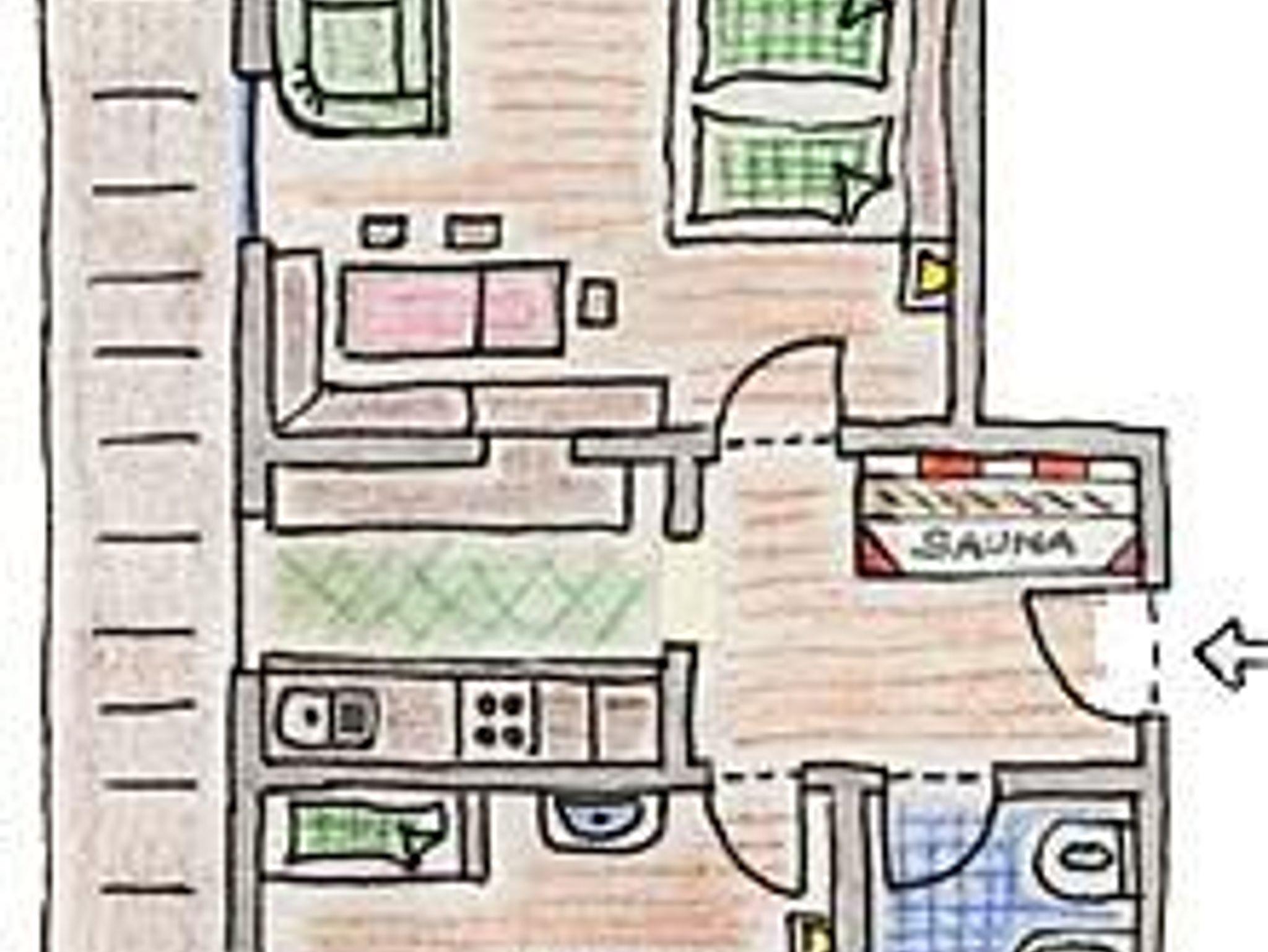 Ideal für 2-4 Personen: 1 Doppelzimmer, 1 Wohn/Schlafraum mit Couch und Essecke, 1 Badezimmer mit Dusche/WC & Föhn, komplett ausgestattete Küche mit Cerankochfeld inkl. Backofen, Geschirrspüler, Kühlschrank mit Gefriermöglichkeit, Mixer, Toaster, Wasserkocher, Kaffeemaschine, gratis W-Lan, Sat-TV & Radio, eine Infrarot-Wärmekabine, Balkon mit traumhafter Aussicht