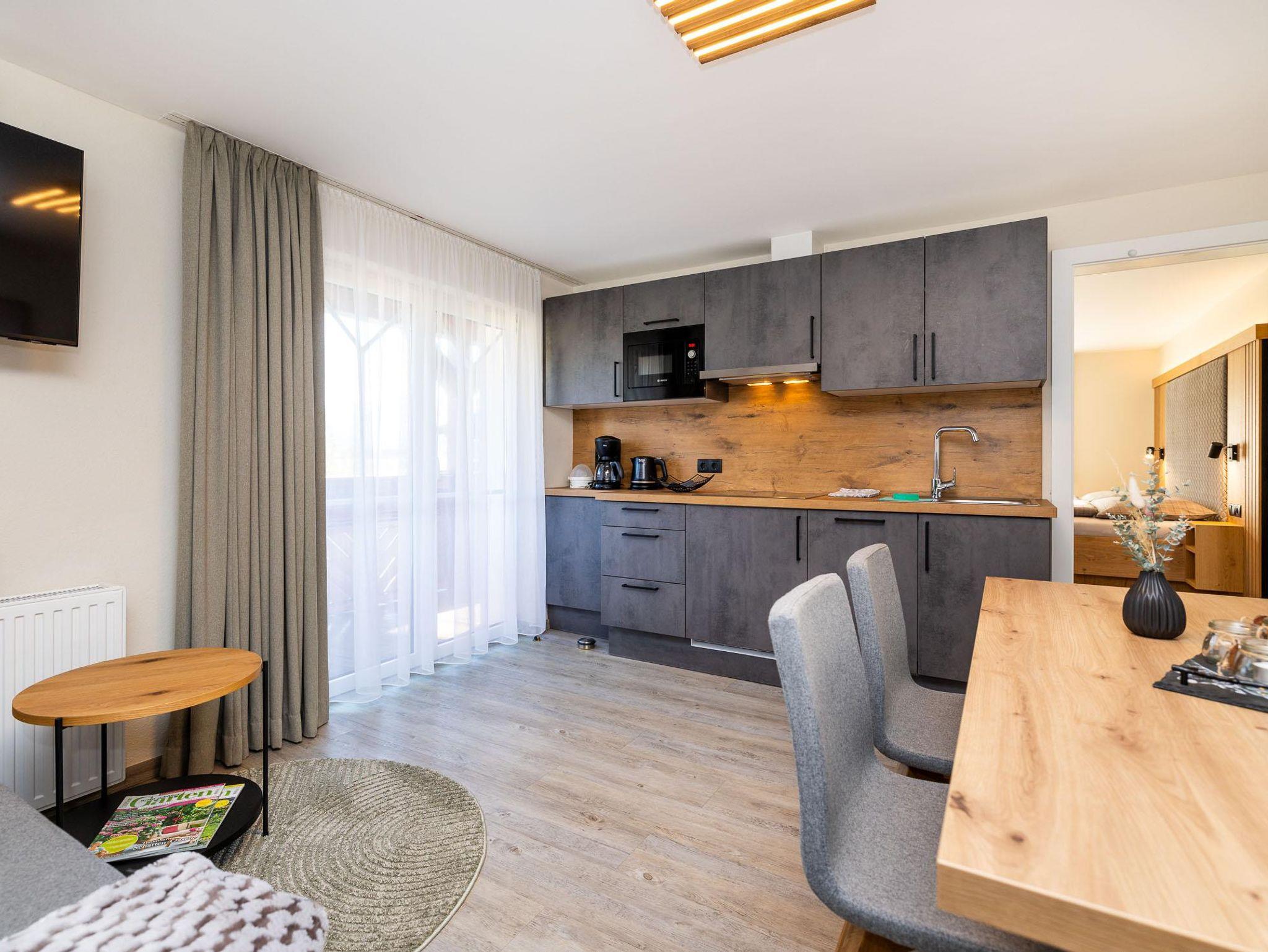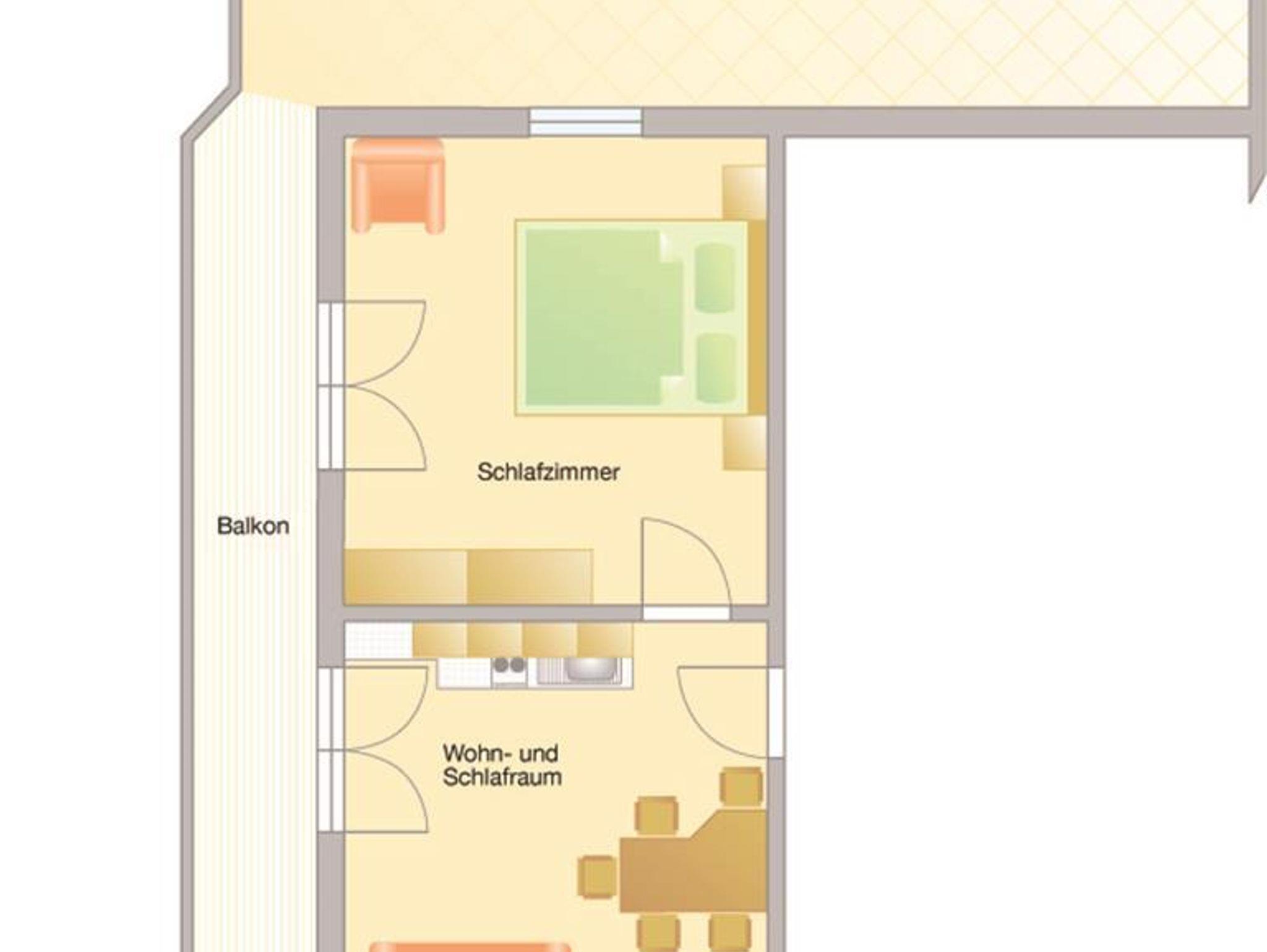 Gemütlich ausgestattetes Appartement mit Balkon (Süd-Osten) und einer großen Terrasse (Süd-Westen) und Terrassenmöbel. Toilette getrennt vom Badezimmer. Im Anschluss steht bei Bedarf ein Doppelzimmer (DU und WC) als zweiter Schlafraum zur Verfügung.