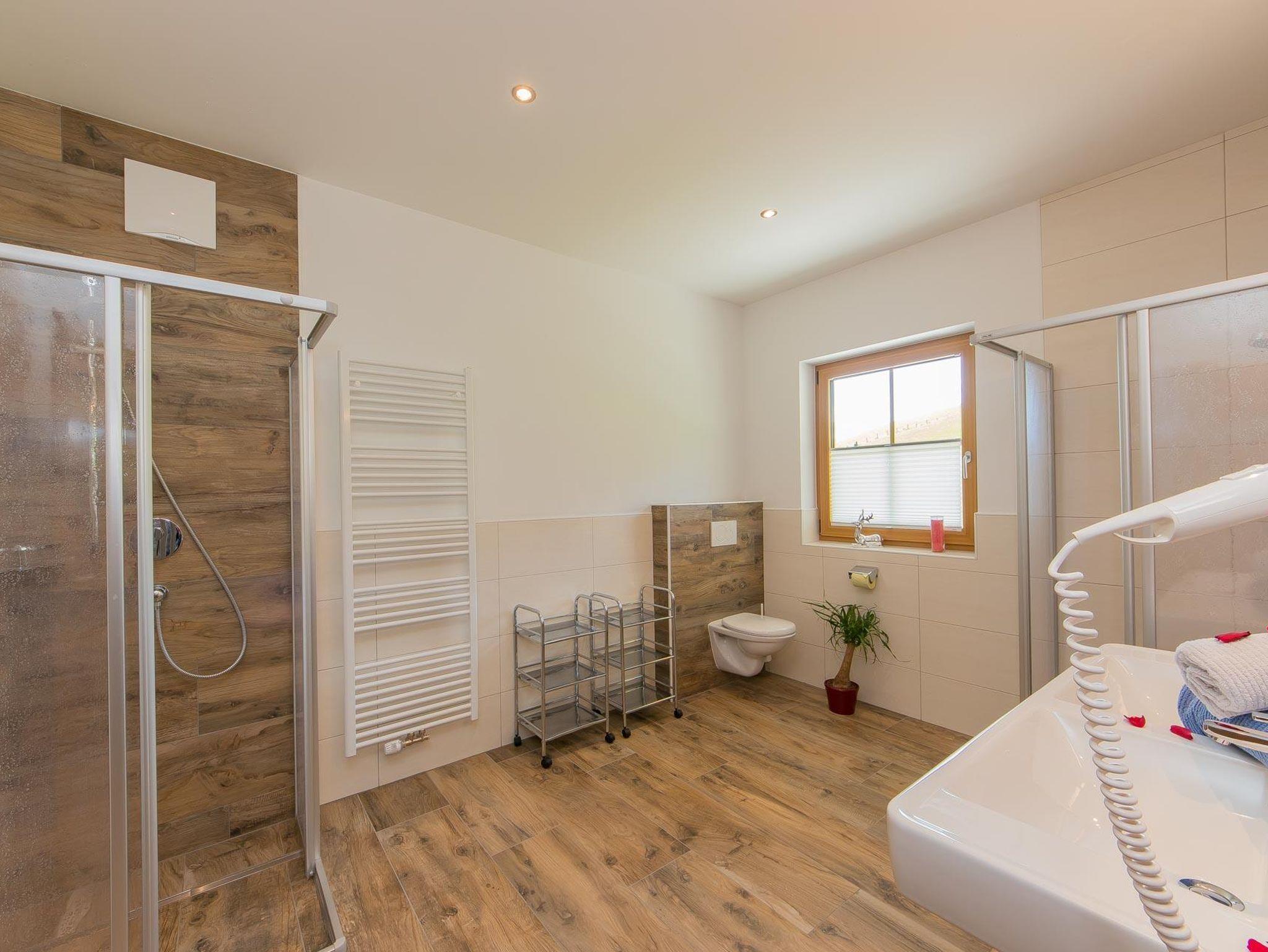 • Bad mit Doppeldusche, Doppelwaschbecken, WC & Fön