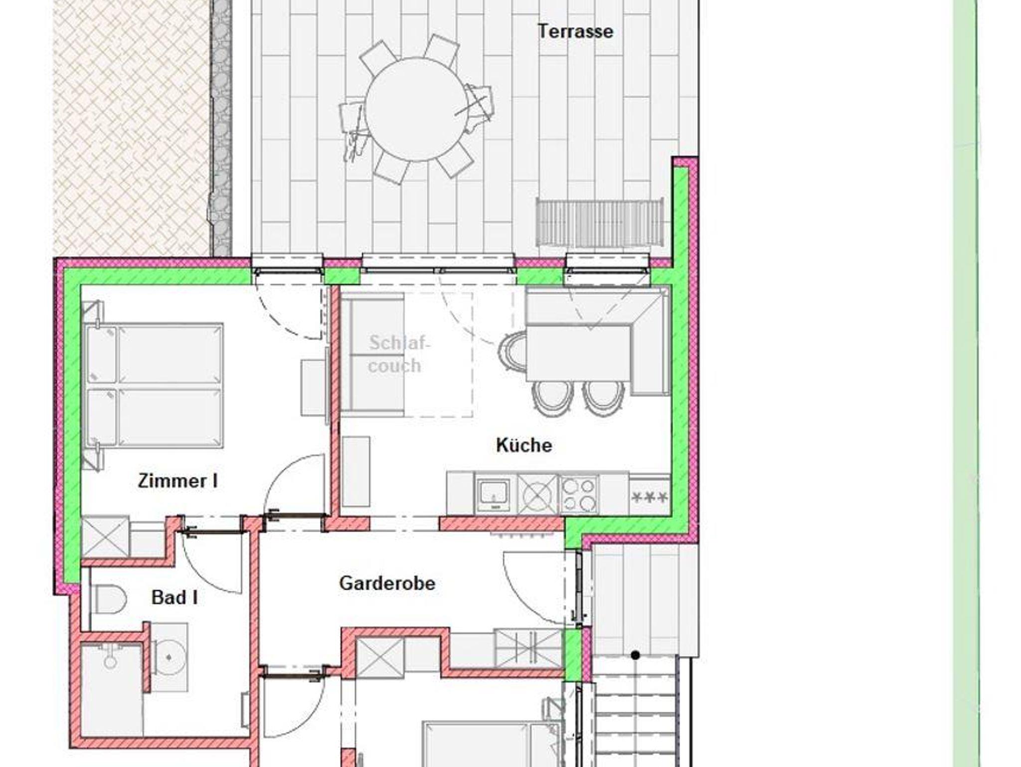 Appartem. 4-7 Pers.: mit 2 Schlafräumen 1 Doppel- und 1 Dreibettzimmer mit jeweils DU/WC, Haarfön, Safe, Flat-TV, Wohnküche komplett ausgestattet mit allem Zubehör. Sofa mit Schlafmöglichkeit für 2 weitere Personen. Terrasse mit Garten, Gartenmöbel.