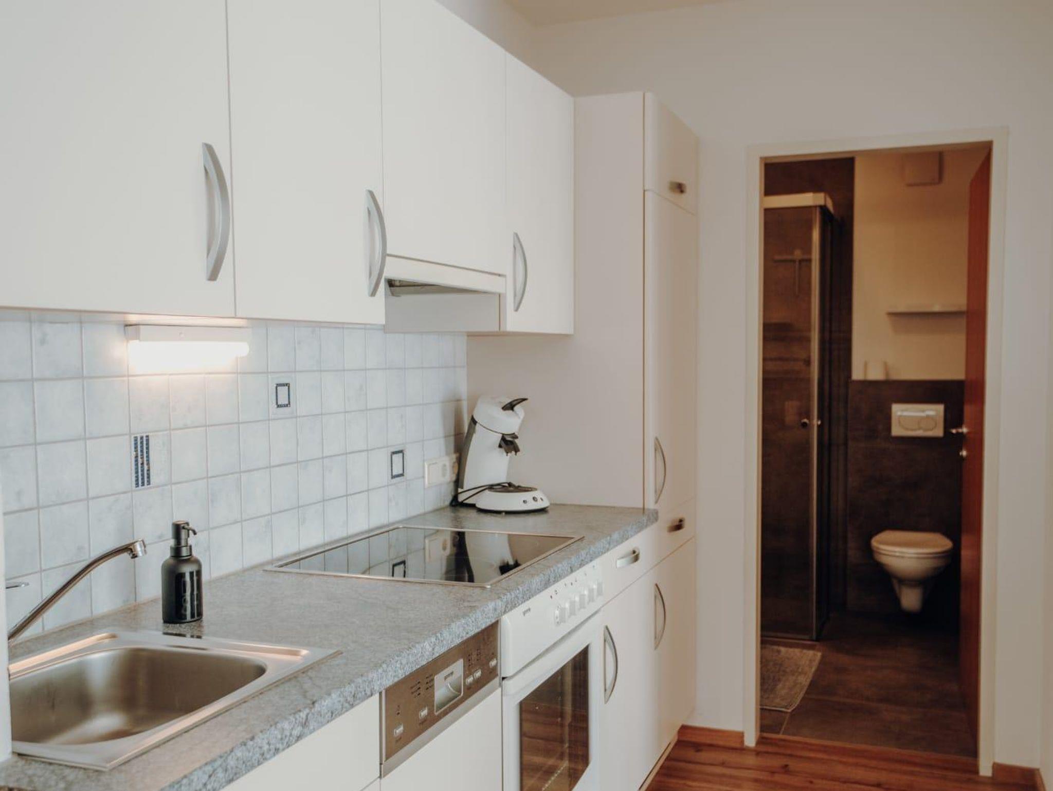 Appartement im Erdgeschoss für 2-4 Personen 1 Schlafzimmer, 1 Wohn-Schlafraum mit ausziehbarer Doppelcouch, Komplett ausgestattete Küche (Mikrowelle, Elektroherd mit Backrohr, Kaffeemaschine, Geschirrspüler) SAT-TV, Radio, Dusche und WC, Föhn