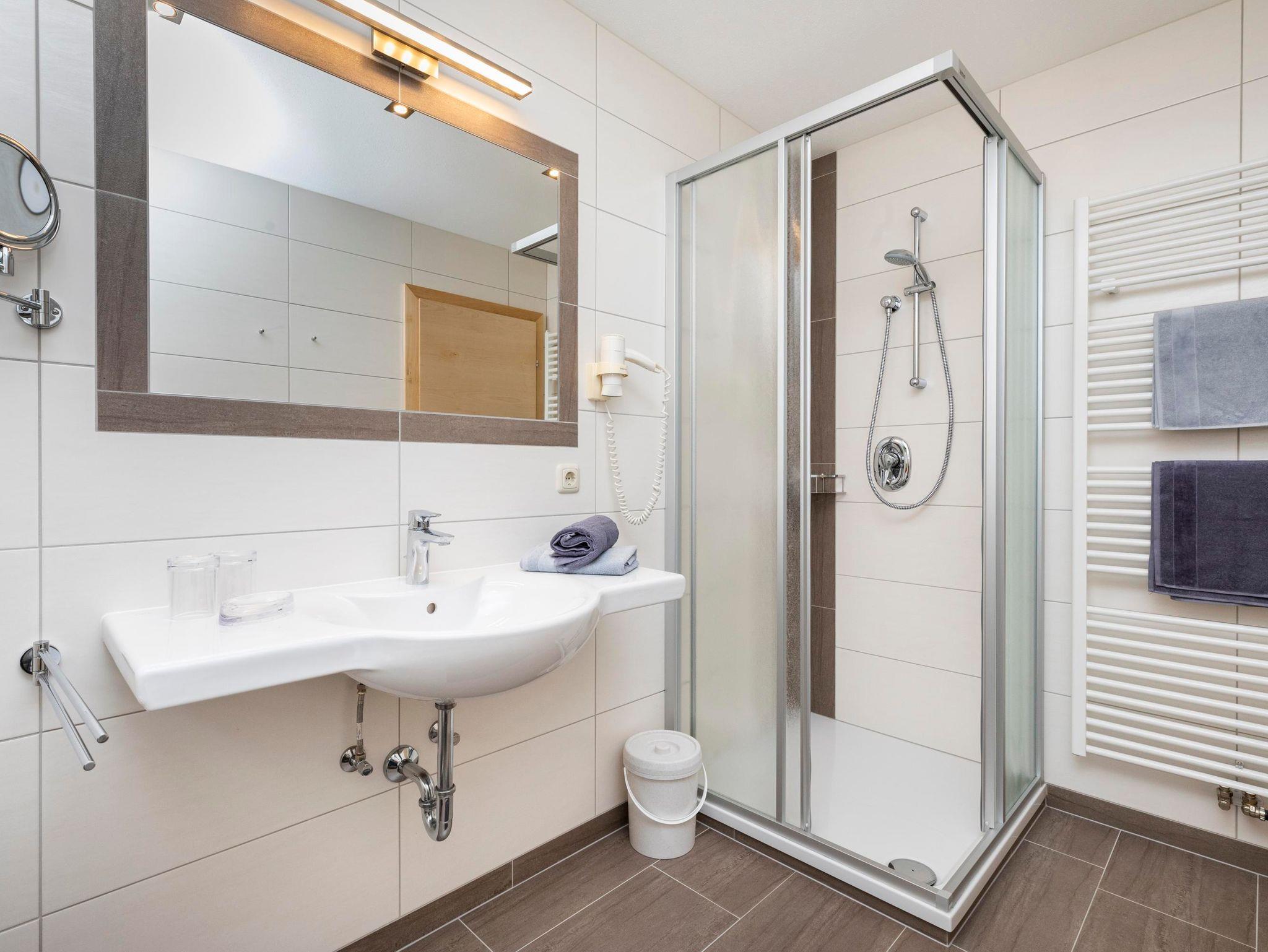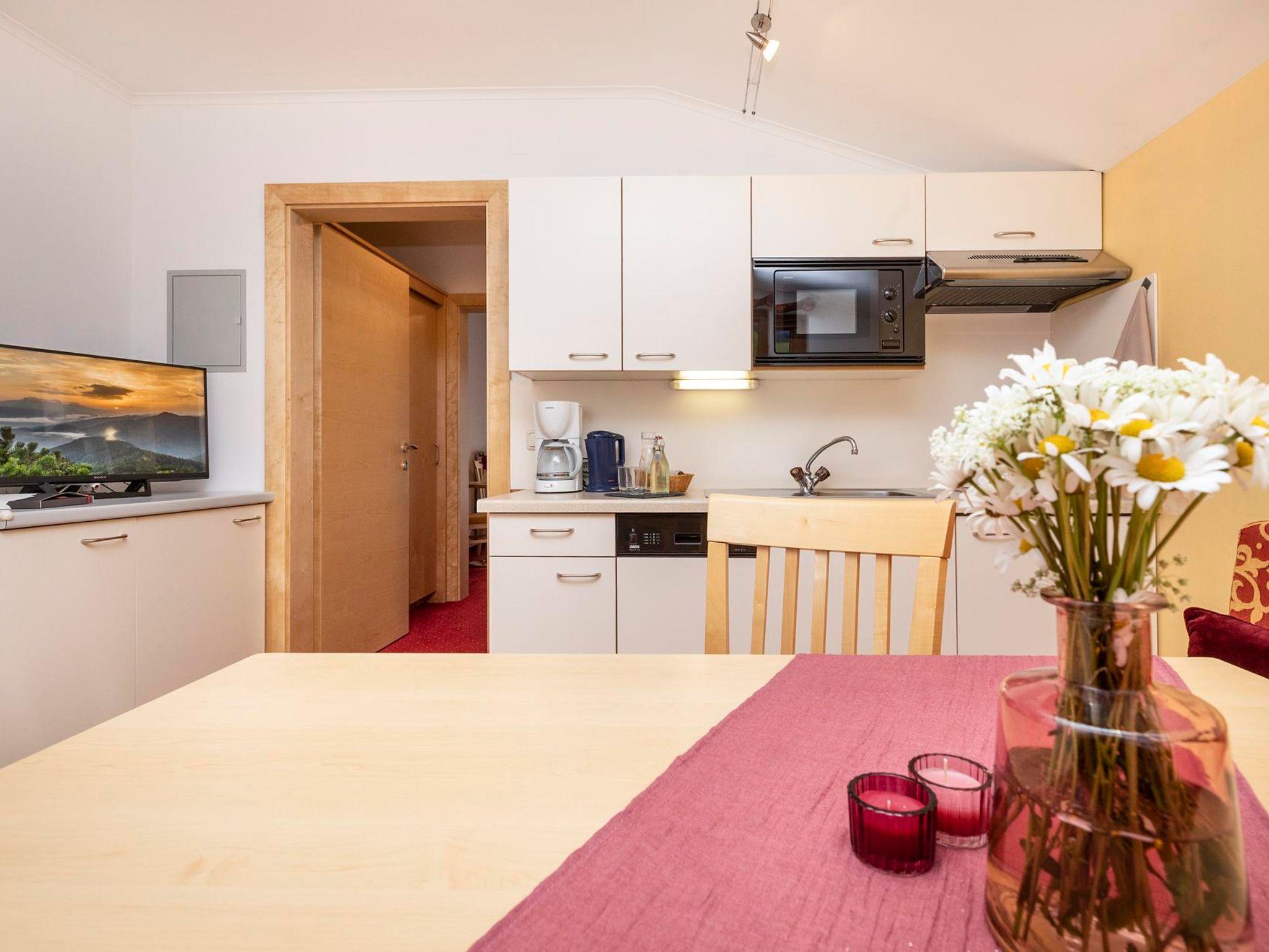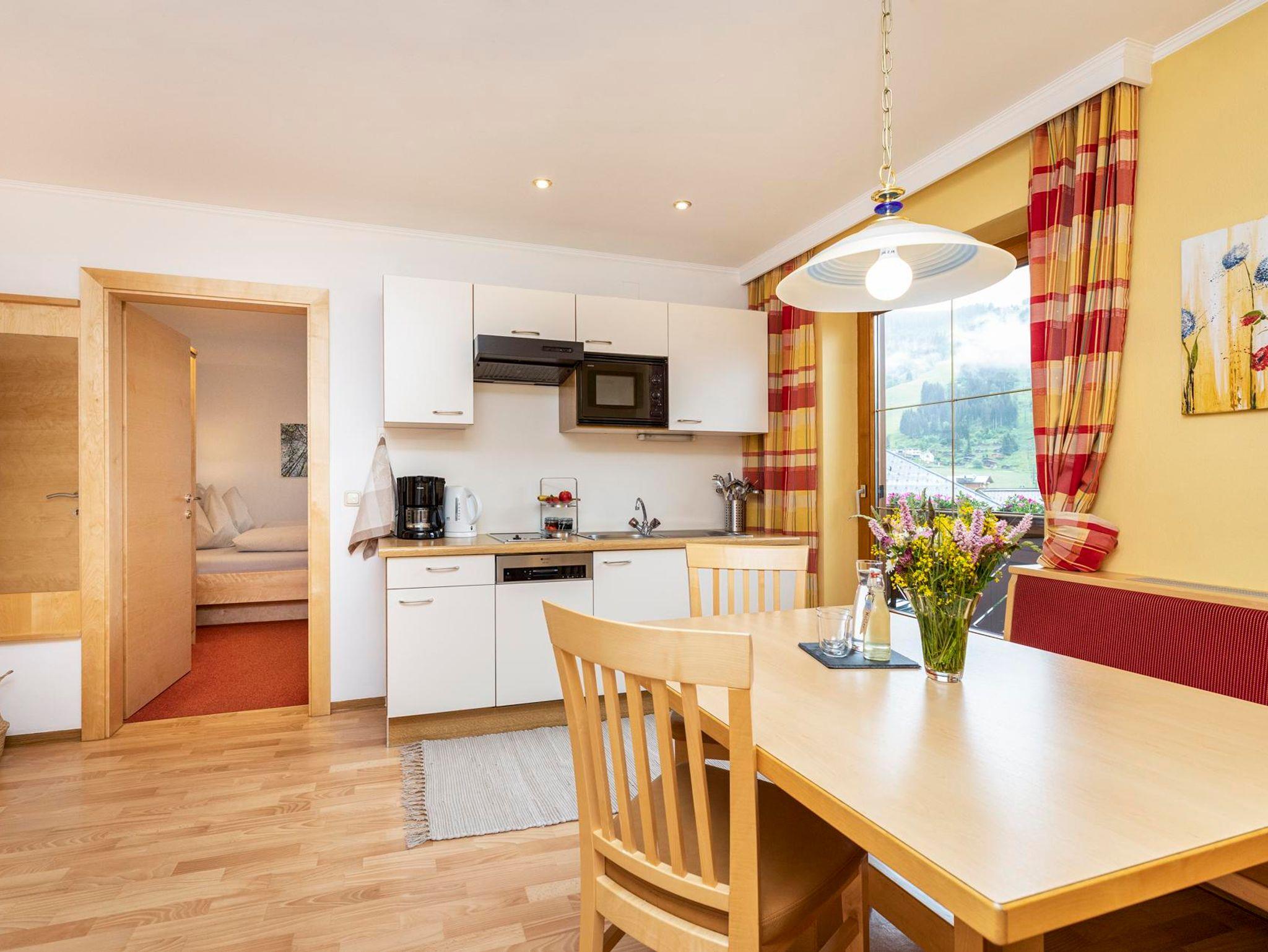 Appartem. TYP B : 4 Pers. (51m2) Bergluft: 2 Schlafz. jeweils extra mit DU/WC und Balkon, Fön, Zimmersafe und TV. Wohnküche mit Flat-TV, Geschirrspüler, Spüle, Cerankochfeld, Mikrowelle/Grillf., Kühlschrank, Toaster, Wasserkocher, Kaffeem., Balkon