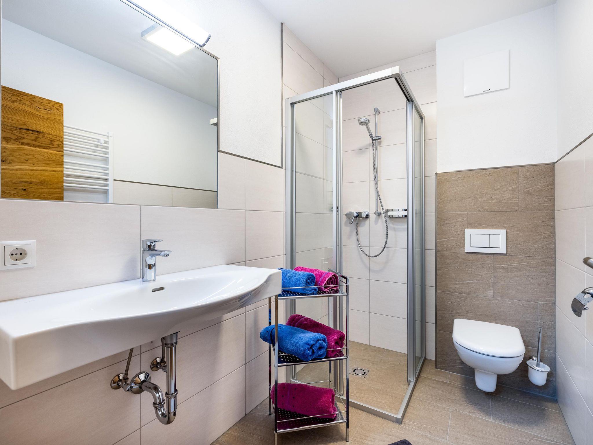 • 3 Badezimmer mit Waschbecken, WC, Dusche, Handtuchtrockner und Haarföhn