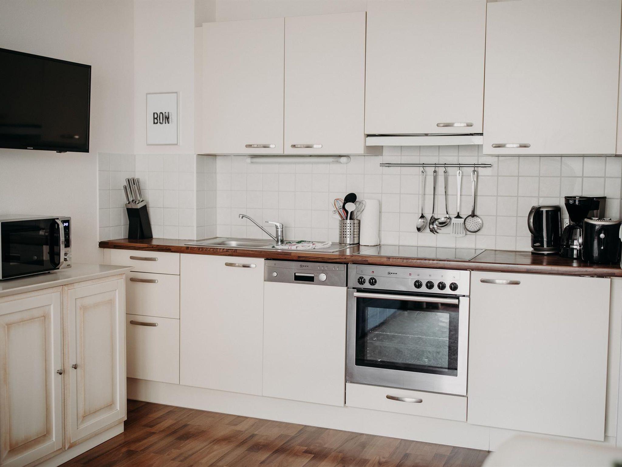 2 Schlafzimmer, 2 Bäder, Wohnschlafraum mit Schlafsofa | für 4 bis 6 Personen | Terrasse oder Balkon | Küchenbereich mit Geschirr, Backofen, 4 elektrische Herdplatten, Kühlschrank mit Gefrierfach, Geschirrspüler, Wasserkocher, Nespresso Maschine