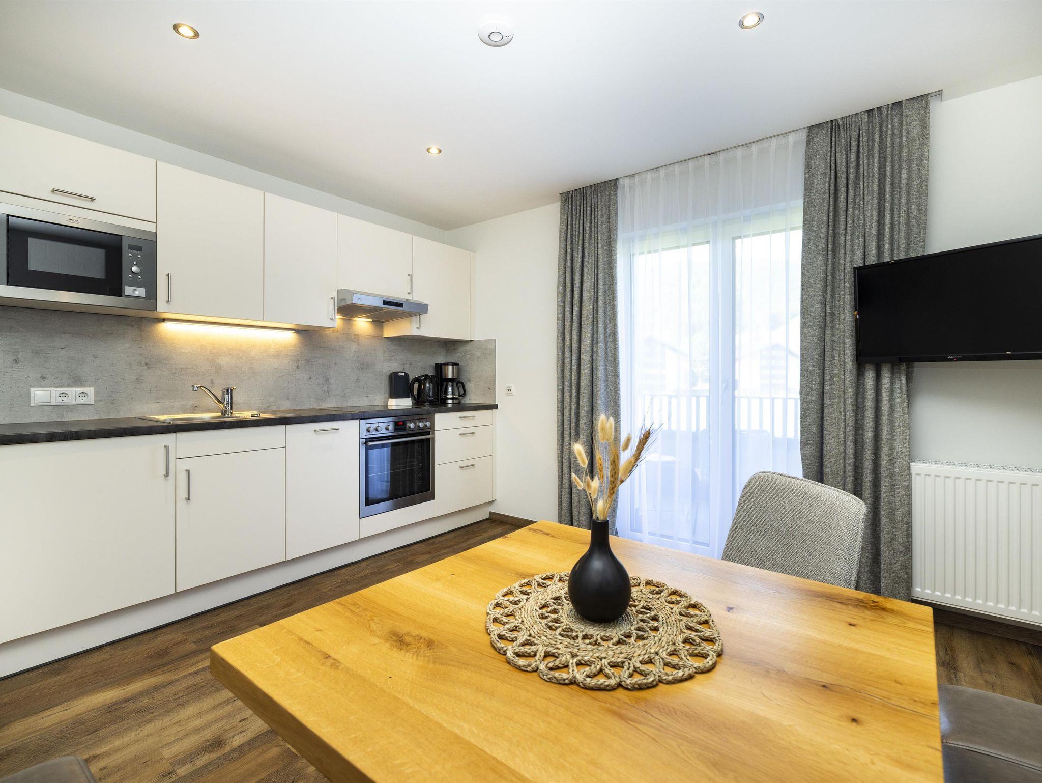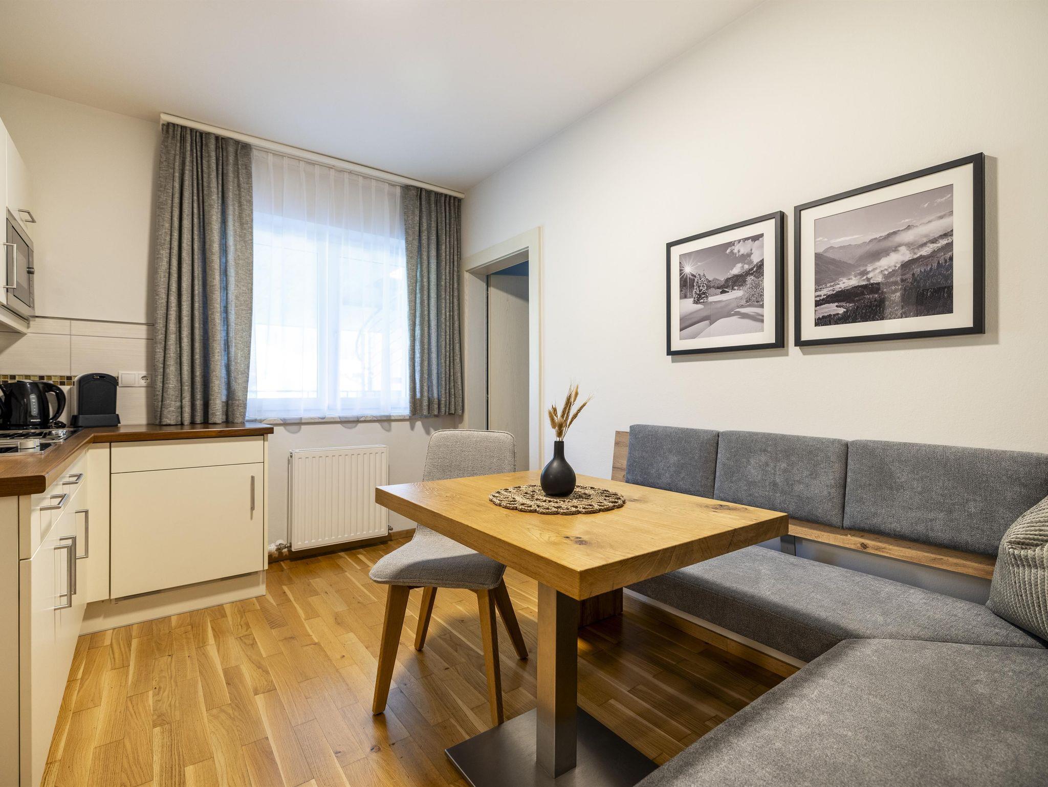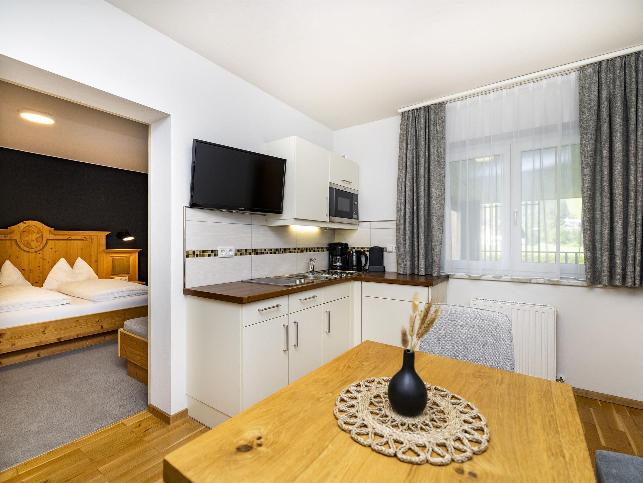 Das Typ A Superior (ca. 30 m²) ist ein zweiräumiges Appartement und eignet sich für zwei Erwachsene oder eine Familie mit einem Kind (Blick auf die Skipisten von Flachau, entweder mit Gartenterrasse oder teilweise Balkon). Es verfügt über ein Doppelbett, ein Extrabett, einen separaten Wohnbereich mit Küchenzeile und Sitzgarnitur, ein Badezimmer mit Dusche und WC, kostenlosen Zugang zu WiFi, einen Zimmersafe sowie Kabel-TV.