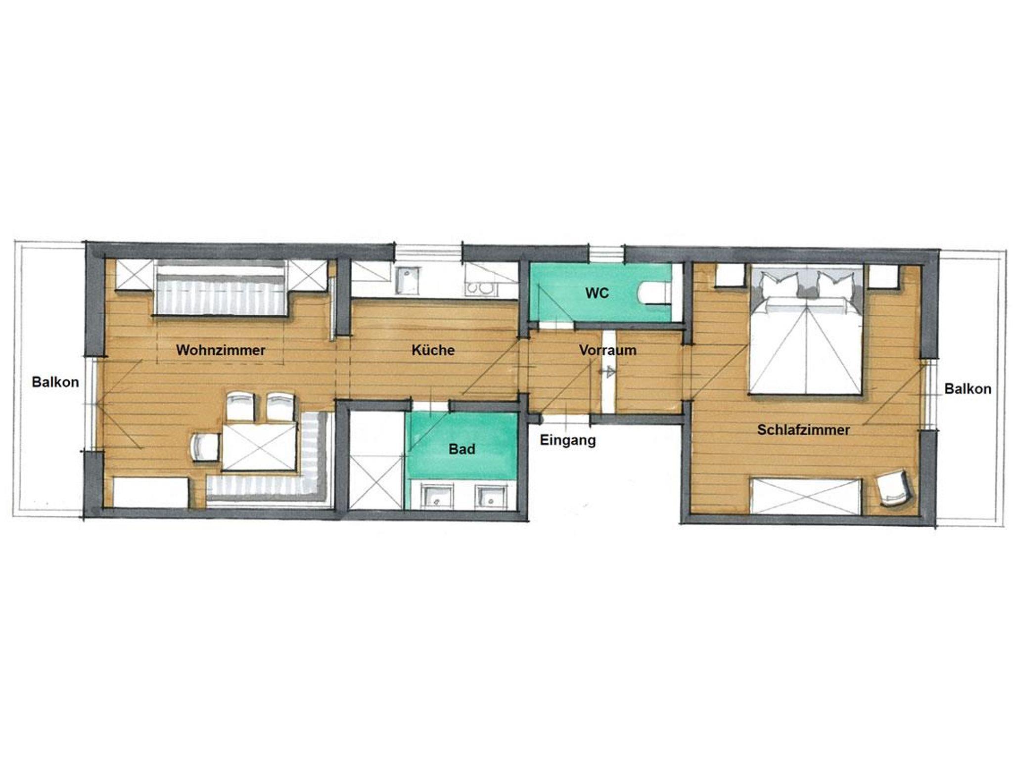 • Wohnbereich mit Balkon, klappbarem Doppelbett und Schiebetüre