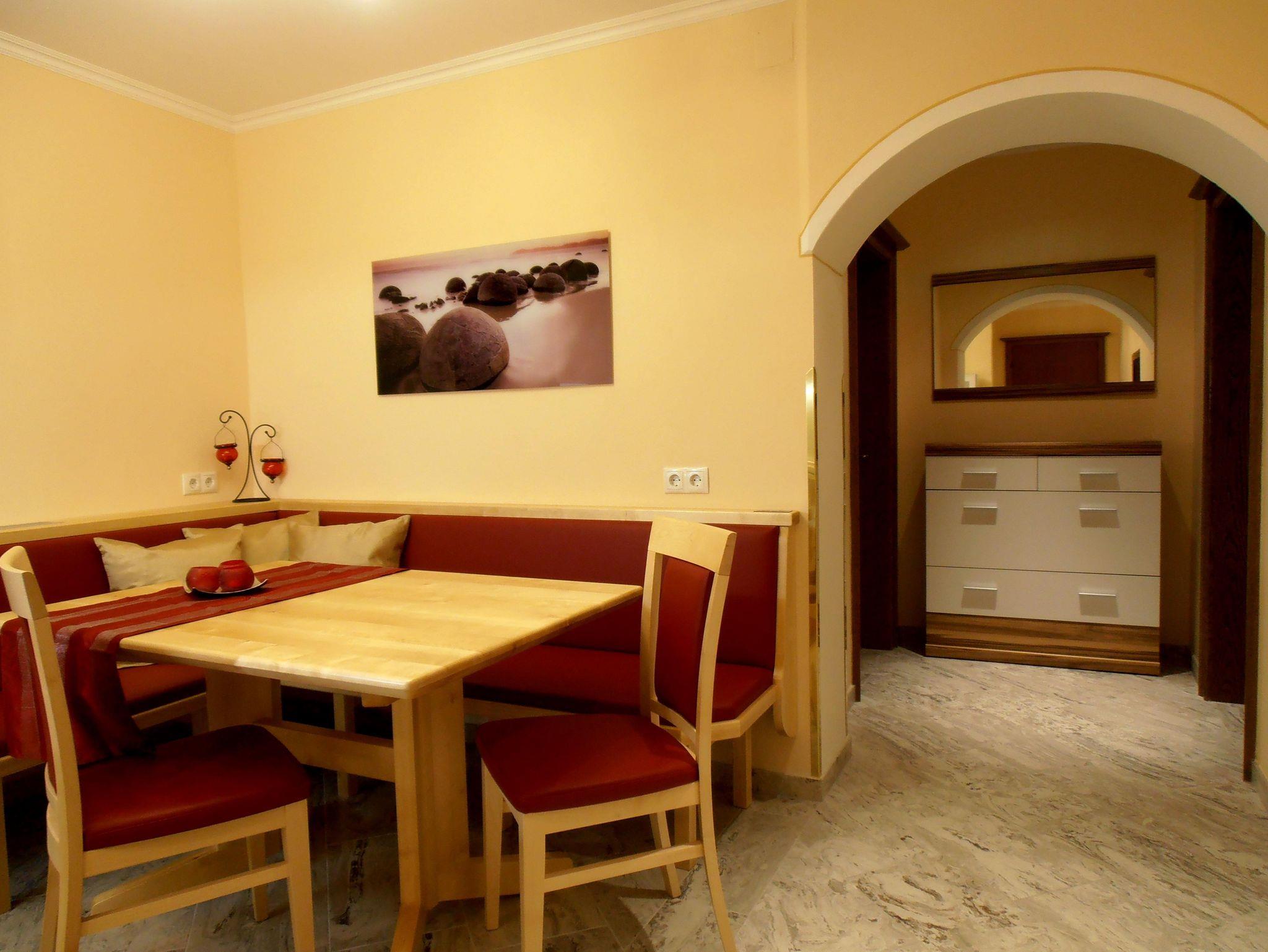Das Appartement besteht aus zwei Schlafzimmern, jeweils mit Dusche/WC, Kabel-TV, WLAN und einer gemütlichen Wohnküche mit Balkon, einer voll ausgestatteten Küchenzeile und einer Essecke.