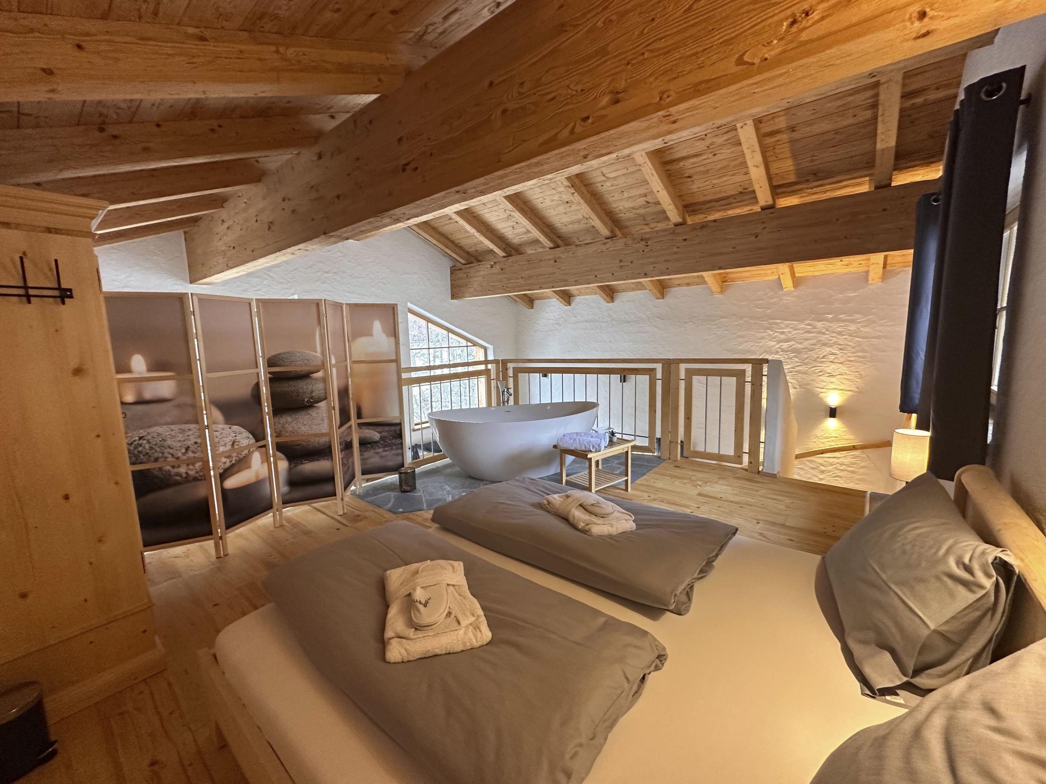 Our highlight: a free-standing whirlpool bath awaits you in the open sleeping gallery - your private place to switch off and enjoy. A second bedroom on the ground floor provides additional comfort for family or friends who are travelling together but value their peace and quiet. The elegant bathroom made of natural stone fits perfectly into the overall picture - modern, clear and atmospheric.