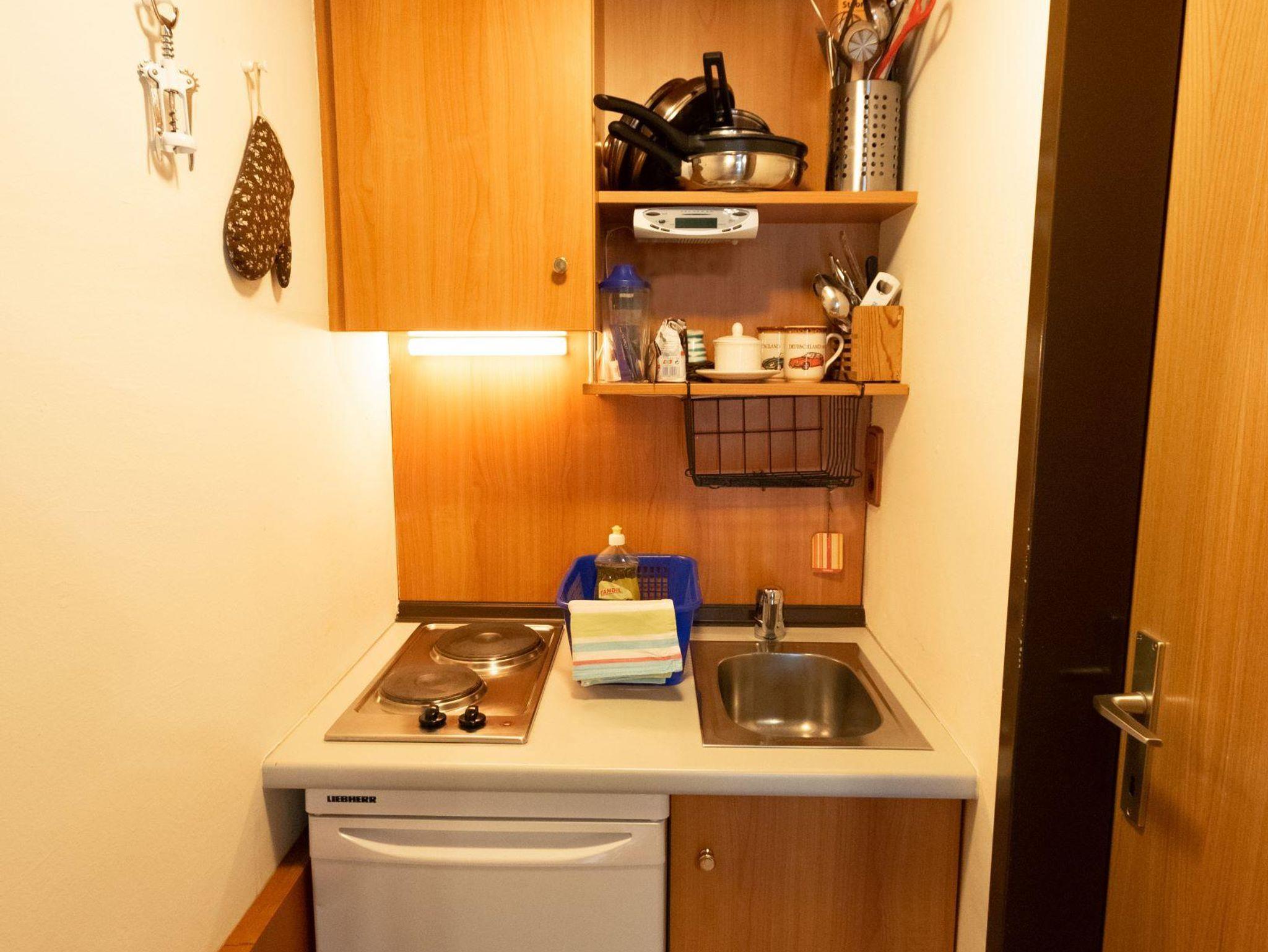 Das Studio besteht aus einem kombinierten Wohn-Schlafraum (1x Doppelbett für 2 Personen) mit einer Mini-Küche (ausgestattet mit Kaffeemaschine, Wasserkocher, Toaster, Mikrowelle, Kochplatte, Kühlschrank) und Flachbild-TV. Das Badezimmer verfügt über eine Dusche und WC (Föhn vorhanden). Überdachte Sitzmöglichkeit direkt vor dem Studio. Bettwäsche, Handtücher und Geschirrtücher werden kostenlos zur Verfügung gestellt. WLAN ist kostenlos verfügbar. Hauseigener Parkplatz direkt vor der Ferienwohnung.