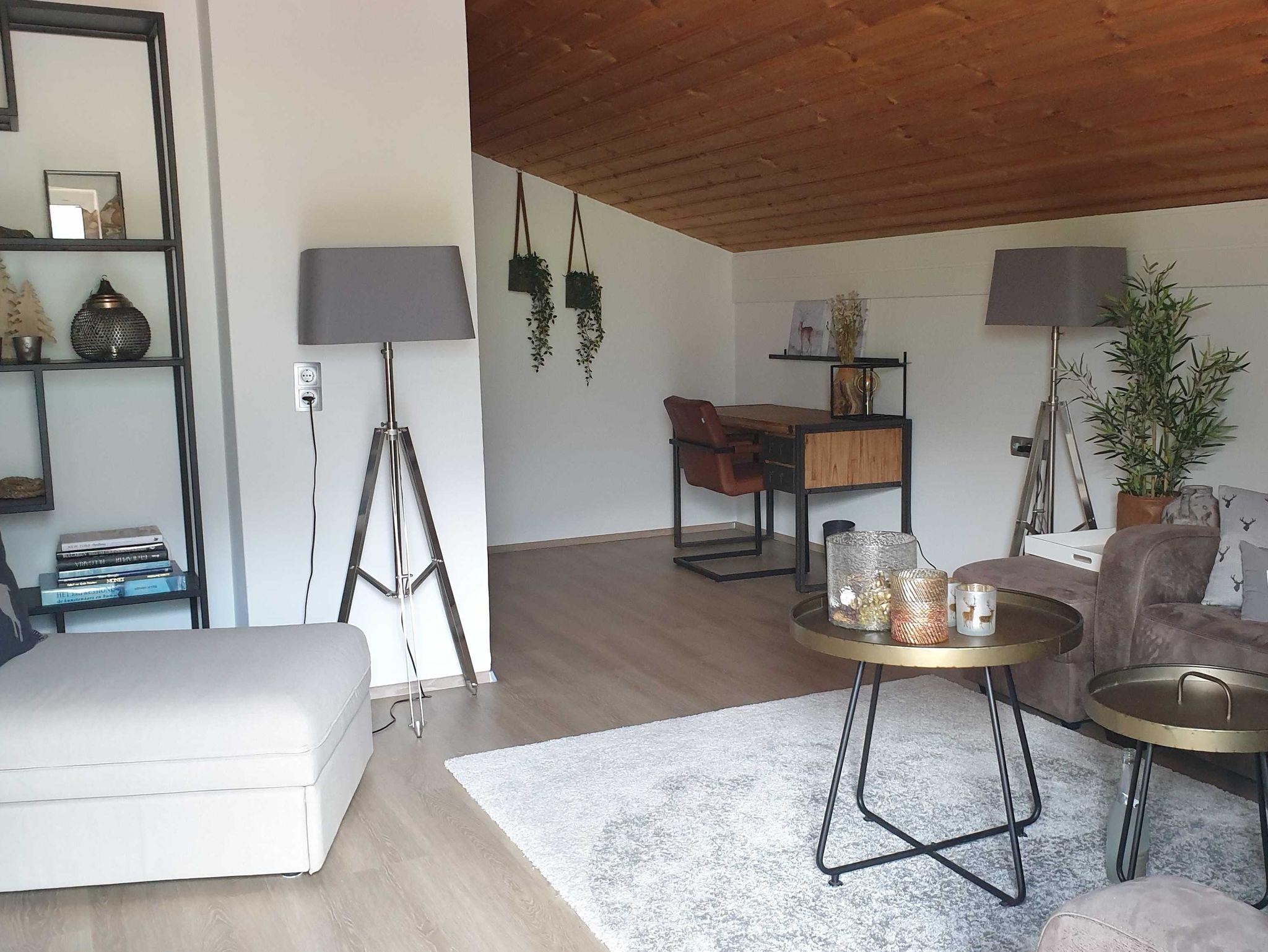Grosse Wohnzimmer mit gemütliche Sitzgruppe, Schreibtisch, elektrische Kamin und Smart-TV.