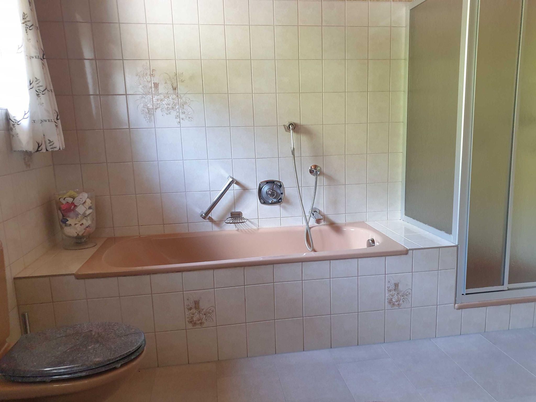 Grosses Badezimmer mit Bodenheizung, seperate Badewanne, Dusche und WC. Handtücher. Haartrockner. Toilettenpapier.Grosses Balkon mit Gartenmöbel und separate Terrasse mit Liegestühle, Essbereich und grossen Gasgrill.