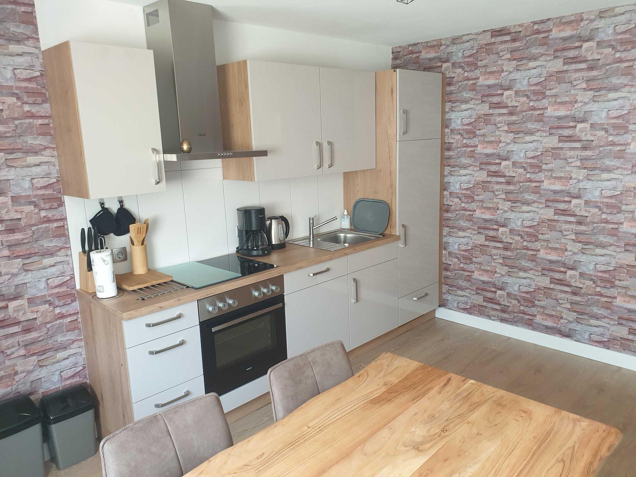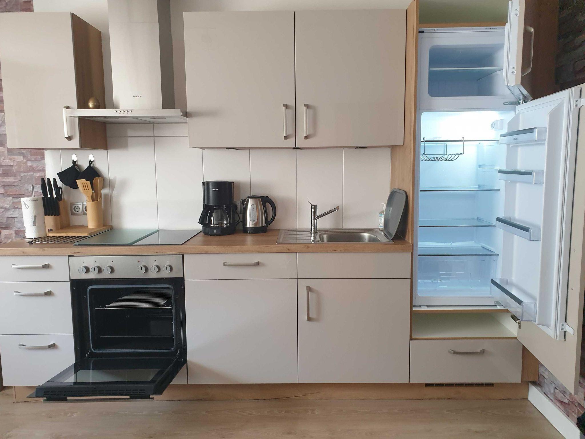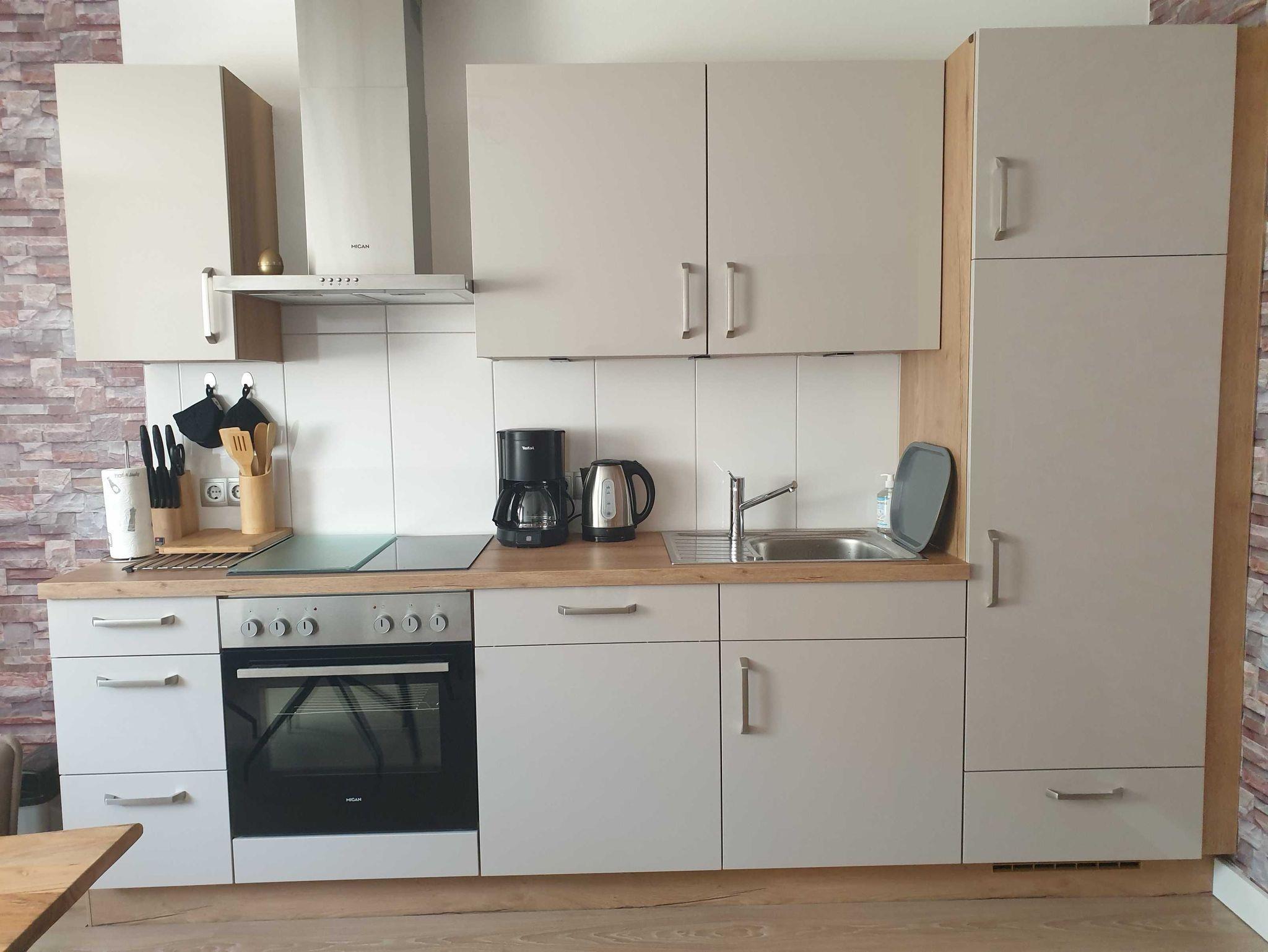Wohnküche mit gemütliche Eckbank, Küchenzeile mit Backofen, Herd, Kühl- und Gefrierschrank und Geschirrspüler. Kaffeeemaschine, WWasserkocher, Toaster und Küchenutensilien. Smart-TV. Schutzraum umgebaut als Aufenthaltsraum mit Sitz / Schlafsofa ( 120x190 ).