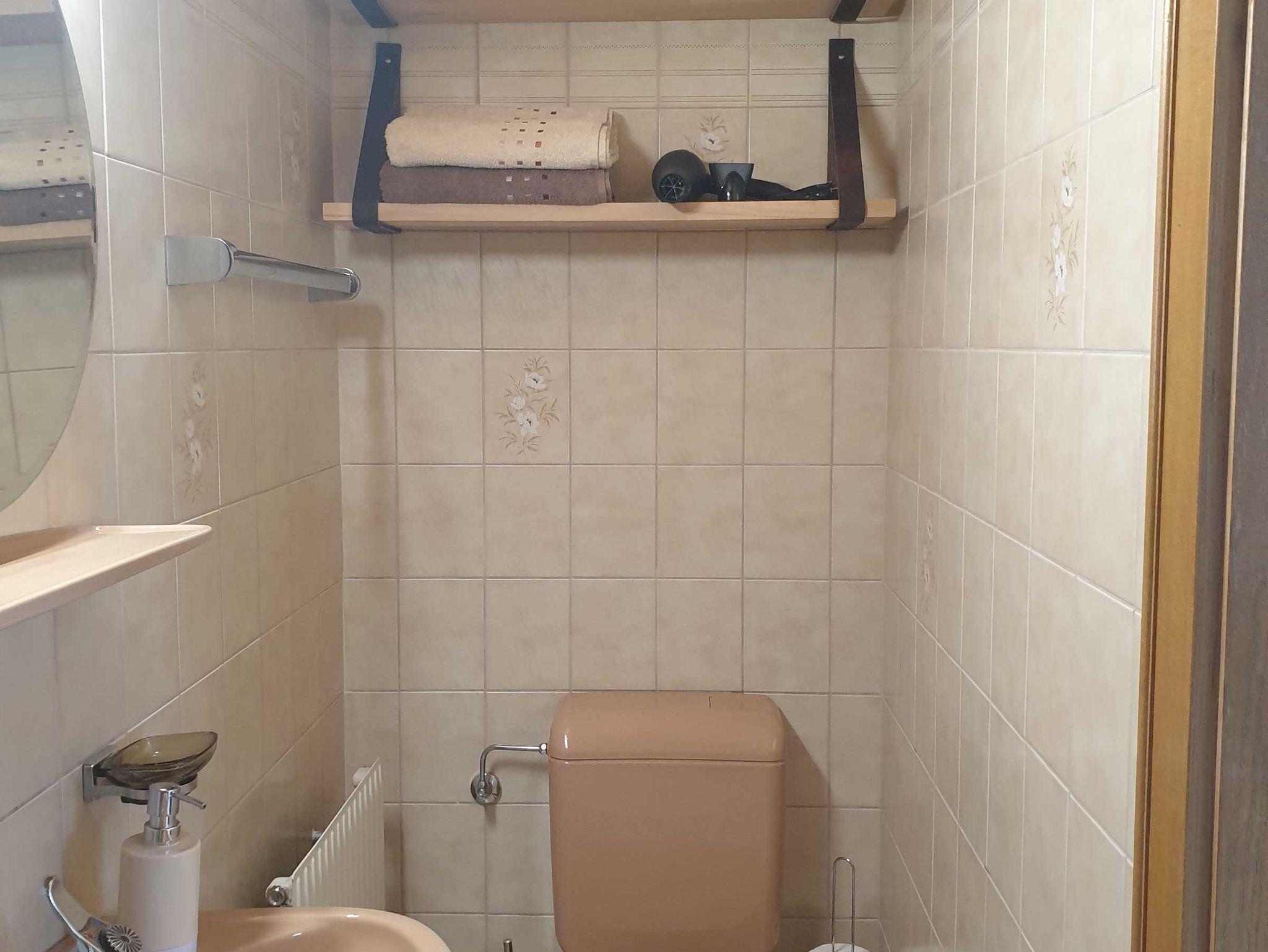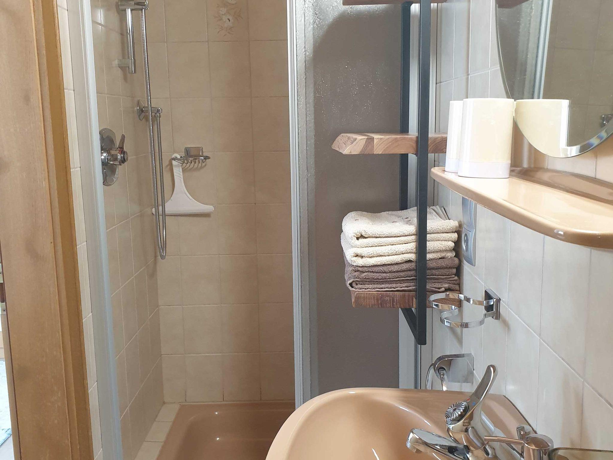 Angrenzend am Schlafzummer ein Badezimmer mit Dusche und WC. Handtücher. Haartrockner. Toilettenpapier.