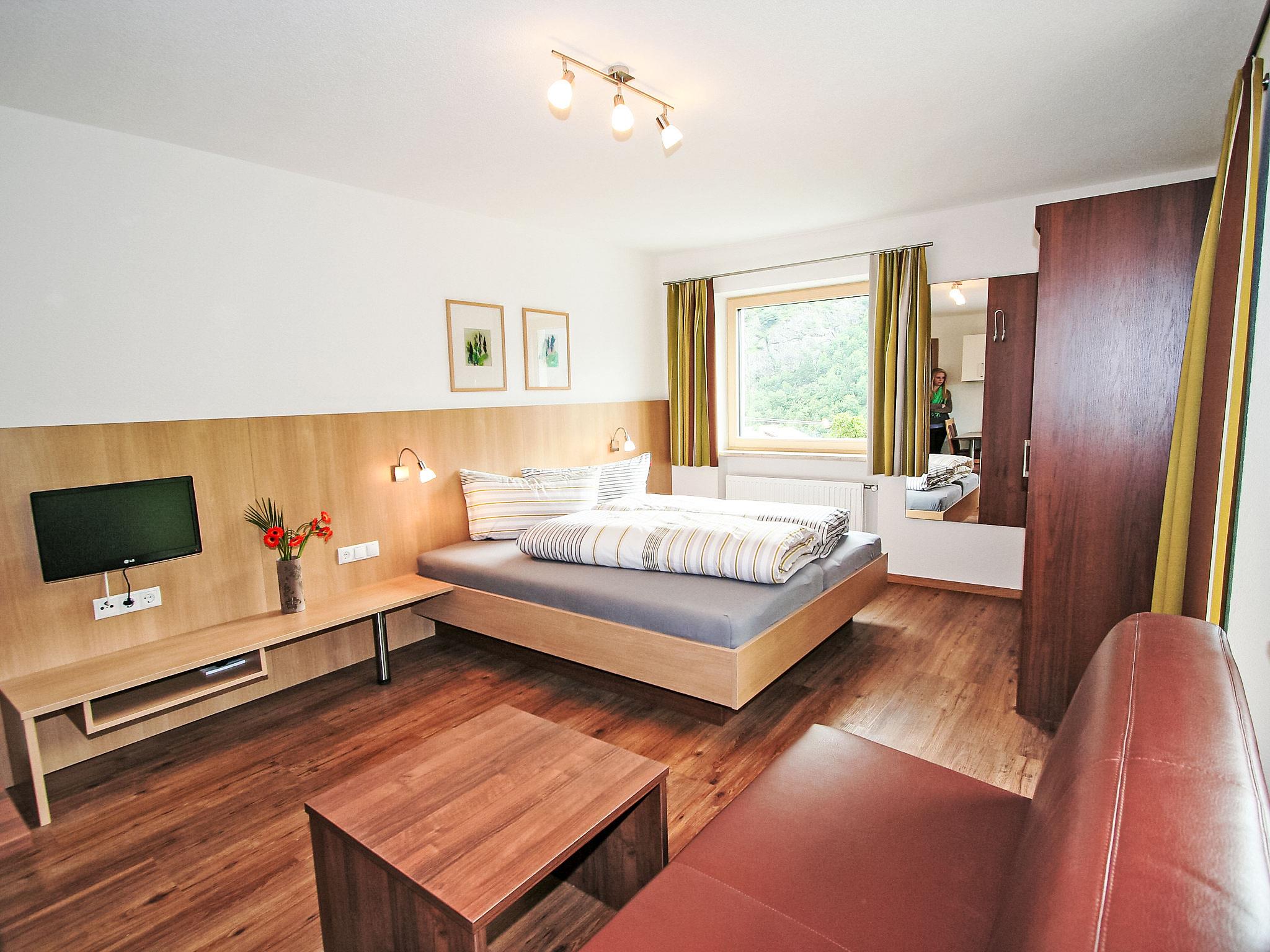 1-room apartment 25 m2 on 2nd floor. Modern and tasteful furnishings: living/sleeping room with 1 double bed and satellite TV (flat screen). Exit to the balcony. Kitchenette (dishwasher, 2 ceramic glass hob hotplates, microwave, electric coffee machine) with bar. Shower/WC. Balcony. Balcony furniture. View of the mountains and the countryside. Facilities: hair dryer. Internet (WiFi, free). Please note: non-smokers only. Maximum 1 small pet/ dog allowed. No oven available. No cat!