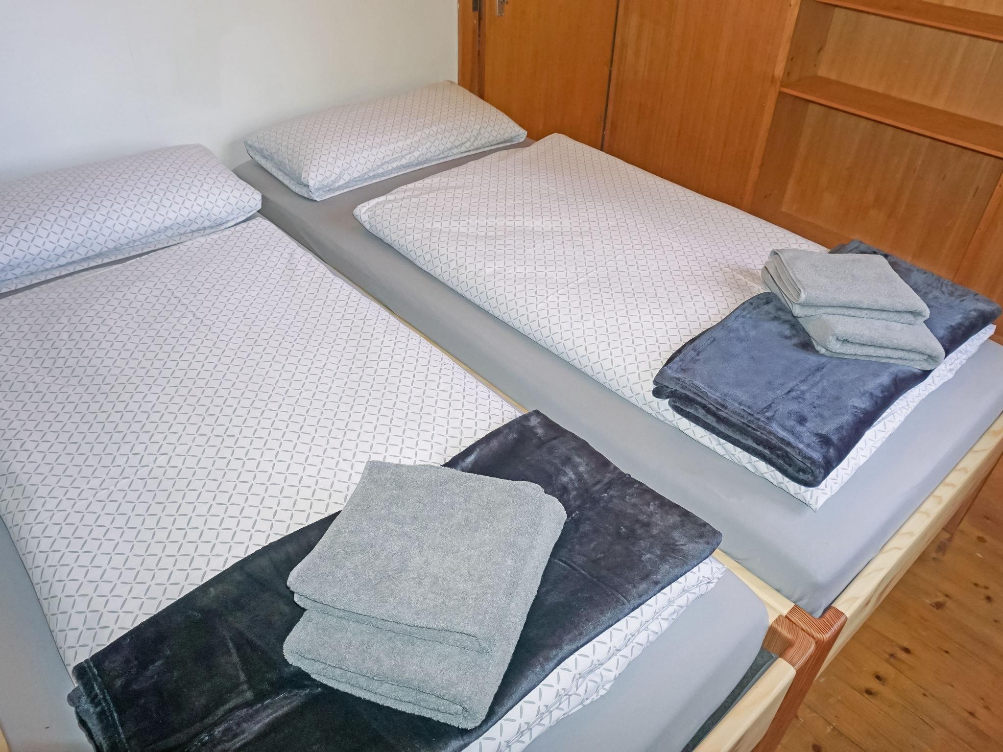 3-room house 80 m2. Rustic and wooden furniture furnishings: entrance hall. 1 room with 2 beds. 1 room with 1 x 1 bunk beds, 1 double bed. Large kitchen-/living room (oven, 4 ceramic glass hob hotplates, toaster, kettle, microwave, electric coffee machine, Capsules for coffee machine (Erstausstattung) free) with 1 double sofabed (1 x 150 cm, length 180 cm), dining nook and TV (flat screen), hi-fi system and electric heating. Shower, sep. WC. Electric heating. Wooden floors. Large terrace, east facing position. Terrace furniture. Please note: non-smoking house. Smoke alarm, fire extinguisher. Attention: TV and WiFi must be paid extra on site (Netflix). House suitable for 4 adults and 3 children (bed size)!