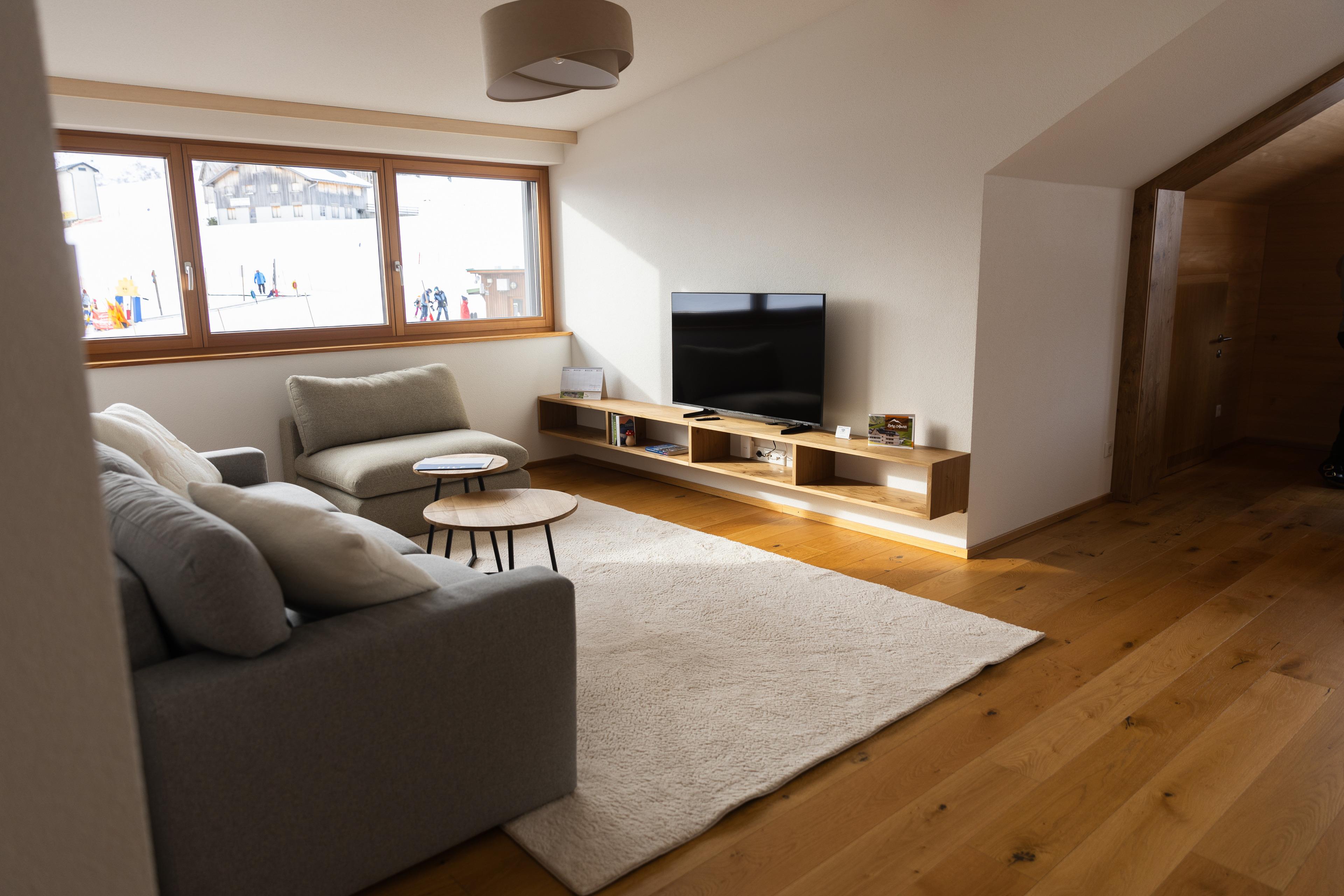 Das Apartment 14 im Berg Aparts Faschina ist sehr liebevoll und auch sehr hochwertig eingerichtet. Der Wohn- und Essbereich bietet mit seinem großen Esstisch und Fenster-Sofa viel Platz zum entspannen und genißen. Der wunderschöne Panoramablick auf die Bergwelt des Großen Walsertals ist einzigartig.