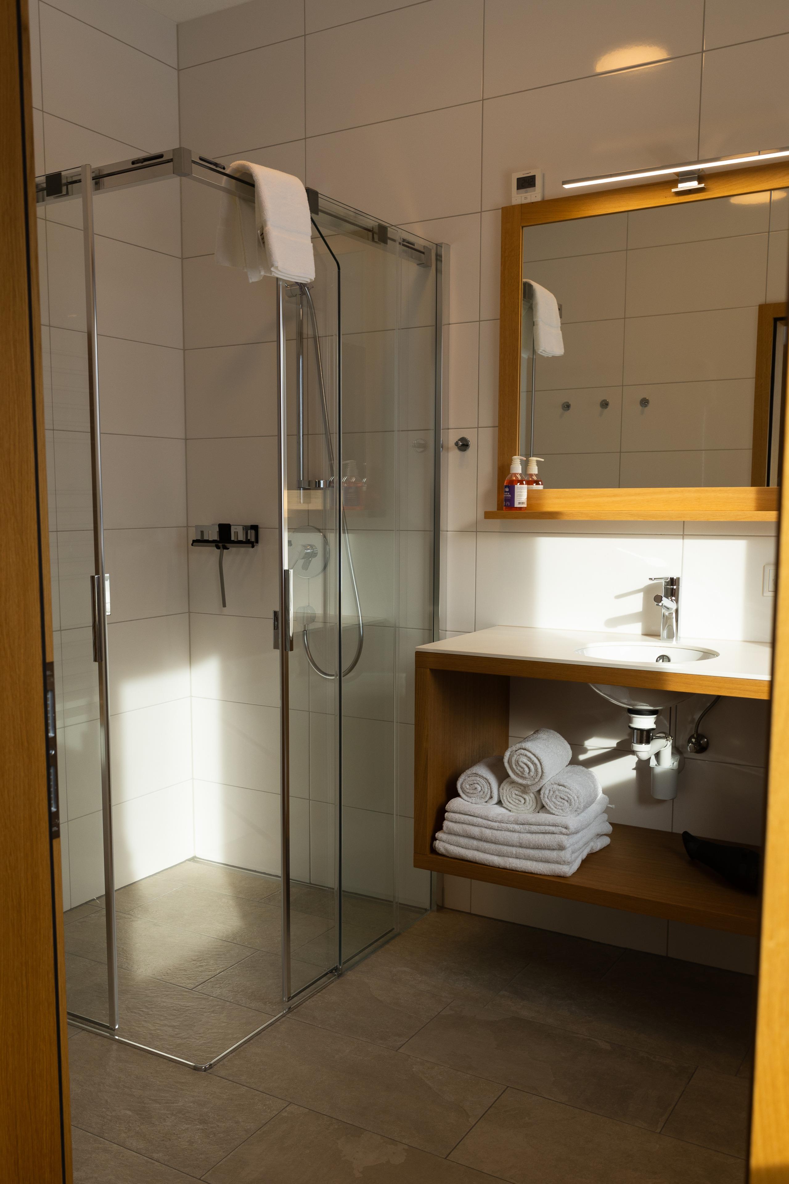 Das Badezimmer mit geräumiger Dusche bietet mit einem Handtuchwärmer und einem Fön sowie einer Ablagefläche, zusätzlichen Komfort. Das WC ist separat.