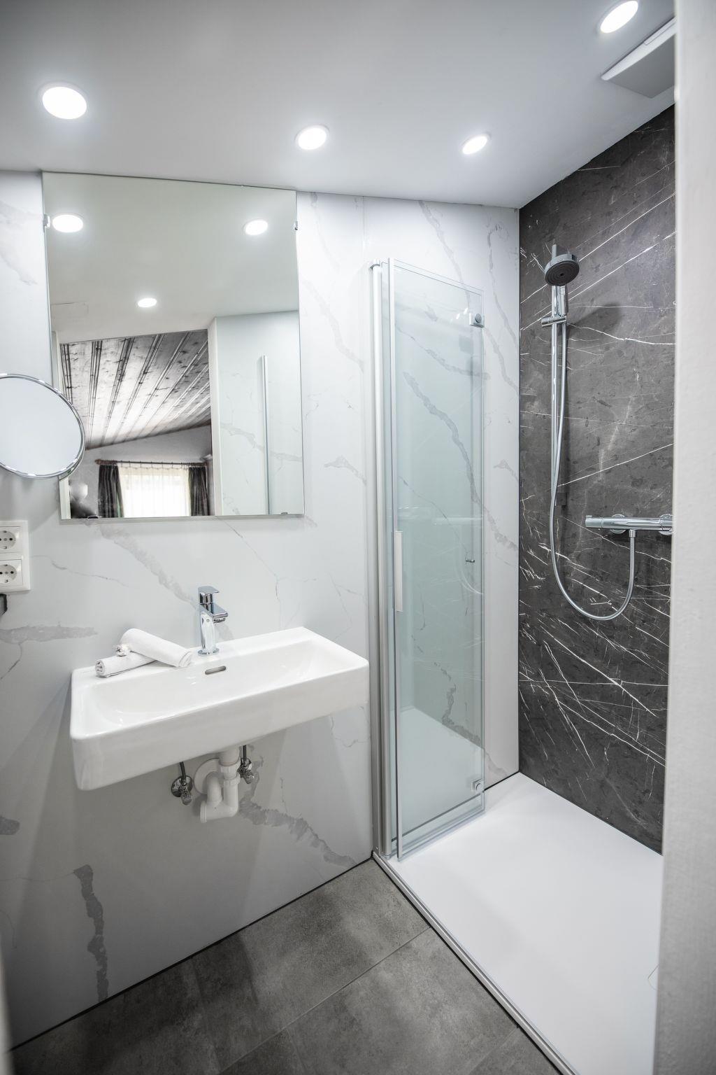Inside, the "Classic" bedroom has a large French bed for two people, a single bed and a 42" flat-screen TV. A desk including a PC with free internet access and a spacious wardrobe are also available. The "Zirbe" bedroom spoils you with a large double bed, a single bed and a sofa bed for a total of four people. Both bedrooms have an integrated bathroom with shower, washbasin and hairdryer. The shared kitchen is generously equipped with modern amenities such as a dishwasher, induction hob and coffee machine. A cosy living room with leather landscape and an entrance area with ski and bike room including boot dryer complete the offer.