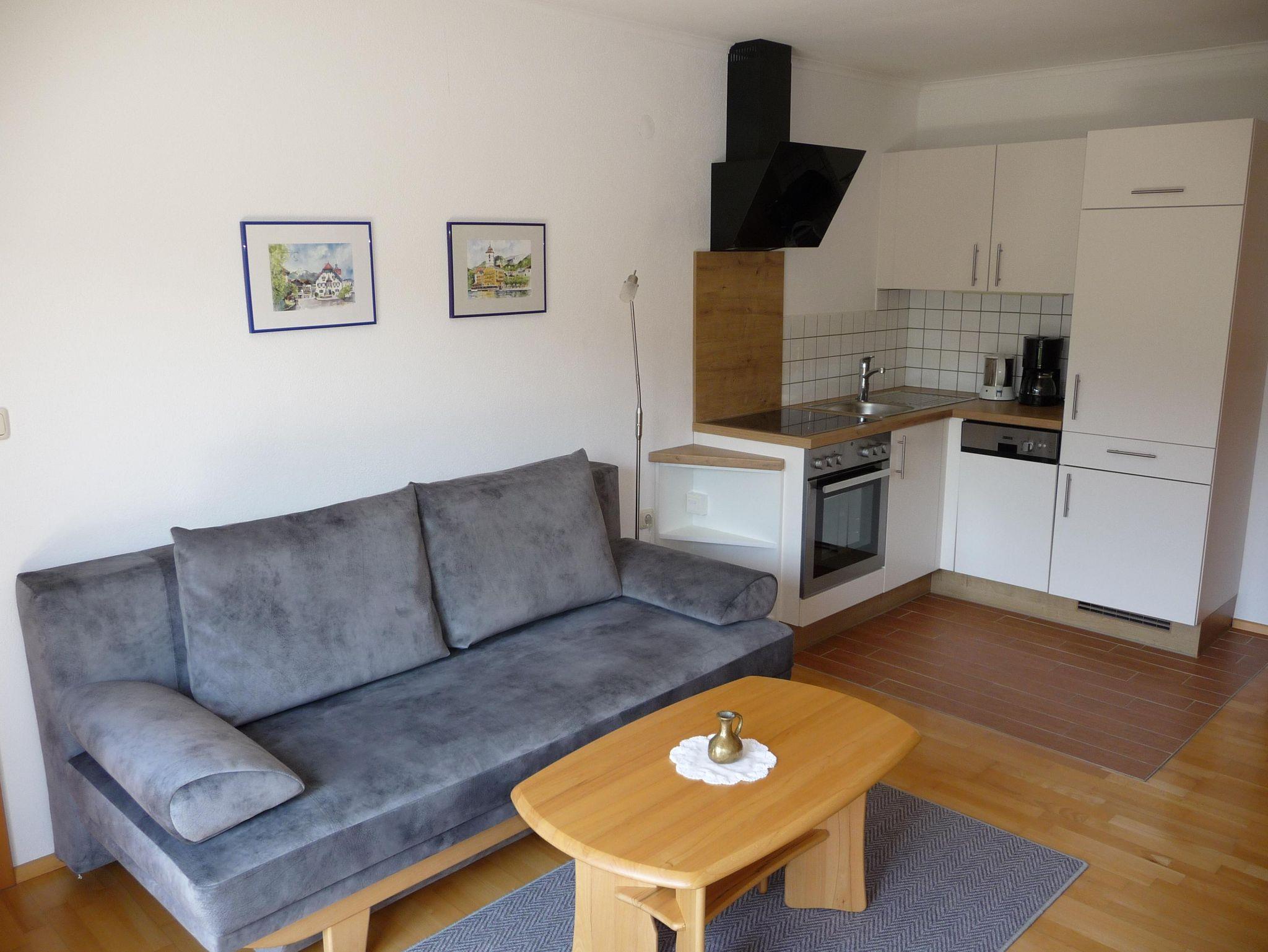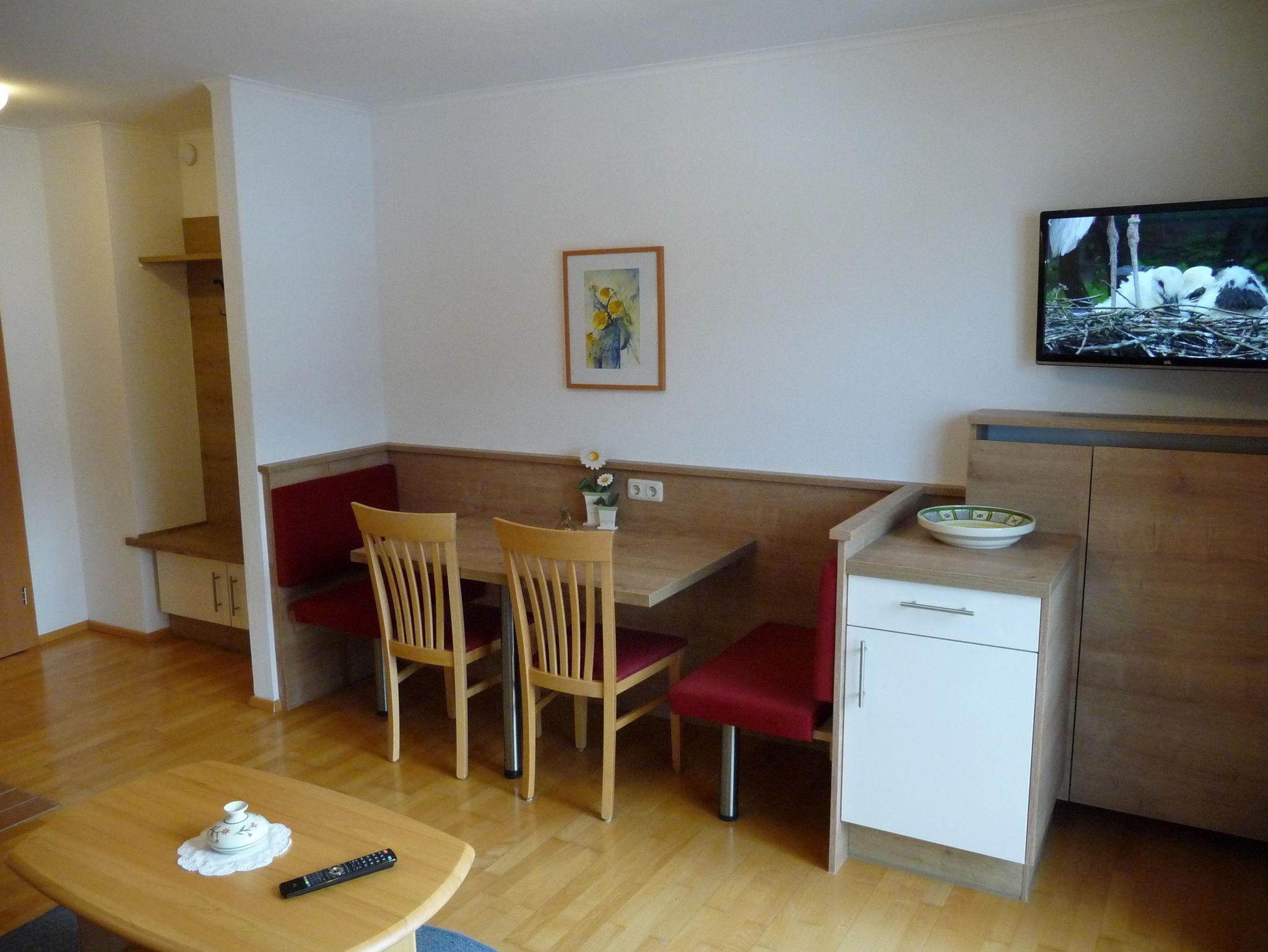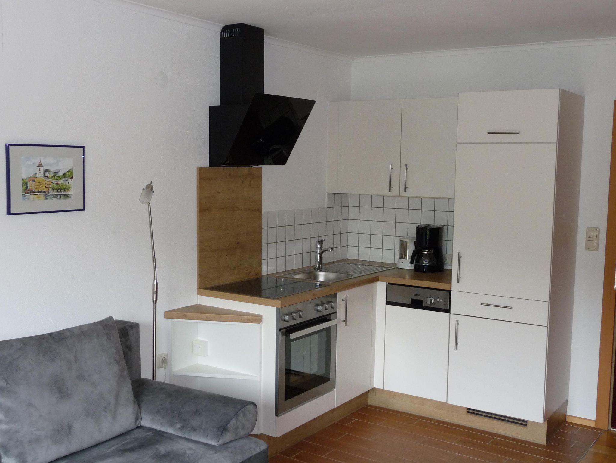 Diese Wohnung befindet sich im ersten Stock. Wohnküche komplett eingerichtet mit Flat-TV, Esstisch mit Stühlen und einer kleinen Garderobe. Der Balkon mit Markise, Tisch und Stühlen bietet einen sehr schönen Blick über den Fuschlsee,