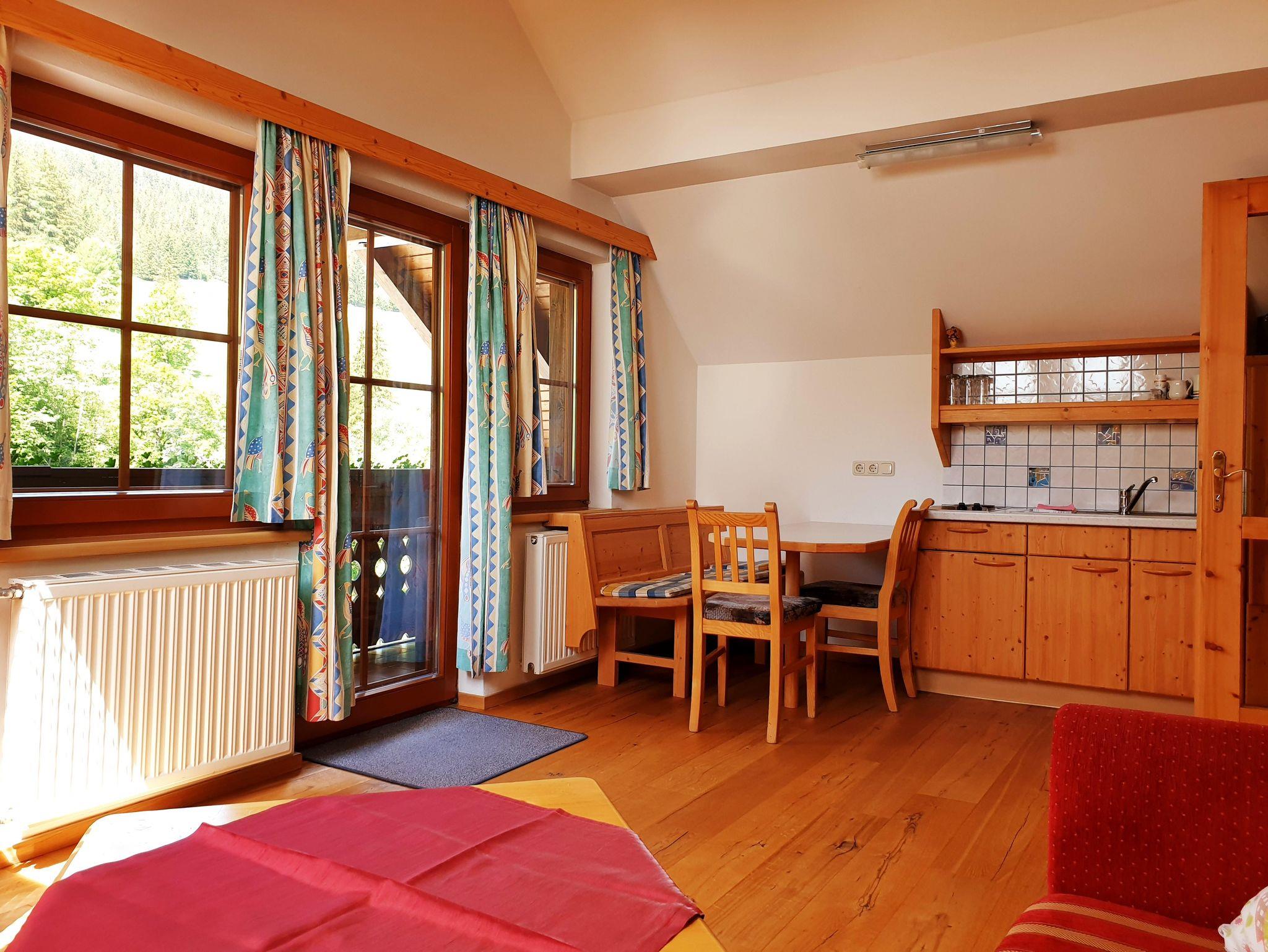 Ferienwohnung Alpenveilchen (102) 3-Sterne Hotelappartement mit zwei getrennten Schlafräumen (ideal für Familien mit Kindern), DU-WC mit Fußbodenheizung, Blick in das östliche Göriachtal, gemütliche Sitzcouch, Kitchenette mit Herd, Kaffeemaschine, Kühlschrank, Flatscreen-Sat-TV, Telefon, gratis W-Lan (WIFI) im Appartement, Hotelsafe, Haartrockner, Bettwäsche, Hand-, Bade- und Geschirrtücher, Einrichtung im Salzburger Stil. Bei Buchung der Appartements mit Verpflegung entfällt die Endreinigung in Höhe von Euro 30,00. Diese wird vor Ort abgezogen.