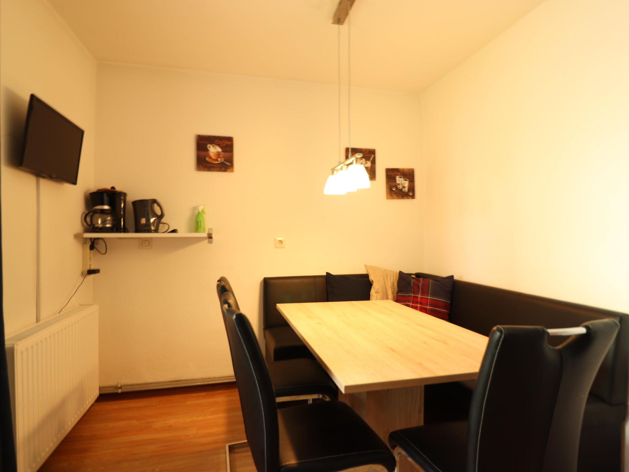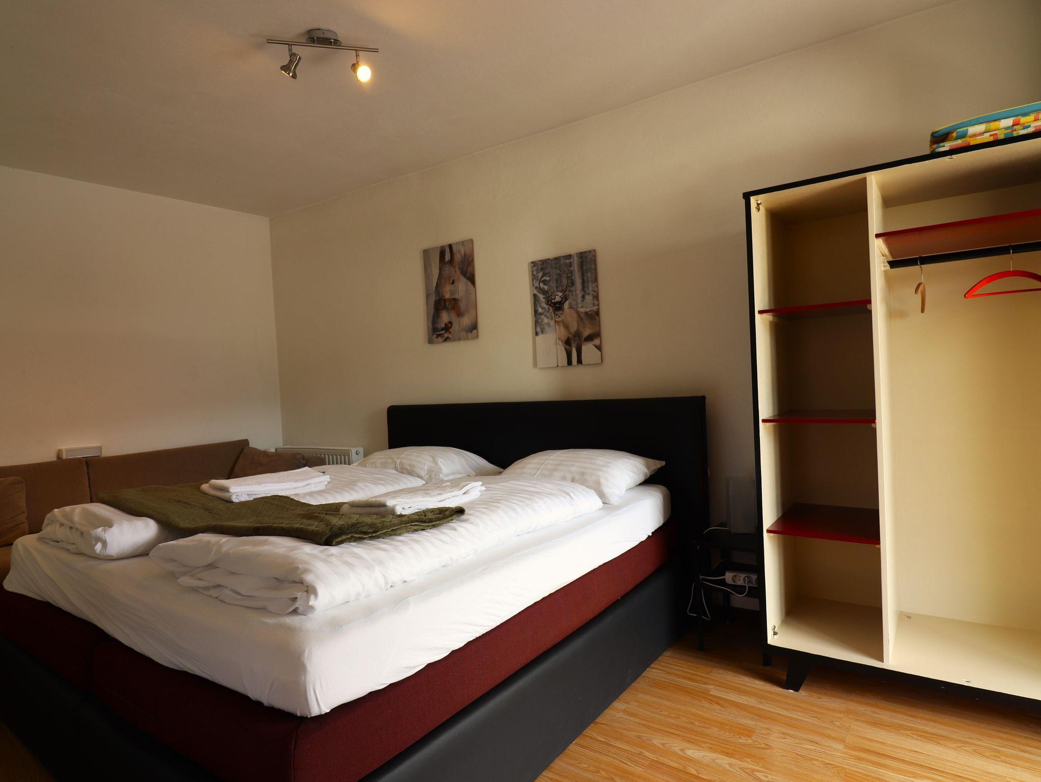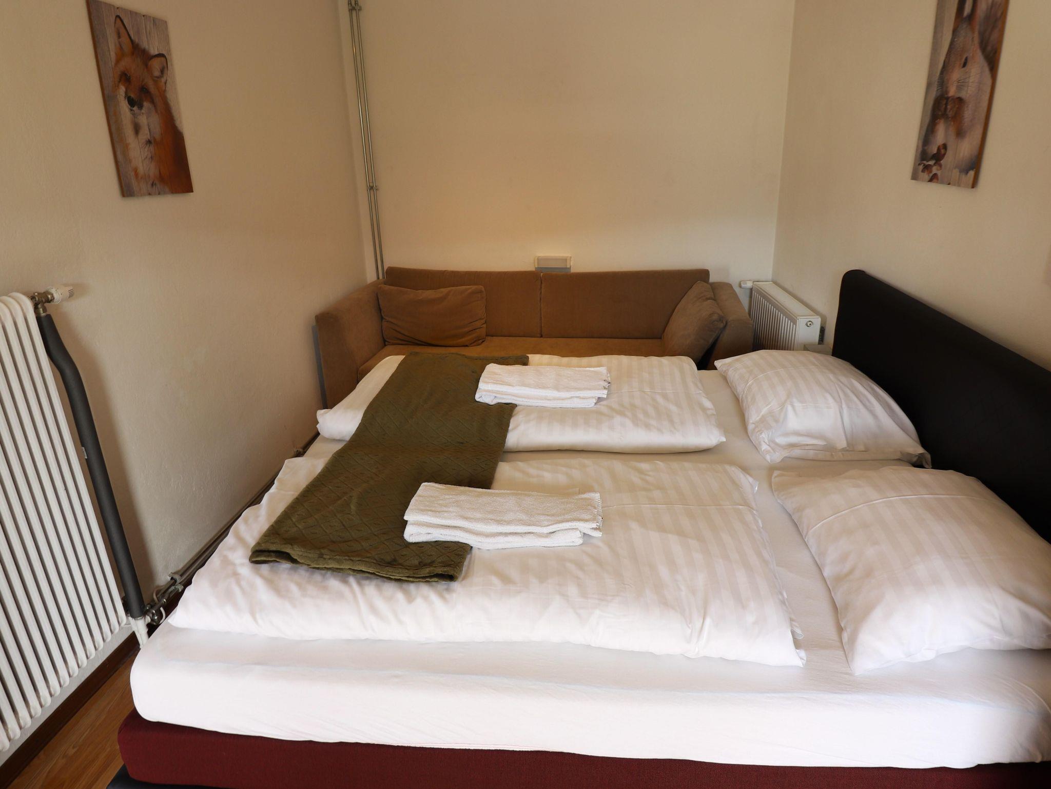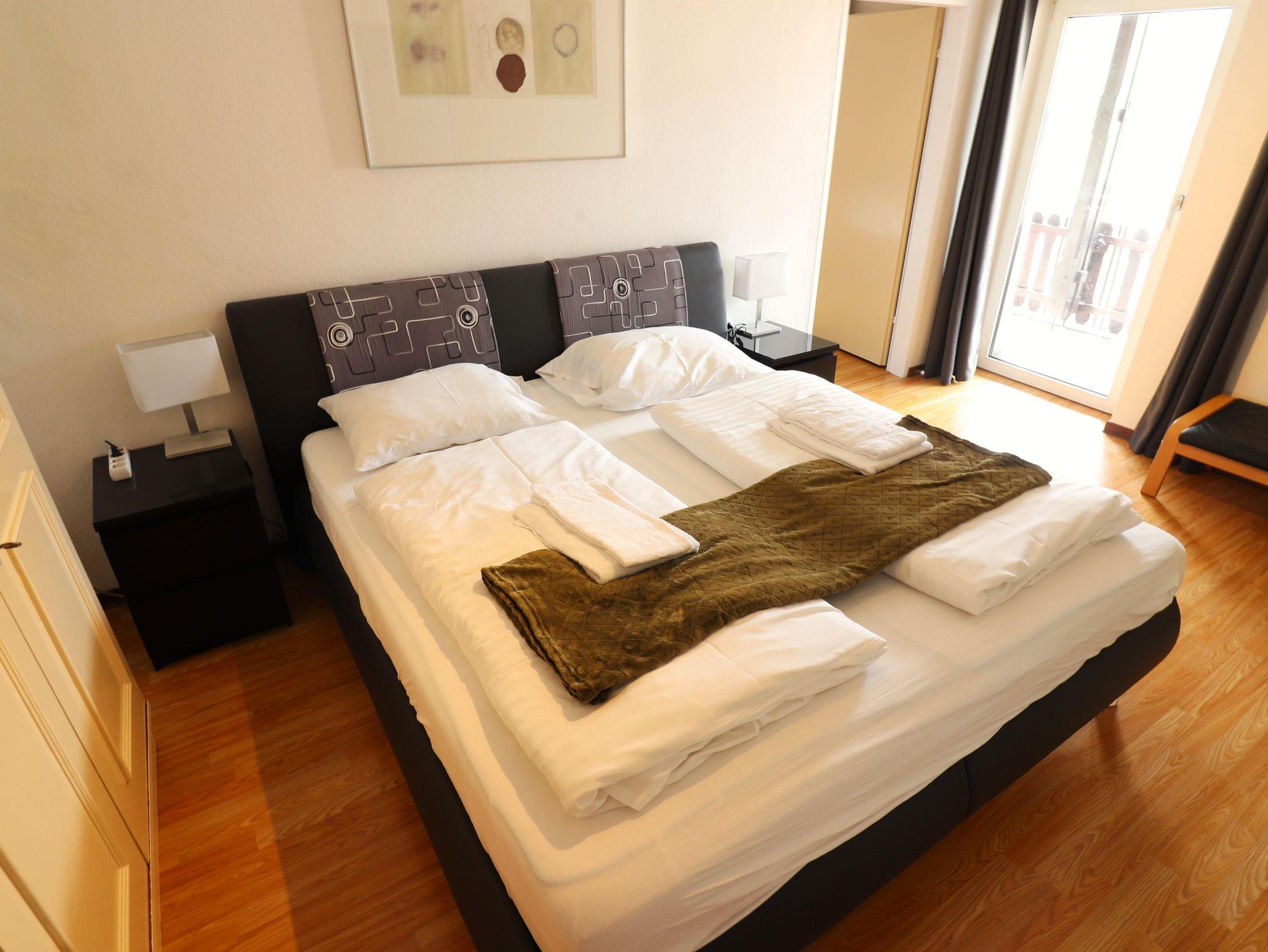 Familienapartment mit grosse Wohnküche, ein Zimmer mit Doppelbett und ein Zimmer mit zwei Etagenbetten. Douche/WC und ein Balkon.