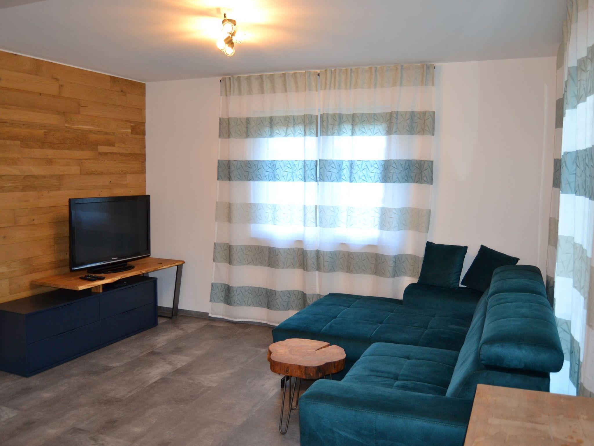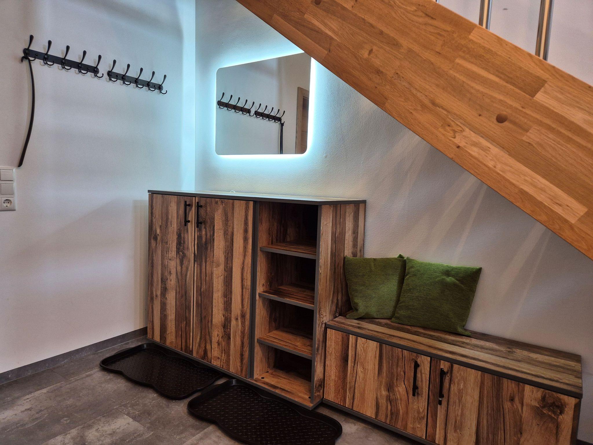 Im Erdgeschoss befindet sich ein geräumiges Vorzimmer mit genügend Stauraum für Jacken und Schuhe, ein kleines Badezimmer mit WC und Dusche, sowie ein Wohn-/Essbereich mit ausziehbarer Schlafcouch, Flachbild-Sat-TV, Bluetooth Soundbar und eine voll ausgestattete Küche.