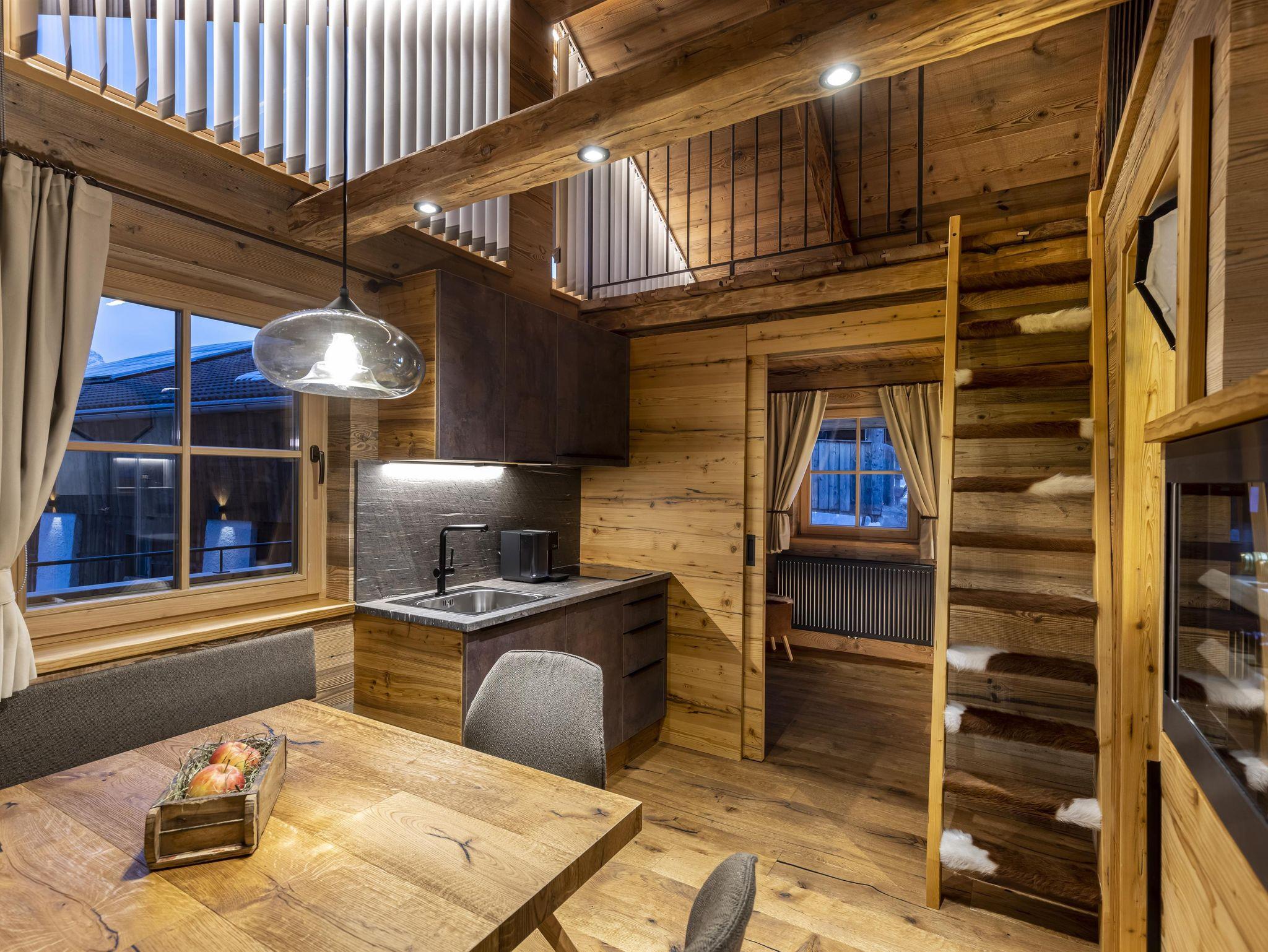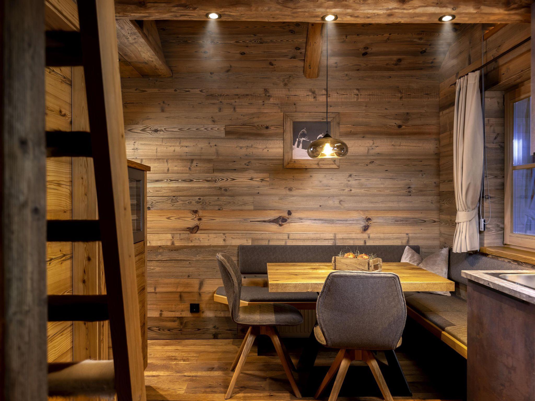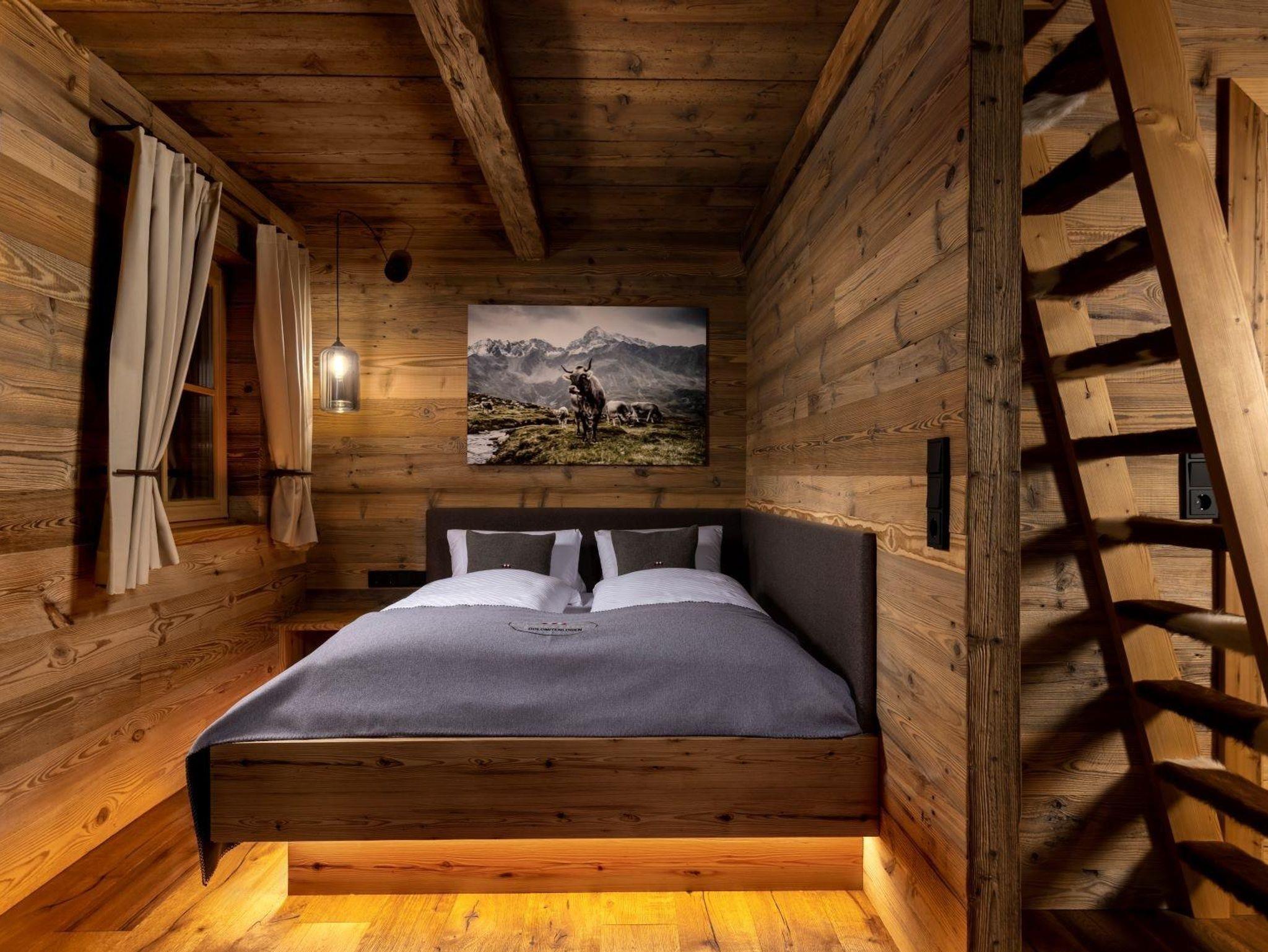 Unser romantisches Dolomiten Chalet für 2 Personen bietet 1 Schlafzimmer mit Doppelbett, Küchenzeile, Wohnbereich und Bad mit Dusche und WC. Über die Leiter findet man ein abenteuerliches Hochbett.