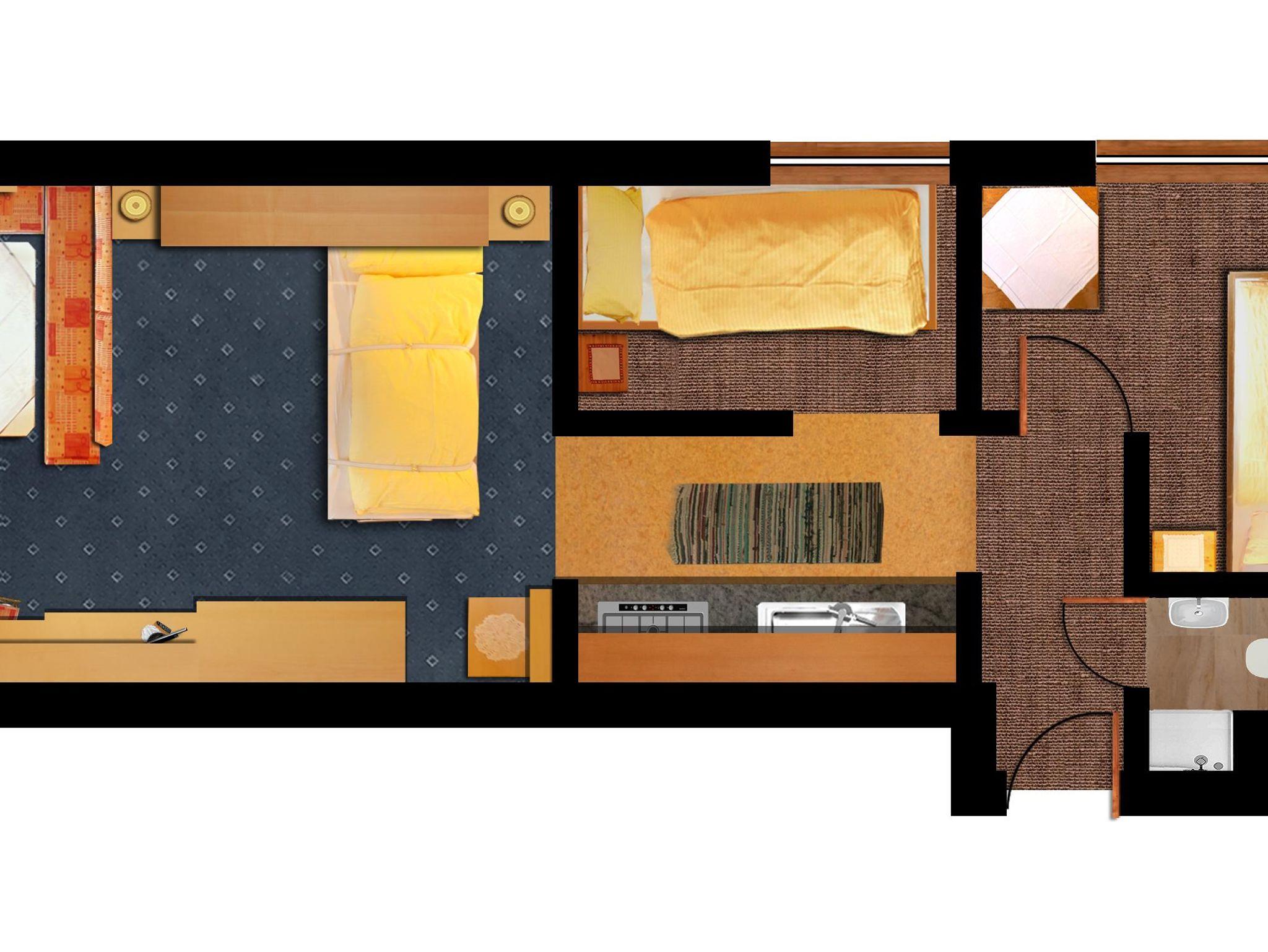 APPARTEMENT FÜR 4-5 PERSONEN 55 qm Doppelzimmer, Dusche/WC, Einzelzimmer, gemütlicher Wohn-/Schlafraum und Balkon.