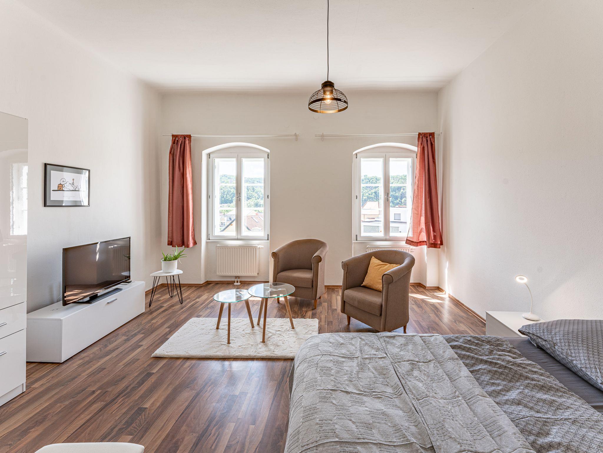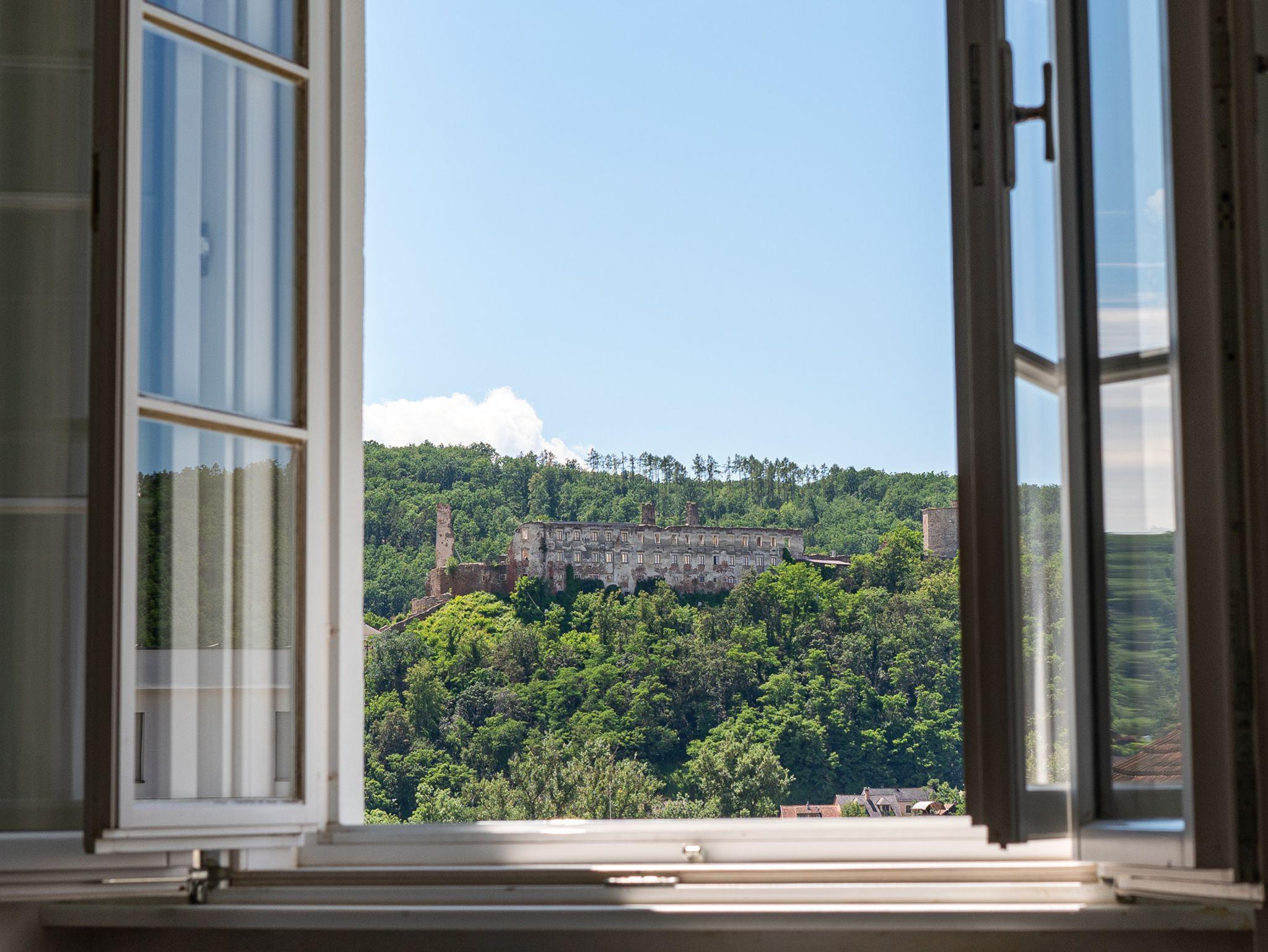 Unsere großzügigen Apartments in Einzel- und Doppelbelegung, vermitteln das gewisse Extra, wie in diesem Apartment ein extra schöner Ausblick auf unsere Babenberger Ruine aus dem 11. Jahrhundert, der perfekte Spielort für Opernaufführungen.