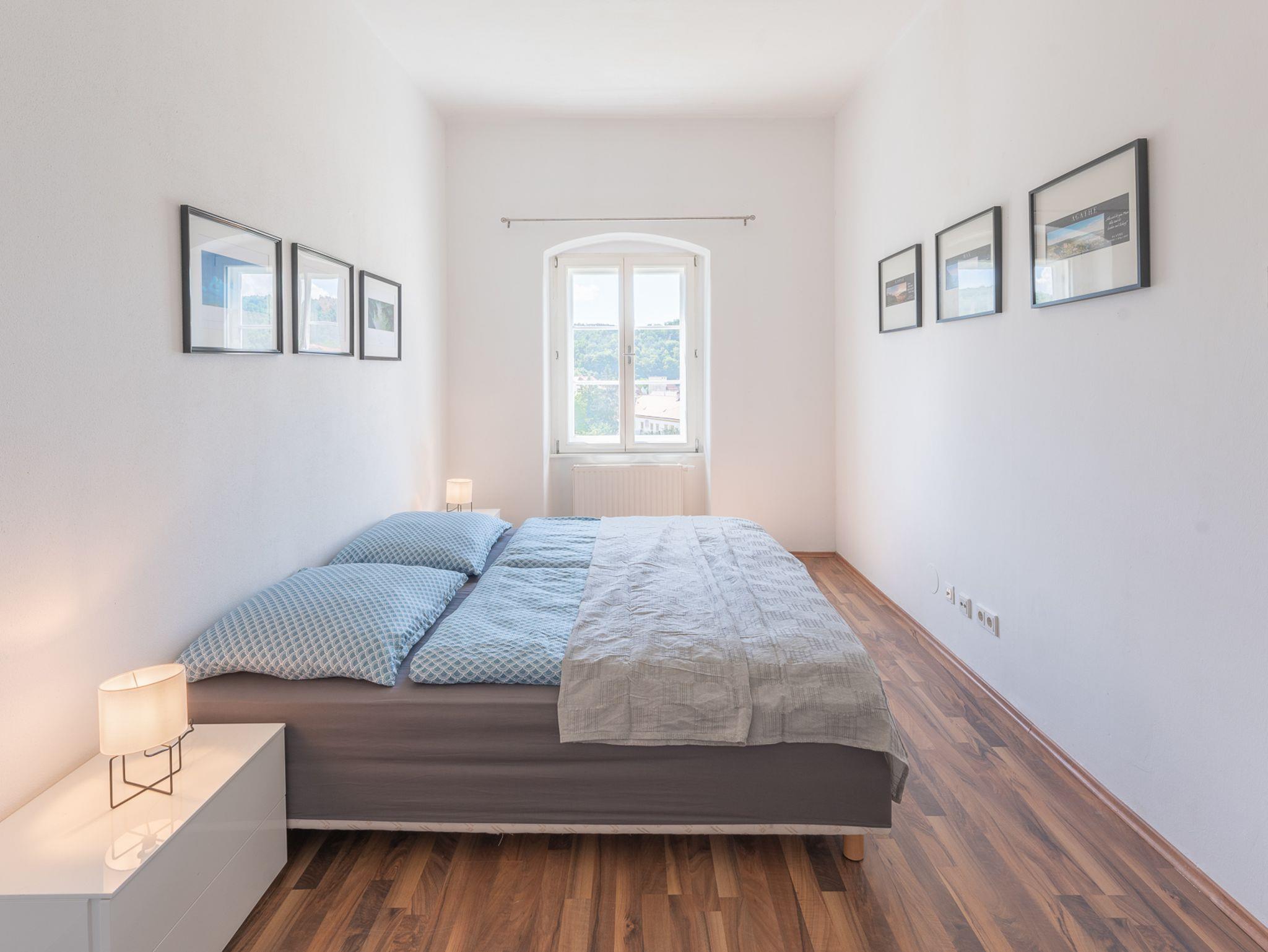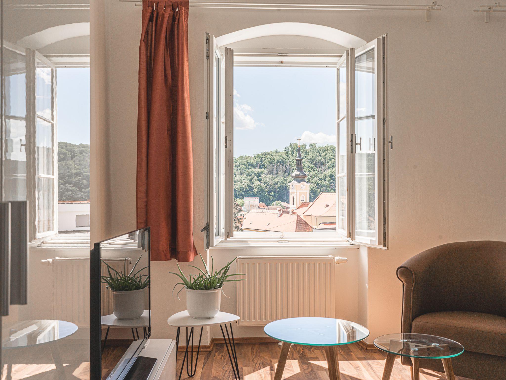 Unsere großzügigen Apartments in Einzel- und Doppelbelegung vermitteln das gewisse Extra, wie in diesem Apartment ein extra schöner Ausblick auf unserem Kirchturm, sowie unseren Hauptplatz. Auf rund 47 m² befindet sich ein eigener Wohnbereich mit ausziehbarem Schlafsofa und ein separates Schlafzimmer mit modernem Doppelbett. Die Küche ist mit einer Küchenzeile und einem Essbereich ausgestattet und auch im Vorraum und im Bad mit Dusche und WC ist großzügig Platz vorhanden. Großzügigkeit ist das Zauberwort, welches einen unbekannten Ort zum Schlafen und zu einem wohltuenden Urlaubszuhause macht. Fühlen Sie sich wohl bei uns.