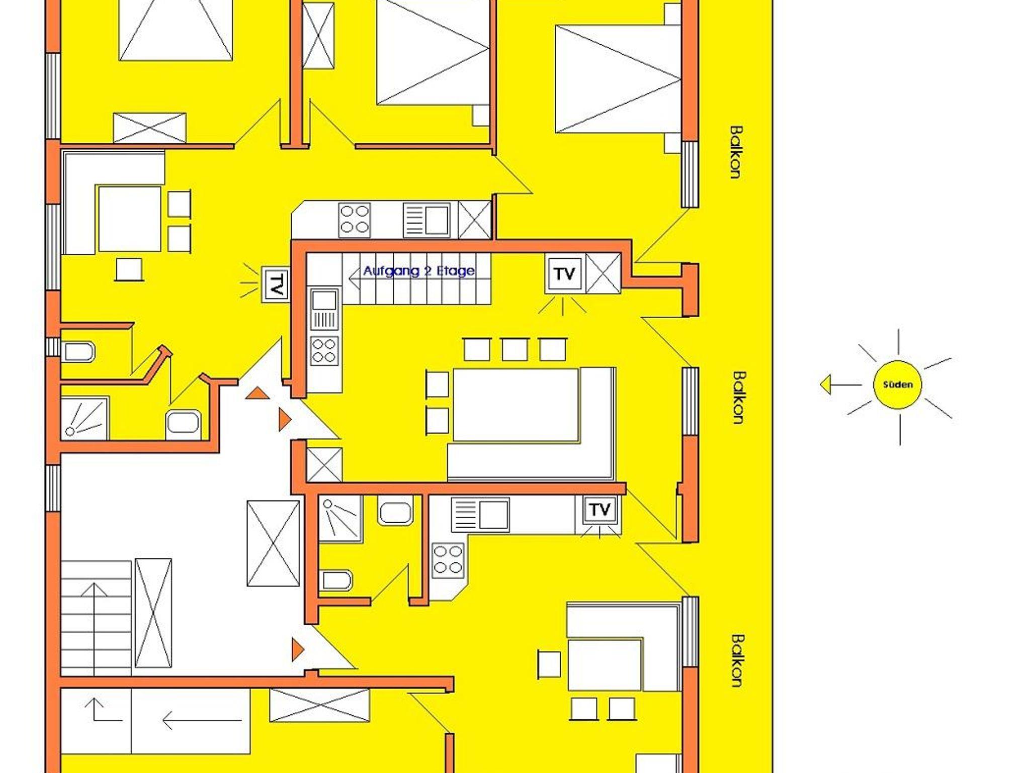 (183m2) 6 Schlafzimmer (3DZ + 3DBZ), Kaffeemaschine, Mikro, Geschirrspüler, Kühl/Gefrierschrank, Elektroherd mit 4 Platten (Ceran), Backofen, Toaster, Mixer, Wasserkocher, KABEL-TV, WIFI-EMPFANG, 2 Dusche/WC, 1DU, 1WC, 1 Wohnschlafraum (2 Betten), 1 Wohnküche, 2 Küchen, Wohnung über 2 Etagen, Süd-Balkon