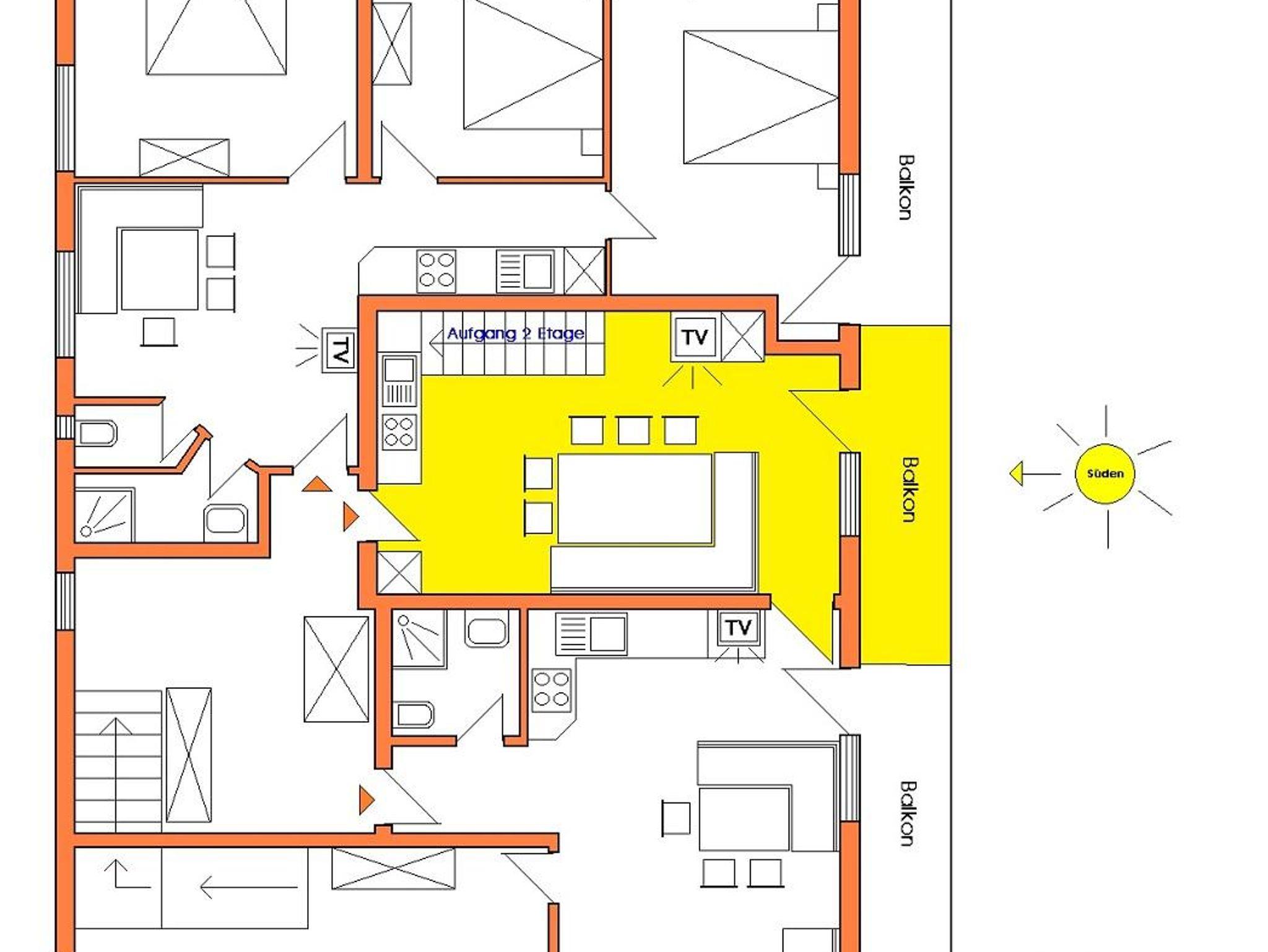 (70m2) 2 Schlafzimmer ( 2 DBZ) 1 Wohnküche, Wohnung über 2 Etagen, Elektroherd mit 4 Platten (Ceran), Backofen, Mikro, Geschirrspüler, Kühl/Gefrierschrank, Kaffeemaschine, Toaster, Mixer, Wasserkocher, KABEL-TV, WIFI-EMPFANG, 1 Dusche/WC, Küche, Süd-Balkon