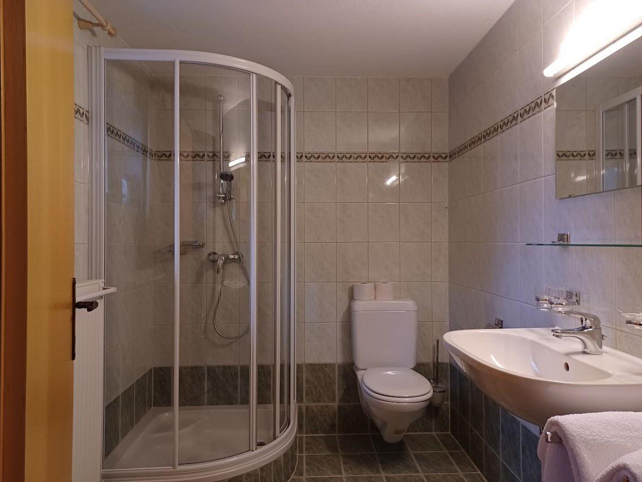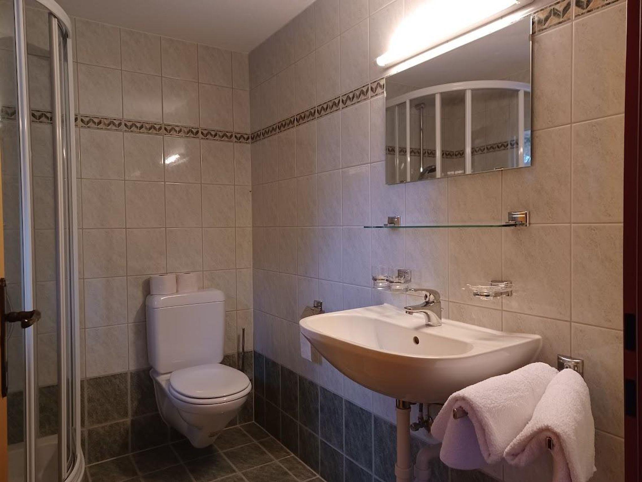 Das Badezimmer verfügt über Dusche, Waschbecken und WC.