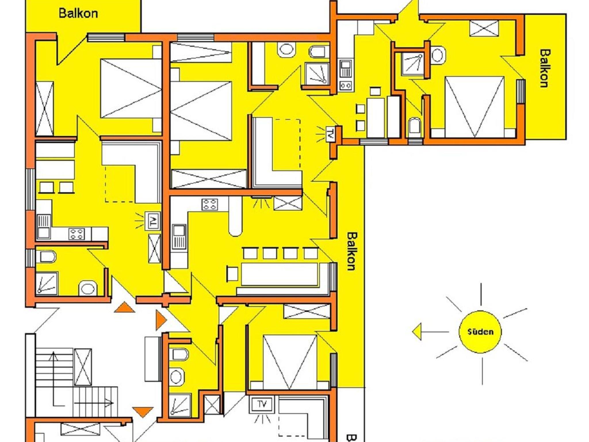 (141m2) 4 Schlafzimmer (2DZ + 2 DBZ), 2 Wohnschlafräume (je 2 Betten), Kaffeemaschine, Mikro, Kühl-Gefrierschrank, Elektroherd mit 4 Platten(Ceran), Backofen, Geschirrspüler, Toaster, Mixer , Wasserkocher, KABEL-TV, WIFI-EMPFANG, 4 Dusche/WC, 2 Wohnküchen, Küche und Wohnzimmer, 2 Süd-Balkone, 1 Ost-Balkon (Hinterhof)