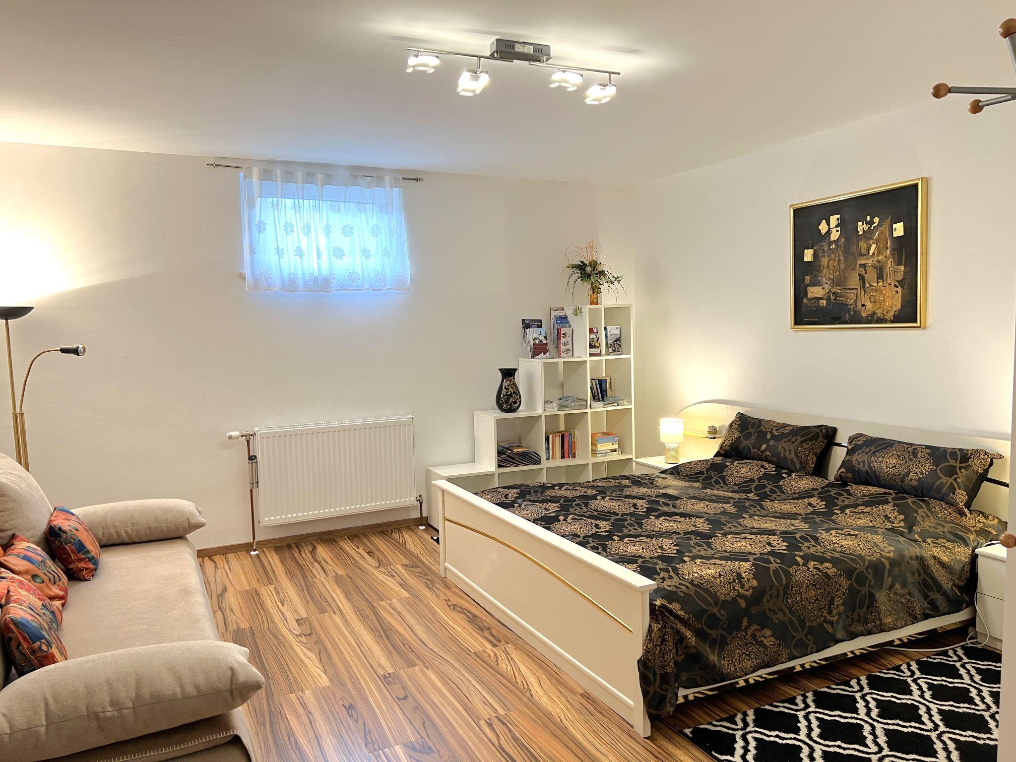 3-room apartment 100 m2, on the lower ground floor. Comfortable and modern furnishings: entrance hall. Large living/dining room with 1 sleeping facility, dining table, international TV channels and flat screen. 1 large double bedroom with 1 double bed and 1 sleeping facility. 1 small double bedroom with 1 double bed and 1 pull-out bed (1 pers. length 180 cm), bath/shower. Open kitchen (4 hot plates, oven, dishwasher, toaster, kettle, microwave, freezer, electric coffee machine). Sep. WC. Heating. Facilities: washing machine, dryer (extra). Internet (WiFi, free). Please note: suitable for families. Non-smokers only. Smoke alarm.