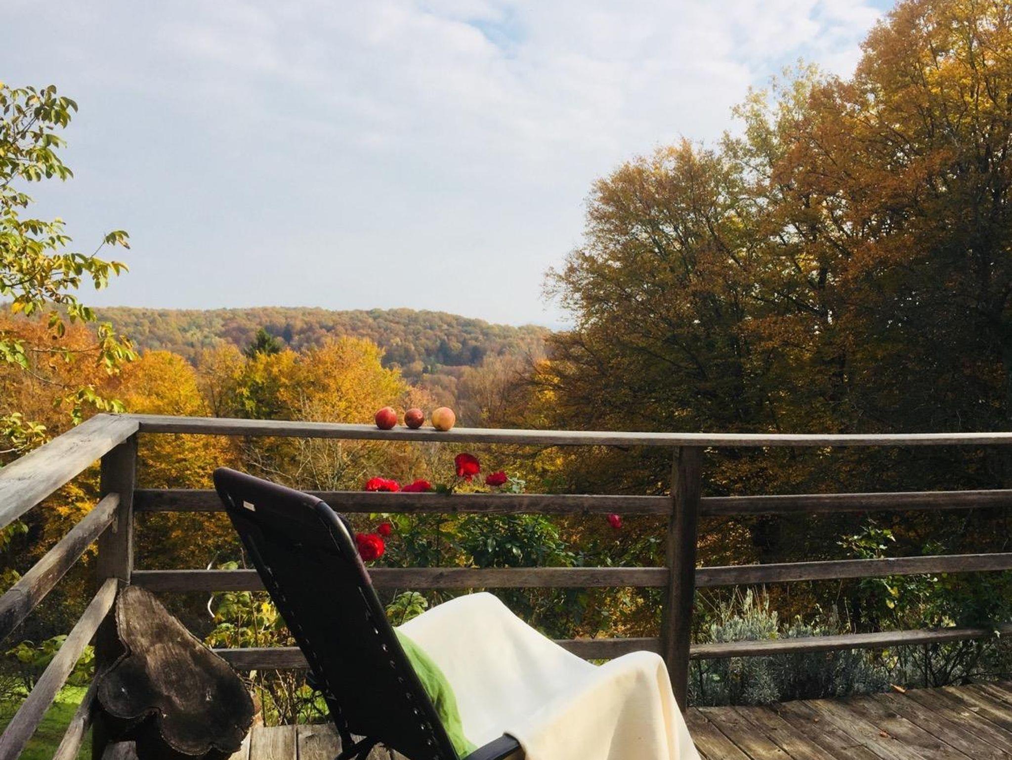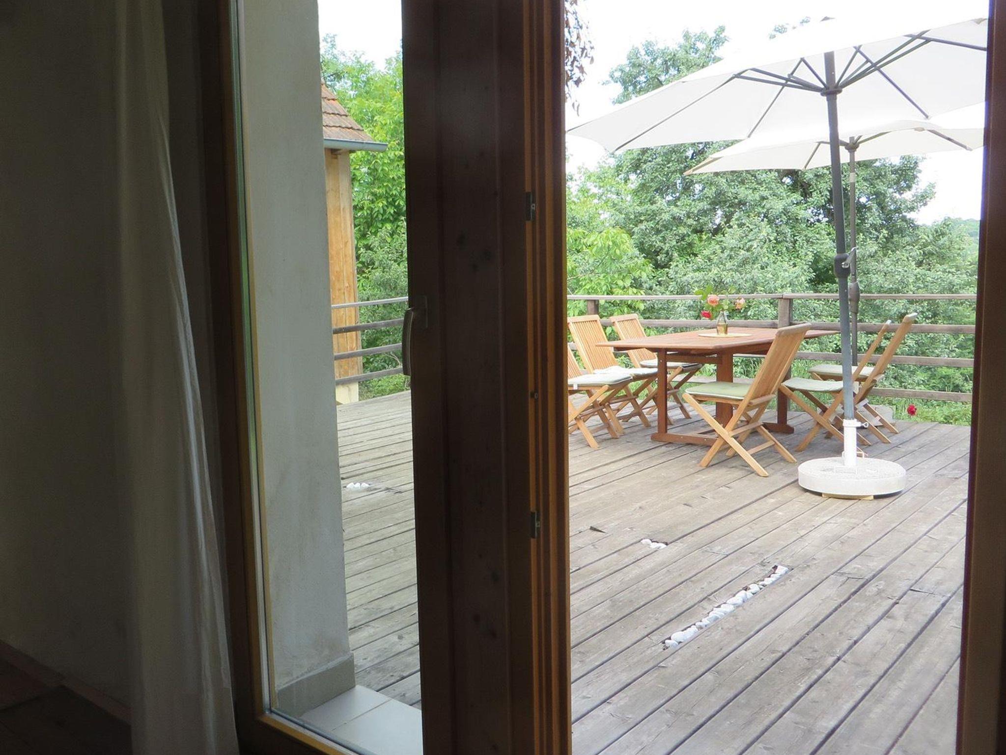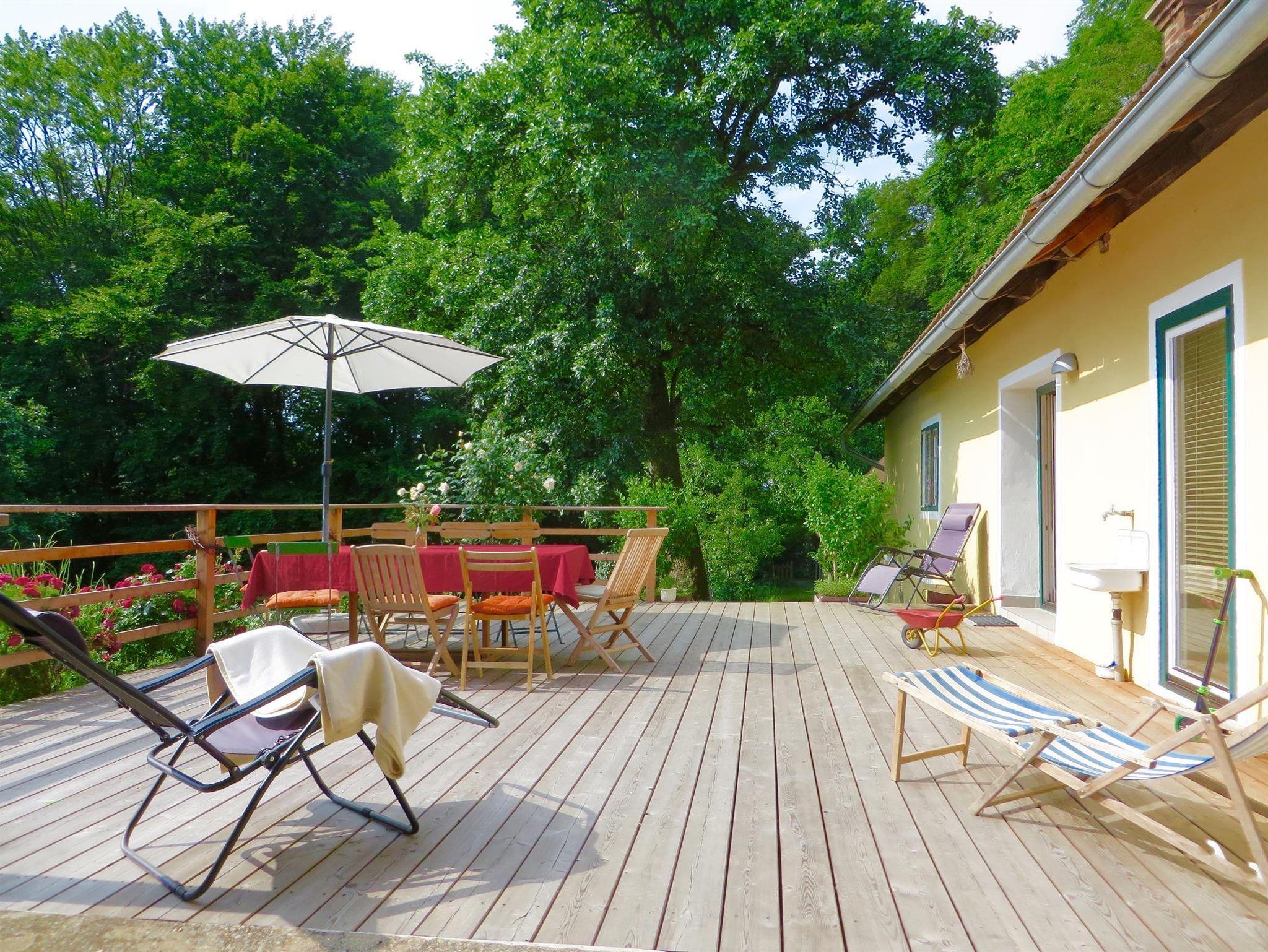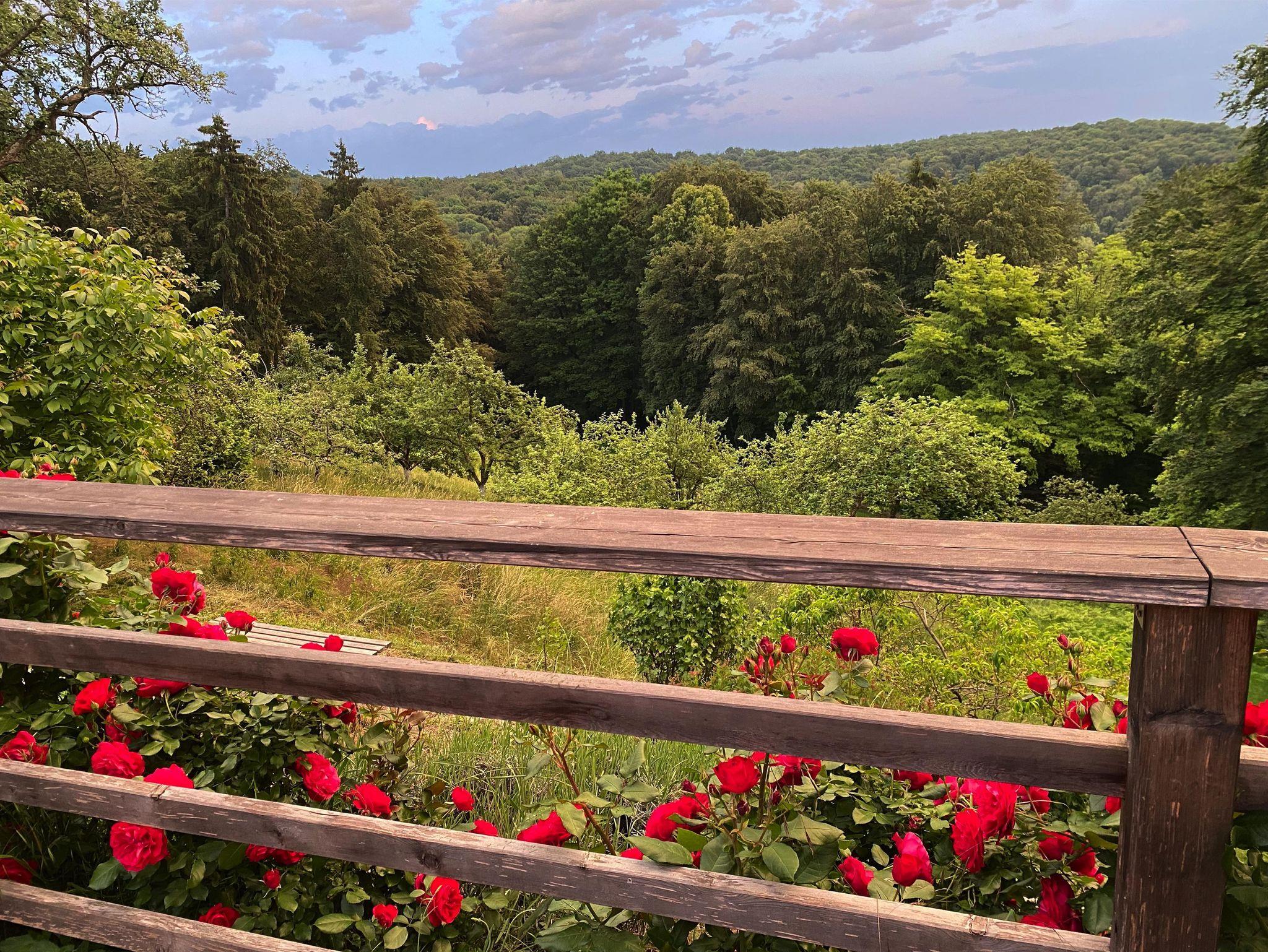 Herzstück ist die große Lärchenholzterrasse direkt vor dem Esszimmer mit herrlichem Ausblick auf Hügeln mit Laubwäldern. Ein offener Holzschuppen bietet im Freien viel Platz zum Tischtennisspielen, Grillen, Festefeiern und Spielen. Der idyllische Platz mit besonders erholsamer Atmosphäre liegt inmitten von Naturwiesen und Buchenwäldern.