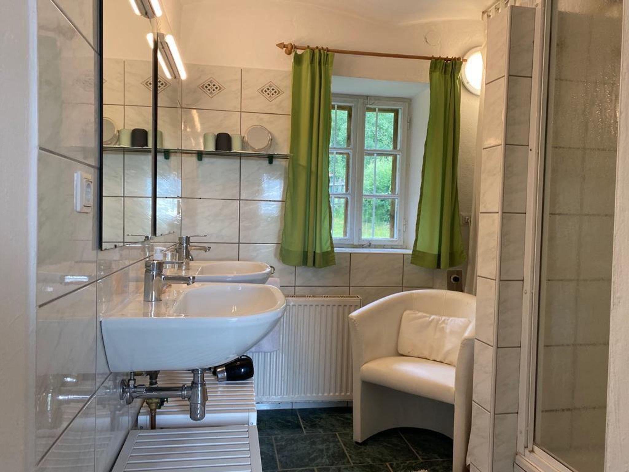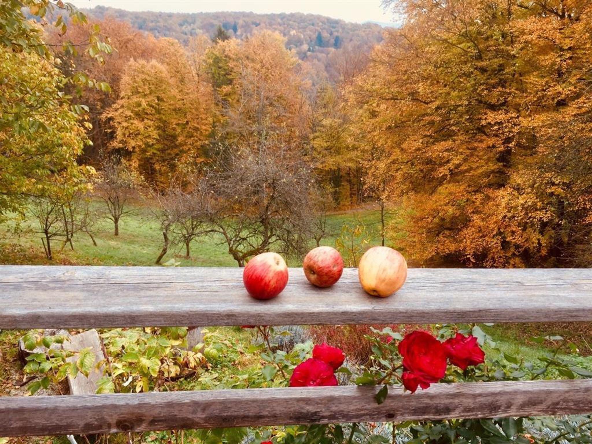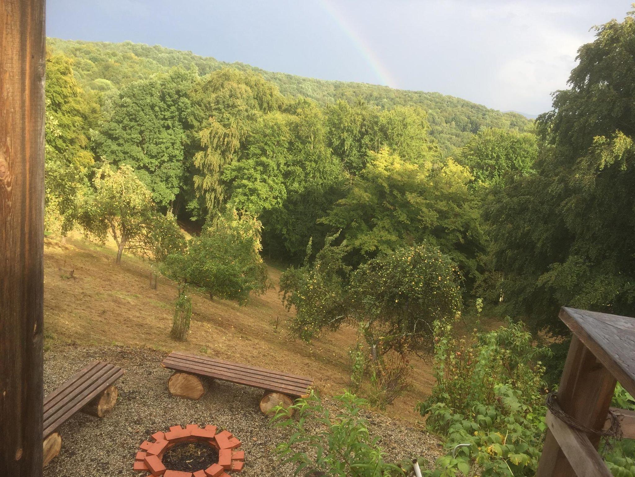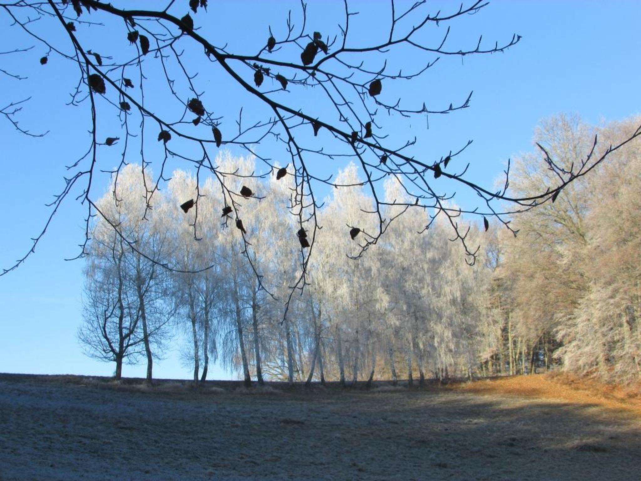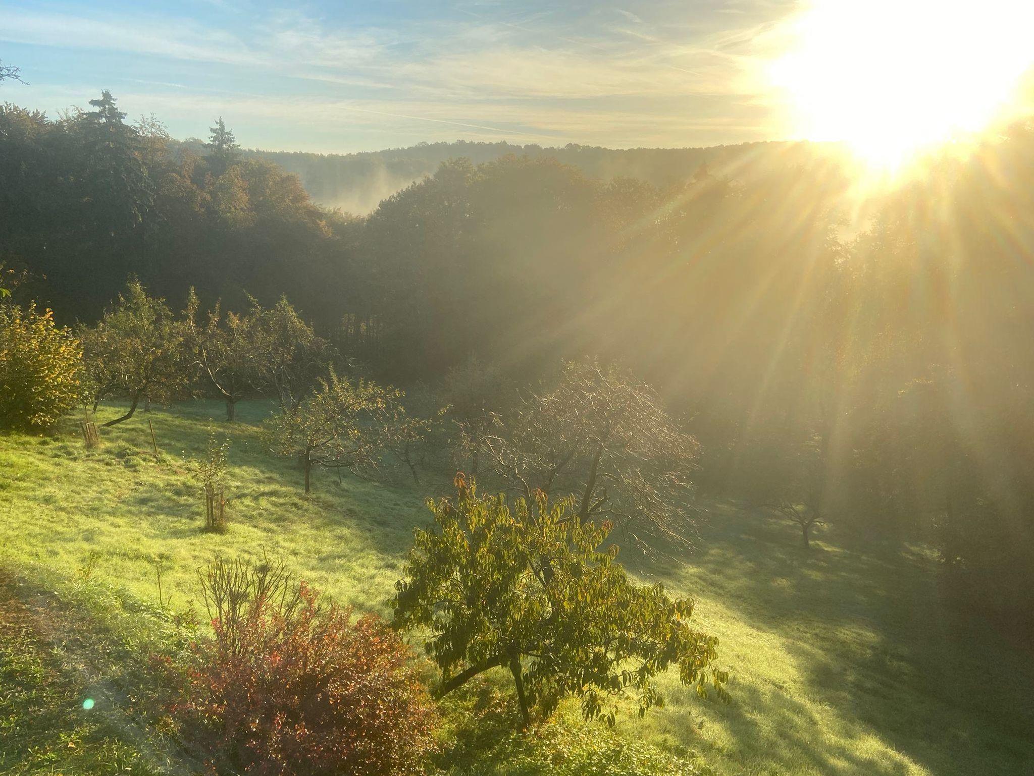 Herzstück ist die große Lärchenholzterrasse direkt vor dem Esszimmer mit herrlichem Ausblick auf Hügeln mit Laubwäldern. Ein offener Holzschuppen bietet im Freien viel Platz zum Tischtennisspielen, Grillen, Festefeiern und Spielen. Der idyllische Platz mit besonders erholsamer Atmosphäre liegt inmitten von Naturwiesen und Buchenwäldern.