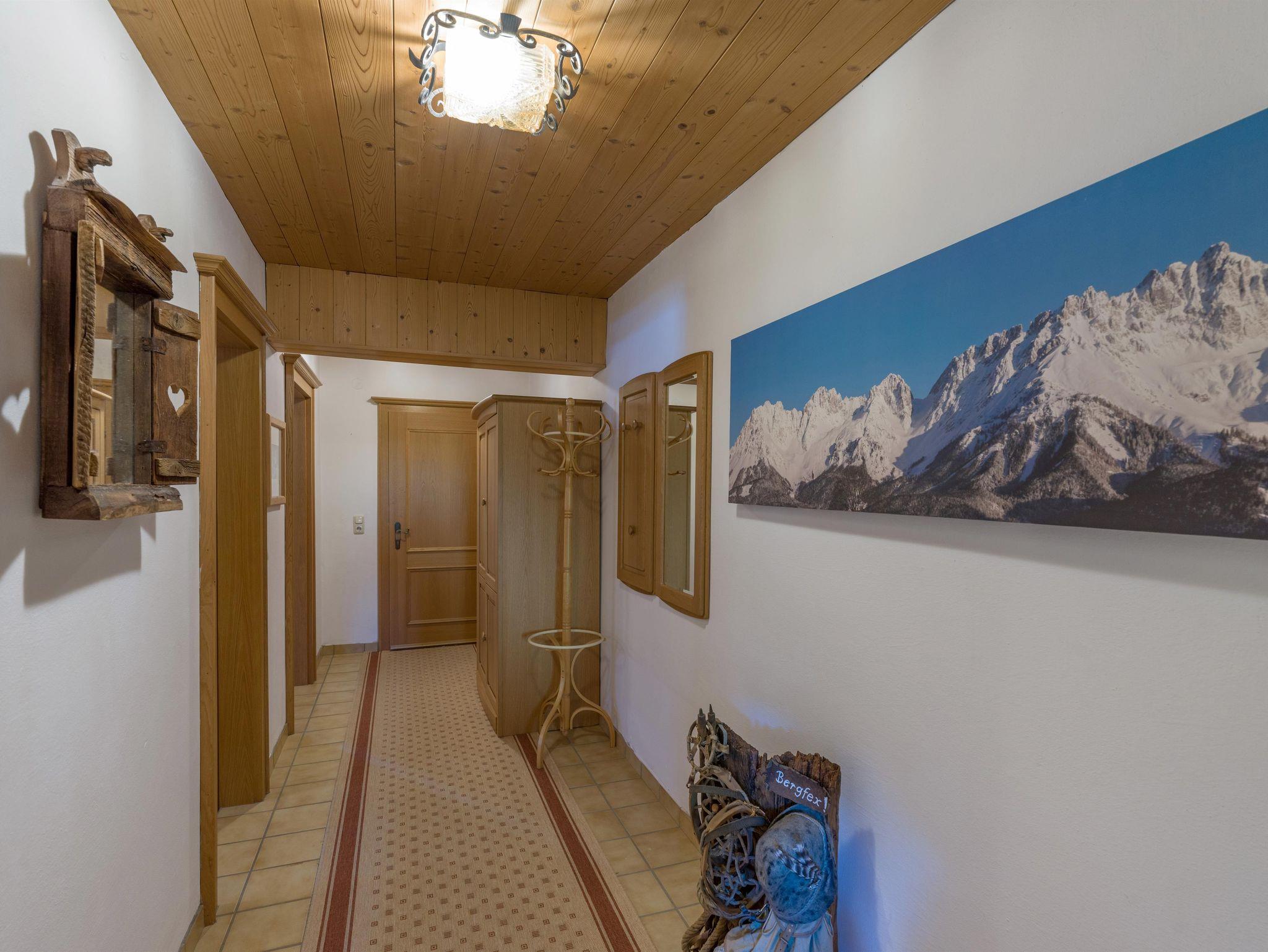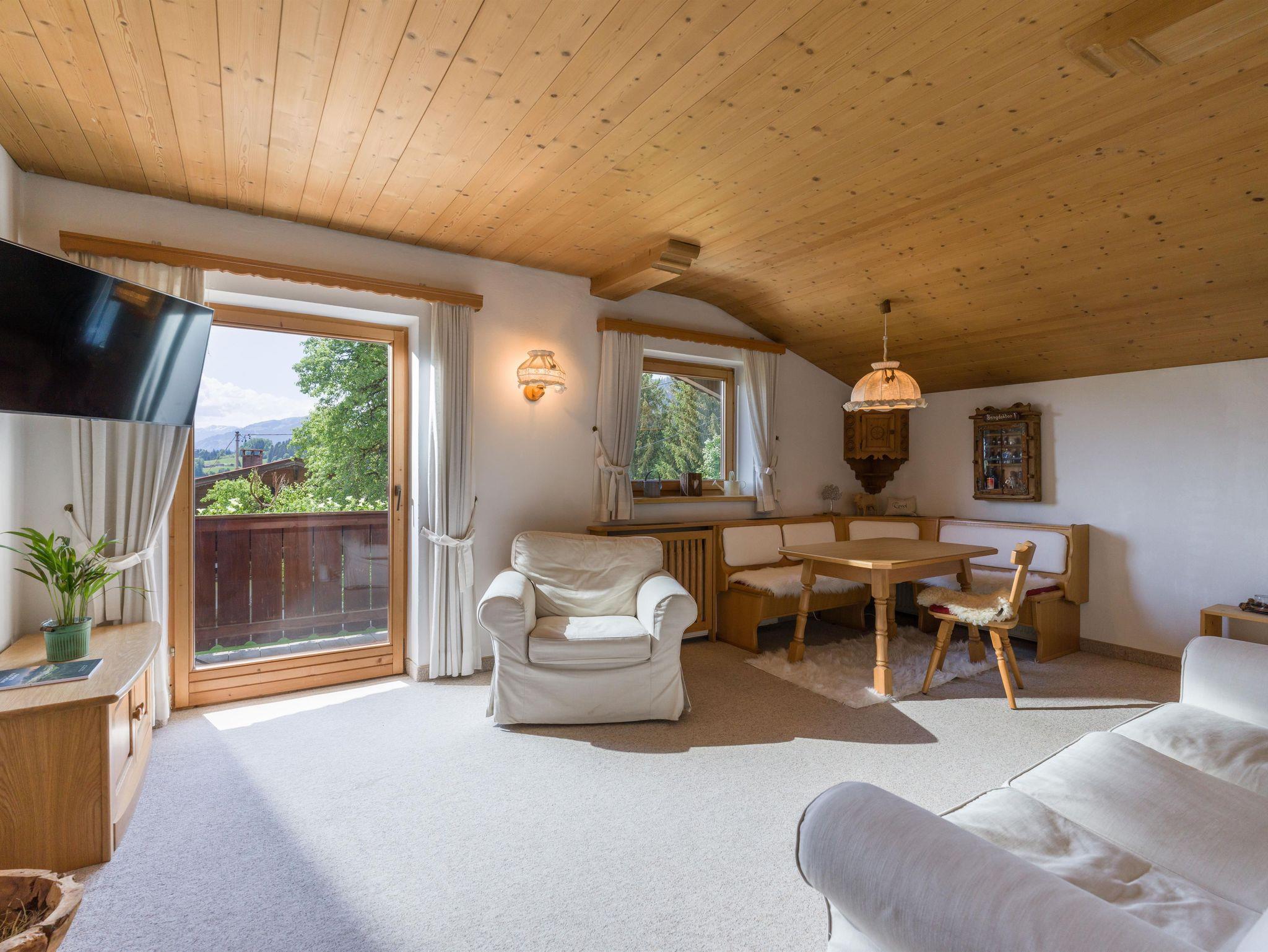Das ca. 60 m² große Appartement bietet eine kleine, ausgestattete Küche mit gemütlicher Sitzecke und einem Flat- TV, ein Badezimmer mit Dusche und WC und zwei Schlafzimmer mit komfortablen Doppelbetten. Das Appartement bietet einen Balkon mit traumhaften Ausblick auf die gesamte Bergwelt und Terrasse mit Blick auf den Wilden Kaiser. Die gemütlichen Ferienwohnungen sind mit viel Liebe im Tiroler Landhausstil eingerichtet.