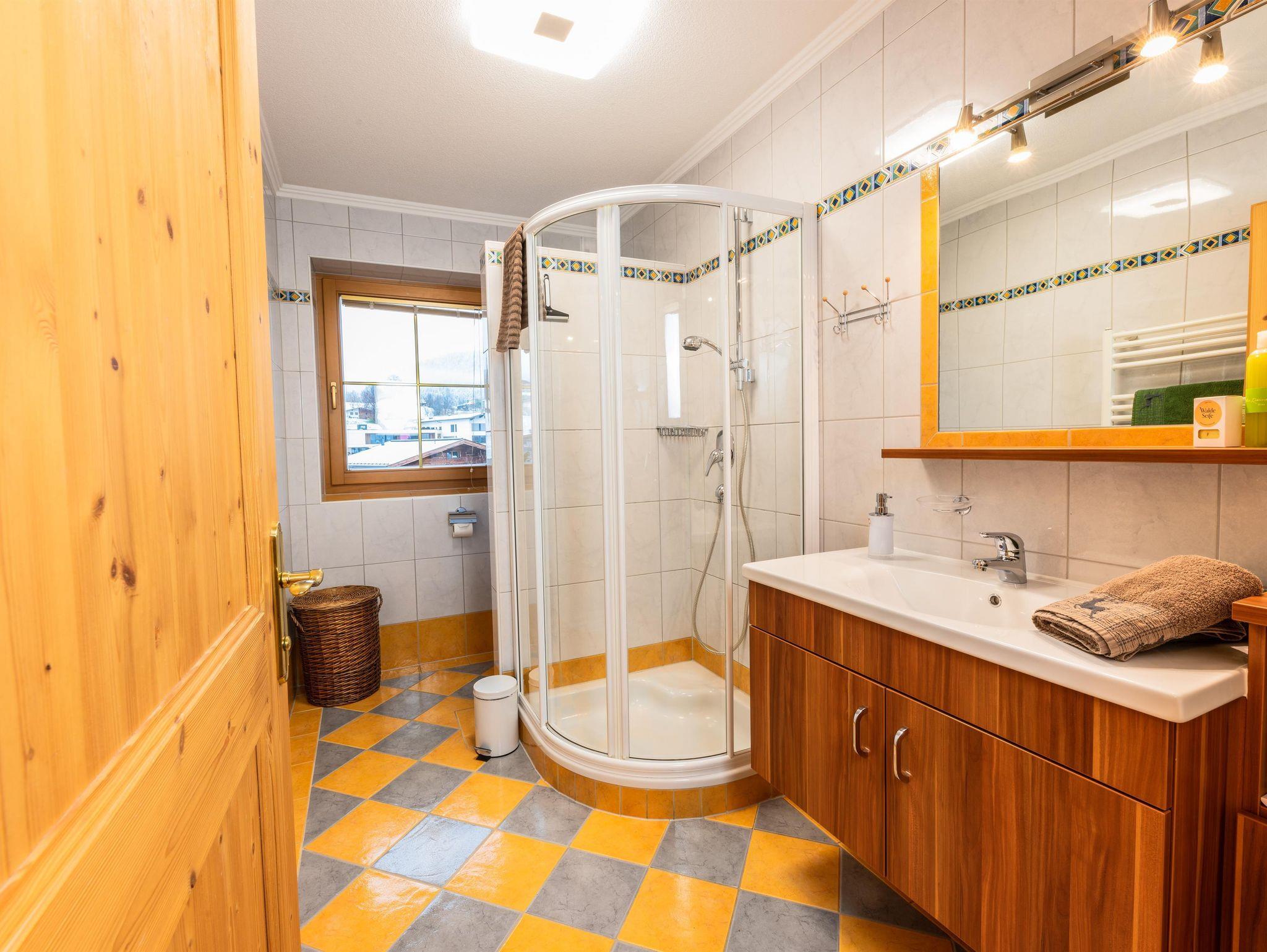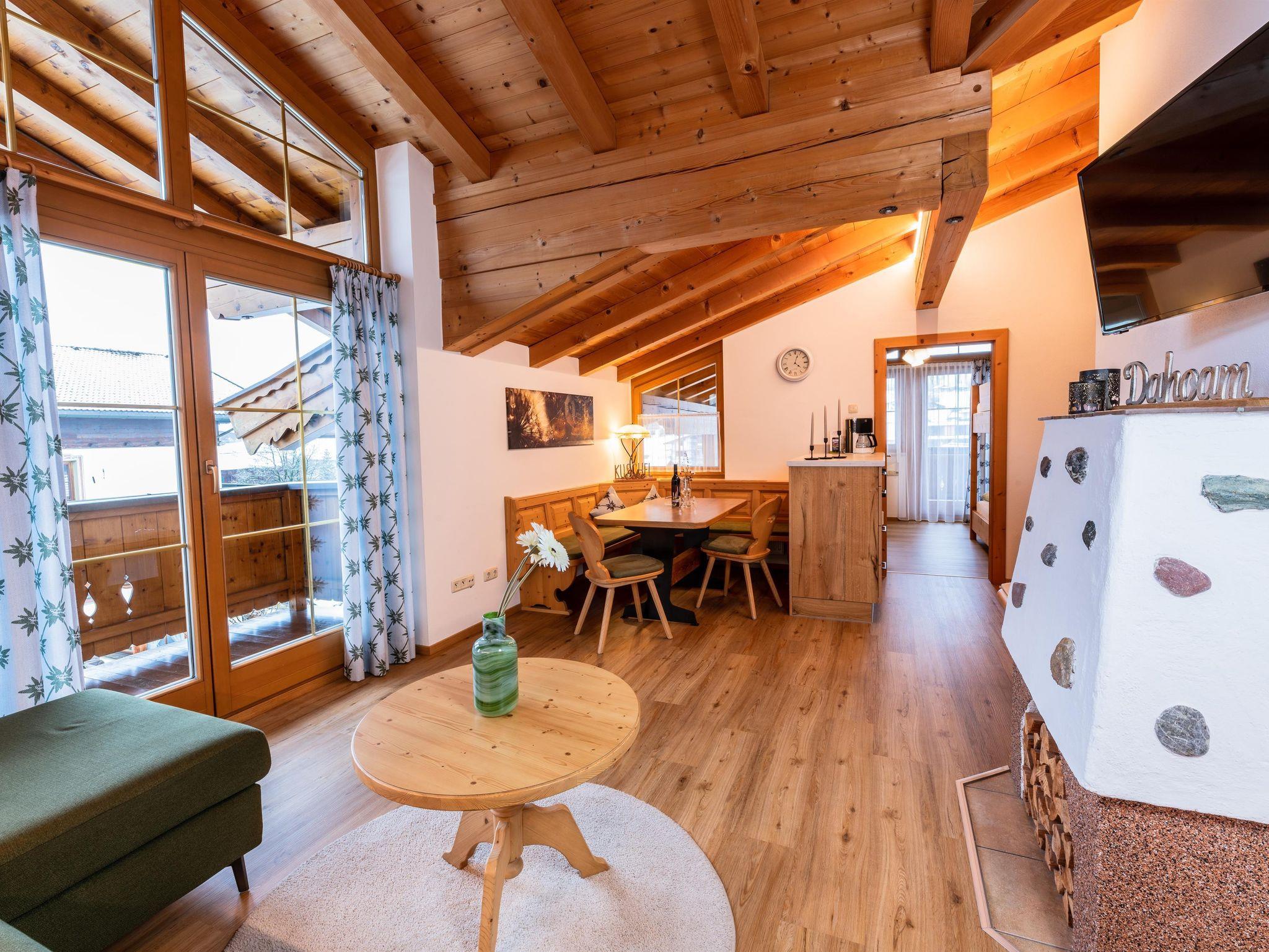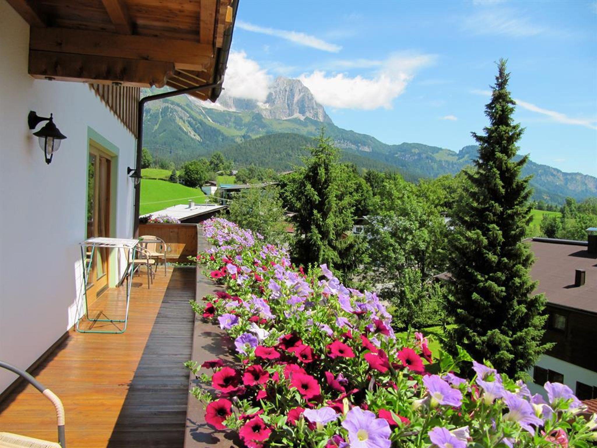 Das Apartment befindet sich im 1. Stock und ist im Tiroler Landhaus Stil eingerichtet. Vom großen umlaufenden möblierten Balkon aus, blicken Sie auf die umliegende wild romantische Bergwelt. Das Apartment bietet Ihnen ein gemütliches Schlafzimmer, einen Wohn- Schlafraum mit Kachelofen und voll ausgestatteter Küche, einem separatem Tageslicht Badezimmer. Von der Wohnküche aus haben Sie einen wunderschönen Blick auf den Wilden Kaiser.
