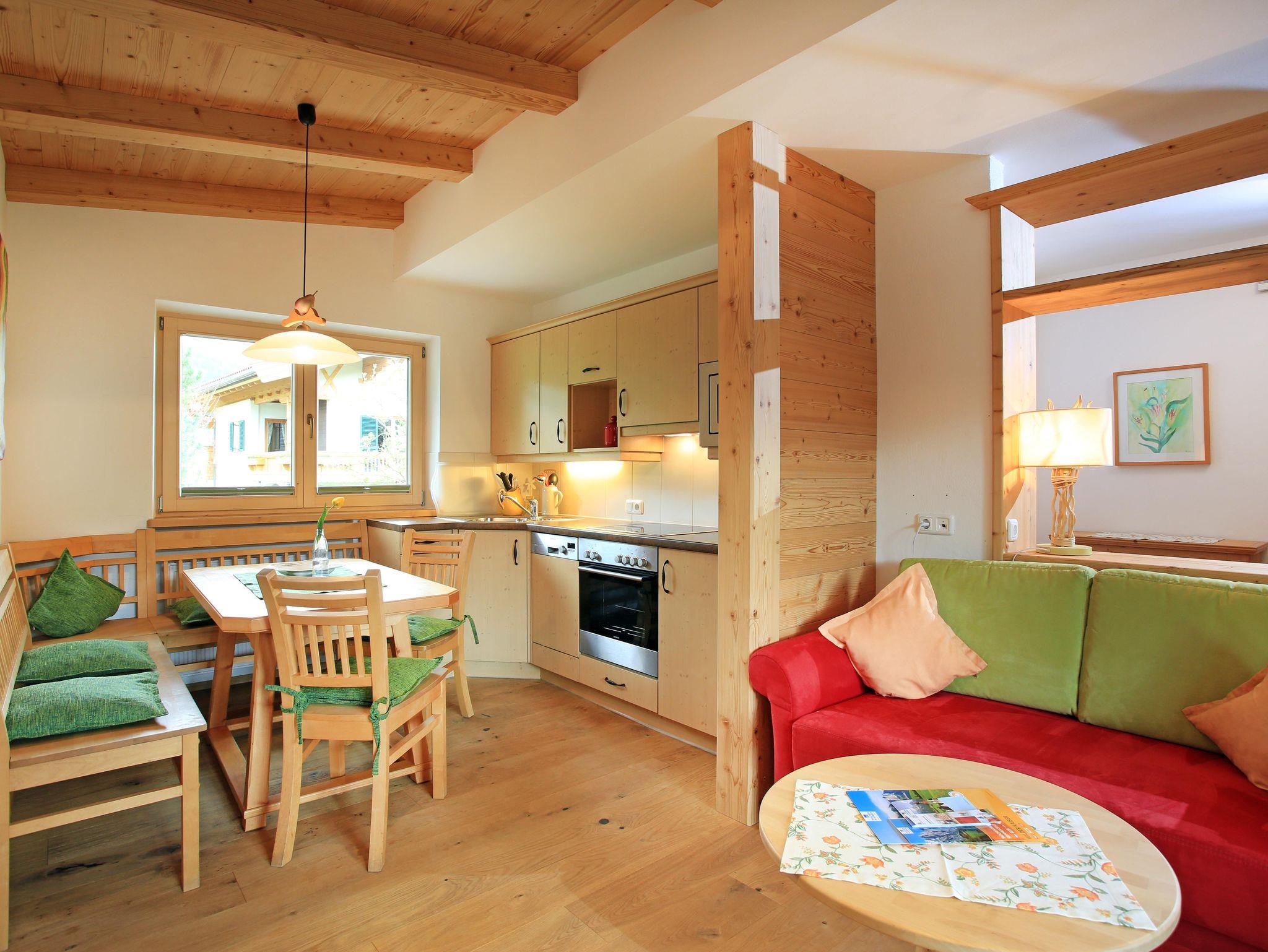 Unser Appartement „Berg“ mit 55 m² bietet Platz für bis zu 4 Personen und ist ausgestattet mit 2 Schlafzimmer und komplett Vollholzmöbel vom Goinger Tischler. Weiters verfügt die Wohnung über eine gemütliche vollausgestattete Wohnküche und ein großzügiges Badezimmer. Vom Balkon aus genießen sie die Aussicht auf den Wilden Kaiser und den Astberg.