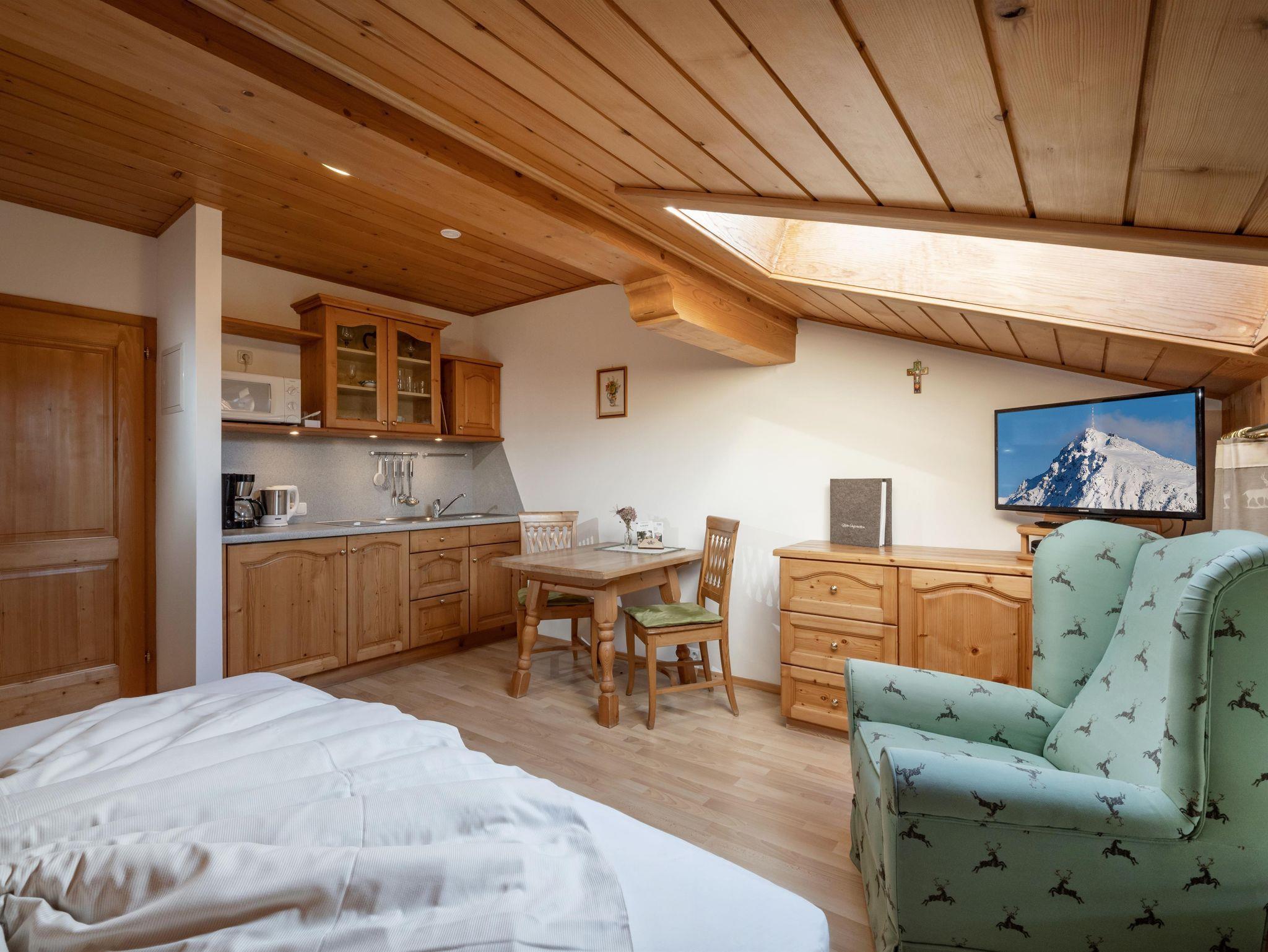 Unsere liebevoll eingerichtete Ferienwohnung im Tiroler Stil ist ausgelegt für 1-2 Personen und bietet einen Wohn-/Schlafraum mit Kochnische und Essecke, Doppelbett, Badezimmer mit Dusche/WC, SAT-TV und Radio.
