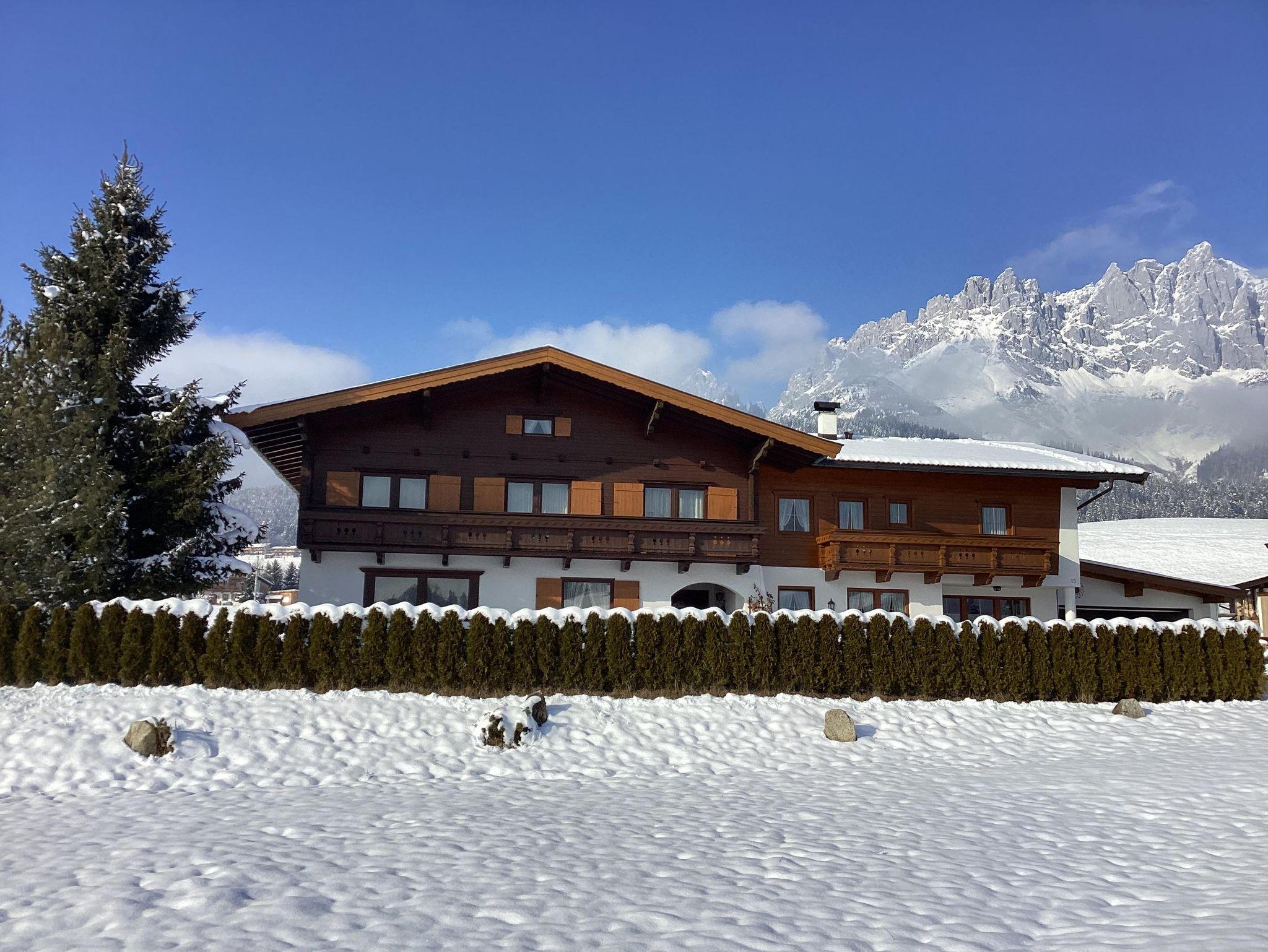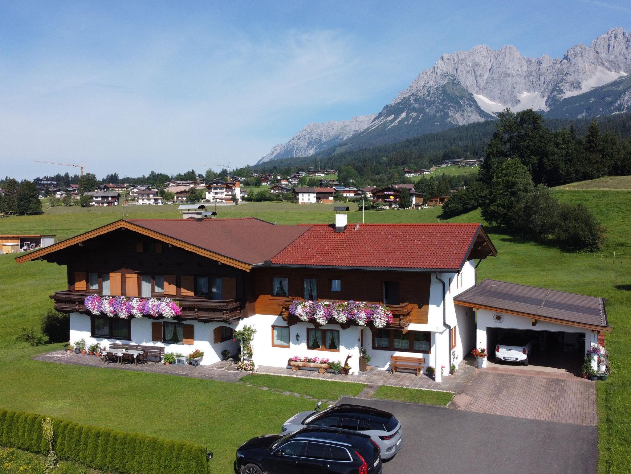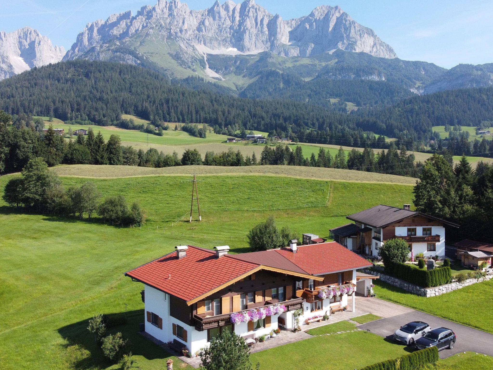 Gemütliche 85 m2 Ferienwohnung in schönem Privathaus. 2 Schlafzimmer mit Couch (3-Bett) und 2 DU/WC, Wohnzimmer mit Schlafmöglichkeit sowie separater Küche mit Geschirrspüler, alle Räume mit Balkon, ruhig u. sonnig gelegen, in der Nähe des Badesees. Unverbaute Sicht auf den Wilden Kaiser und auf das Kitzbühler Horn. Im Winter führt die Langlaufloipe direkt am Haus vorbei, Skibushaltestelle in unmittelbarer Nähe.