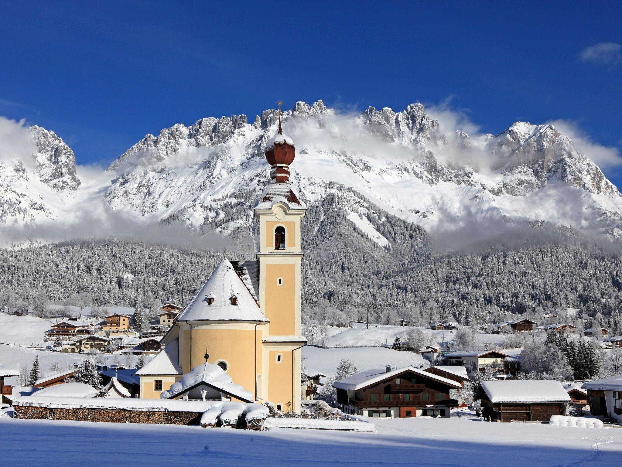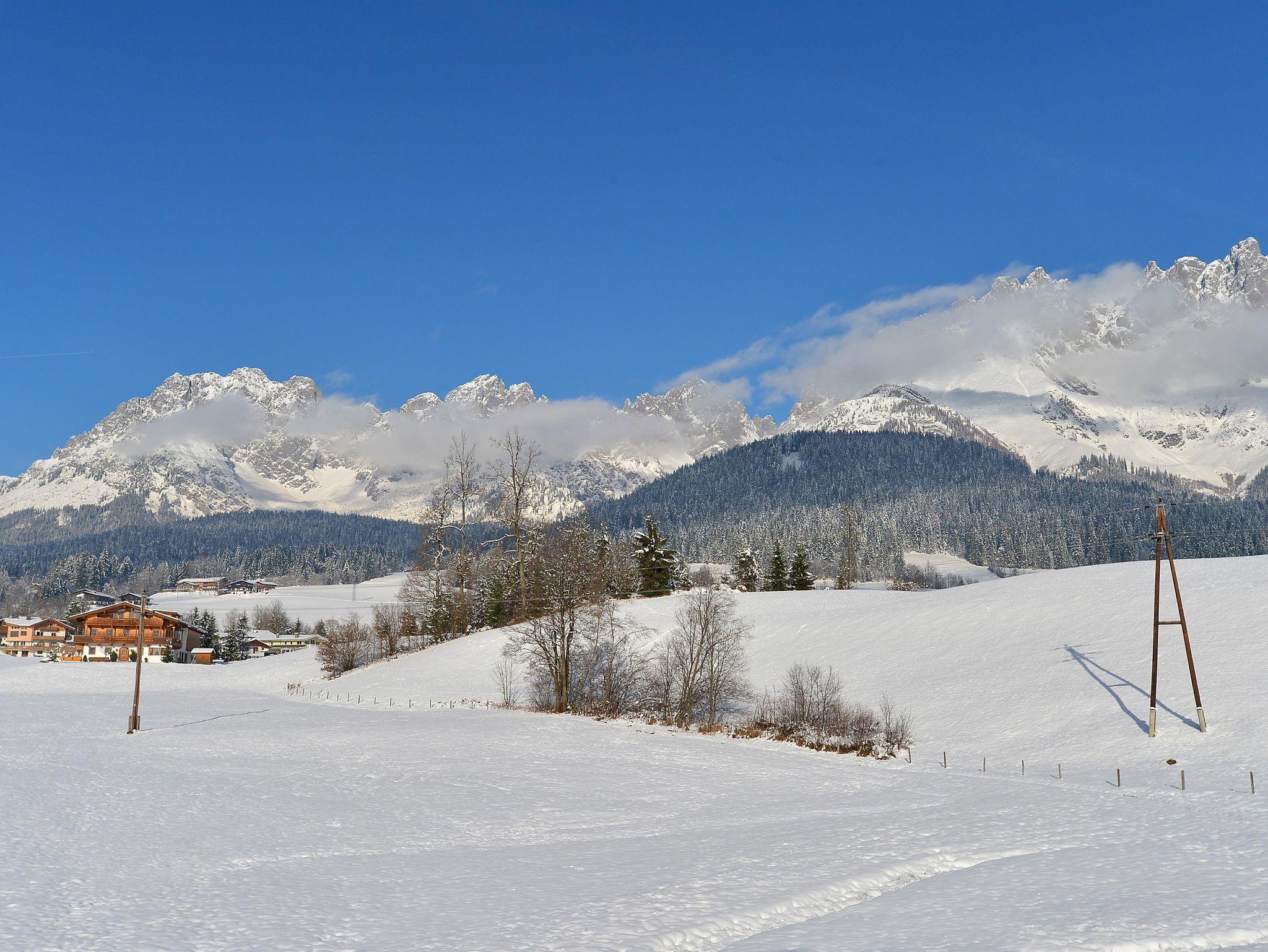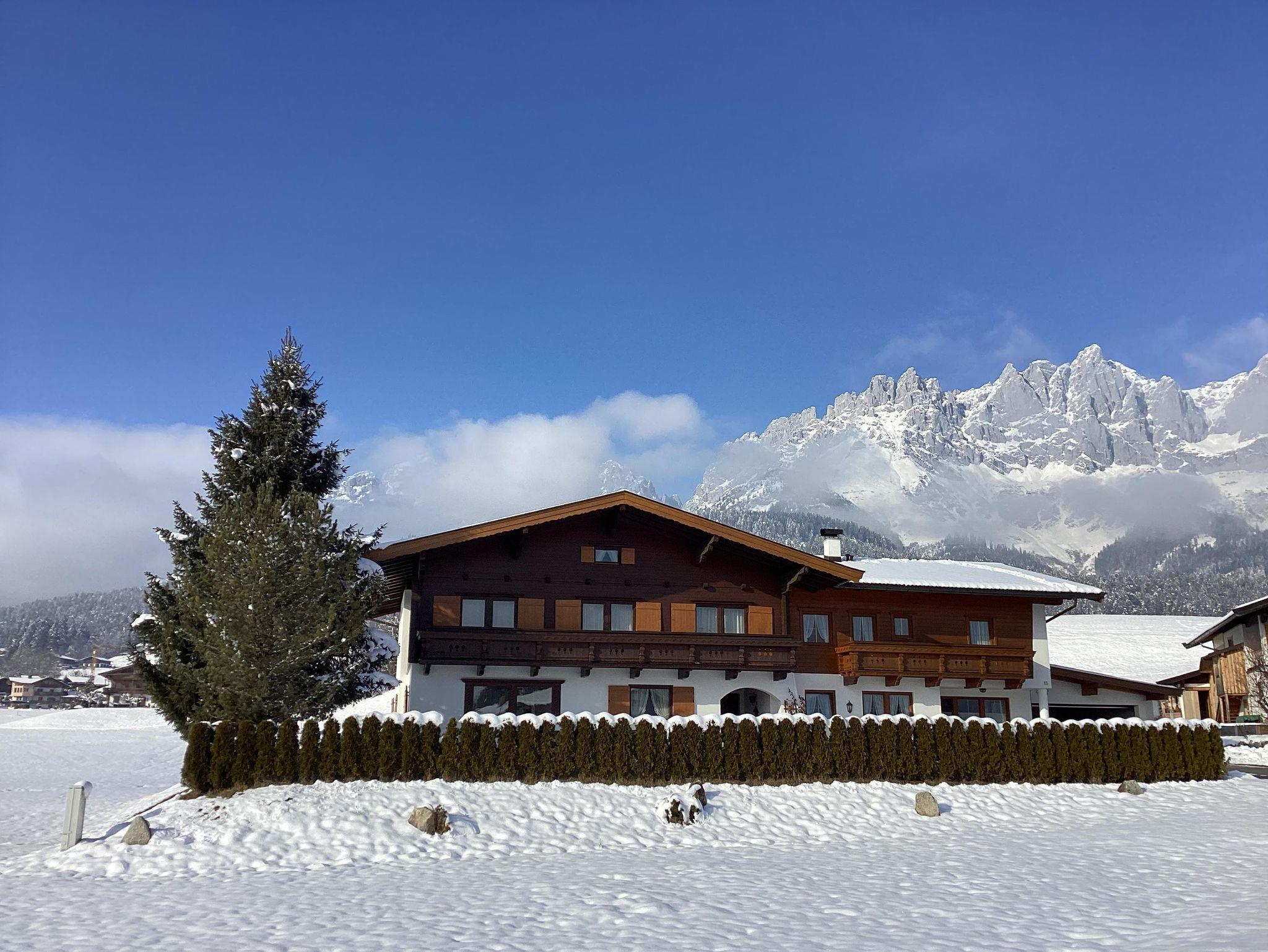 Gemütliche 85 m2 Ferienwohnung in schönem Privathaus. 2 Schlafzimmer mit Couch (3-Bett) und 2 DU/WC, Wohnzimmer mit Schlafmöglichkeit sowie separater Küche mit Geschirrspüler, alle Räume mit Balkon, ruhig u. sonnig gelegen, in der Nähe des Badesees. Unverbaute Sicht auf den Wilden Kaiser und auf das Kitzbühler Horn. Im Winter führt die Langlaufloipe direkt am Haus vorbei, Skibushaltestelle in unmittelbarer Nähe.