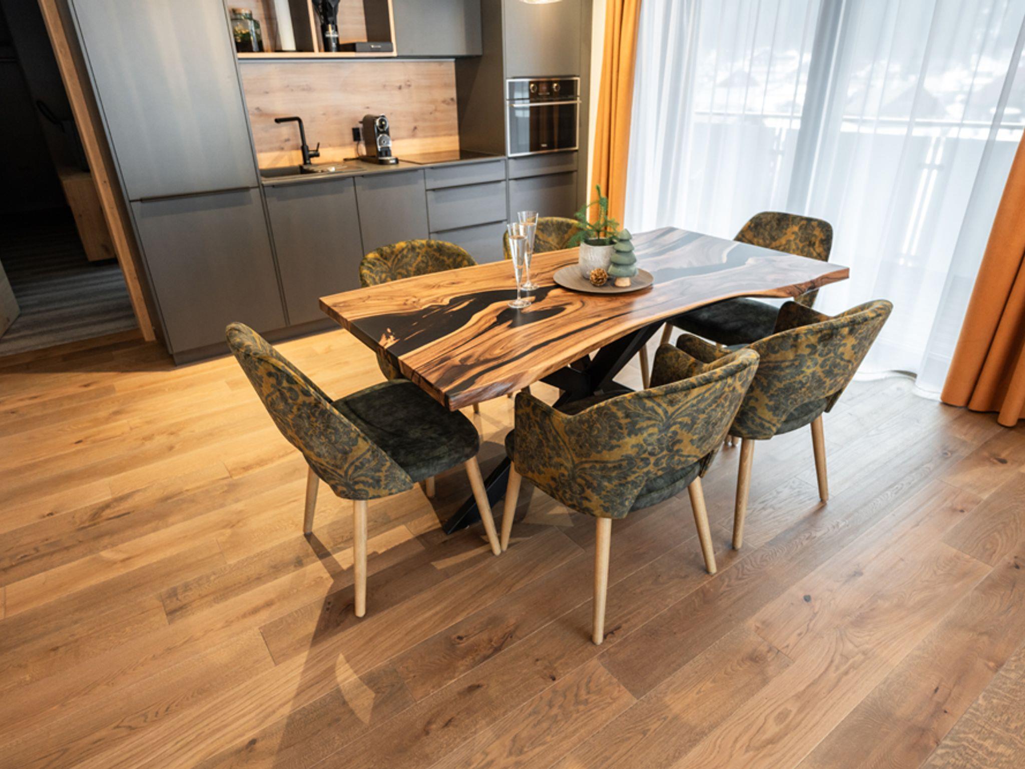 • Jedes Apartment umfasst einen kombinierten Wohn-Essbereich mit einem einladenden Essplatz sowie einer gemütlichen Schlafcouch zur Entspannung und TV-Nutzung.