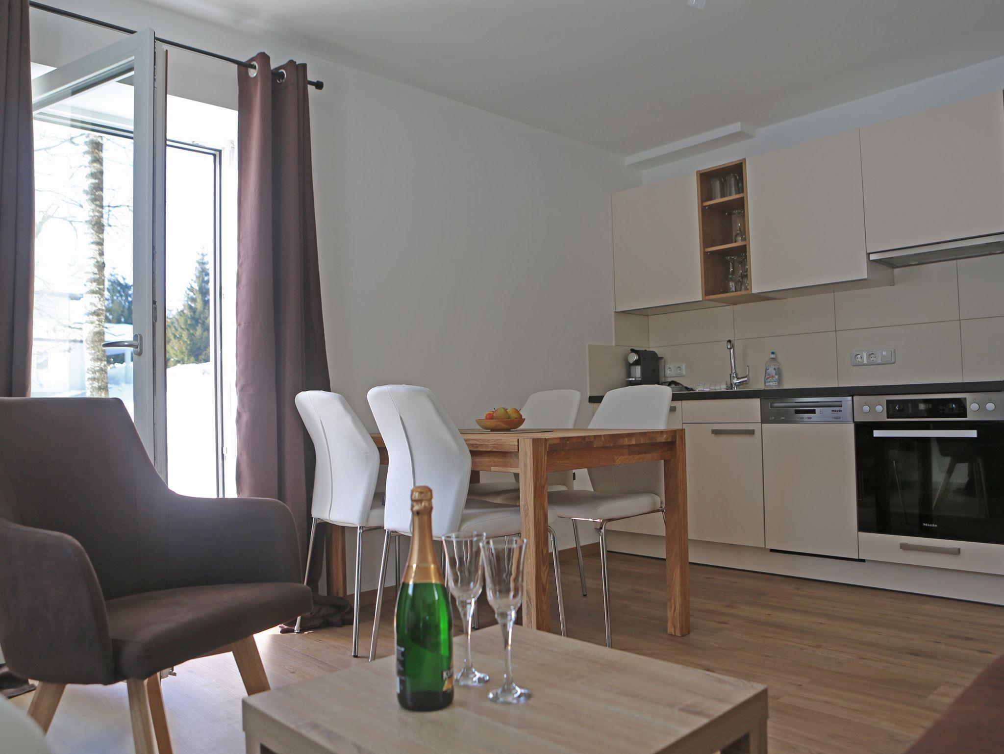 Sie verfügt über 2 Schlafzimmer mit je einem Doppelbett und einem Schrank bzw. Kasten. Im Wohnbereich finden sie eine kleine Sitzcouch, einen Eßbereich und eine Küchenzeile (Kühlschrank, Geschirrspüler, Backrohr, Ceran-Kochfeld, Wasserkocher, Nespresso Kaffeemaschine) vor.