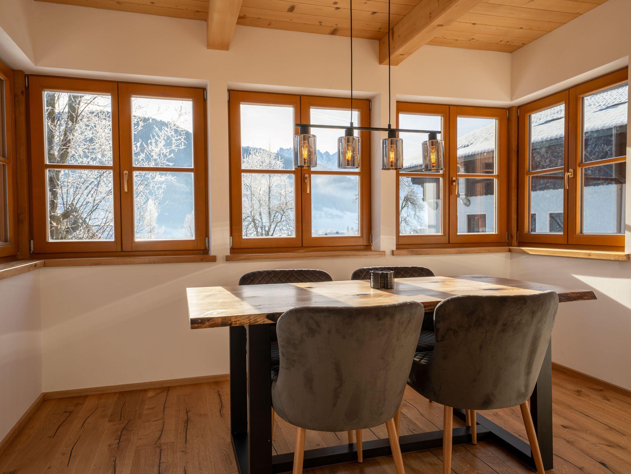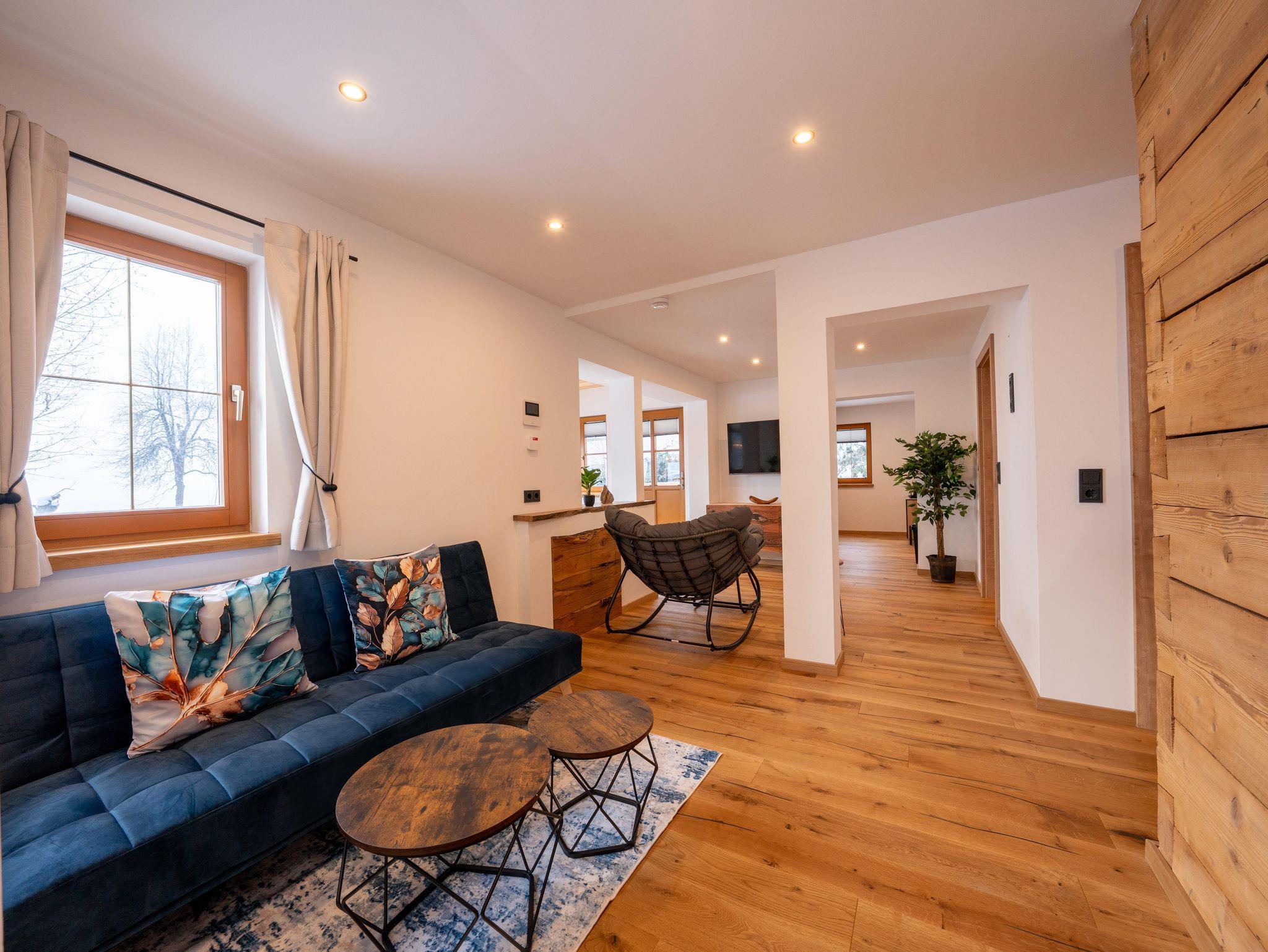 Die frisch renovierte Gosaukamm Suite verbindet modernes Design mit alpinem Flair. Auf 71 m² bietet sie Platz für bis zu 4 Personen in zwei Schlafzimmern mit Doppelbetten. Die Suite verfügt über ein voll ausgestattetes Badezimmer mit Dusche und Badewanne, eine moderne Küche sowie ein gemütliches Wohn- und Esszimmer. Sie bietet einen herrlichen Blick auf Berge, Wald und Wiesen sowie Zugang zum Gemeinschaftsgarten. Fußbodenheizung und ein eigener Skischuhtrockner im Eingangsbereich runden die Ausstattung ab.